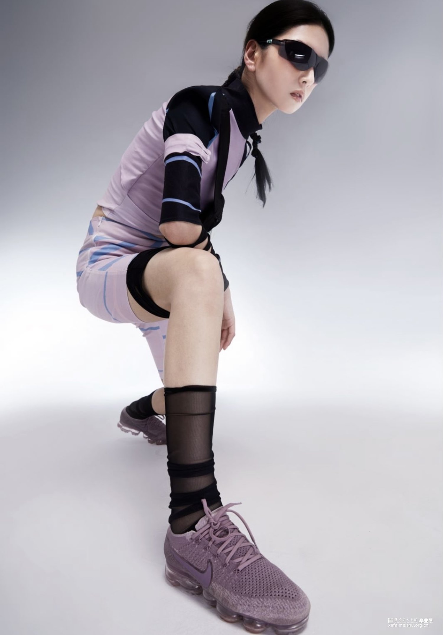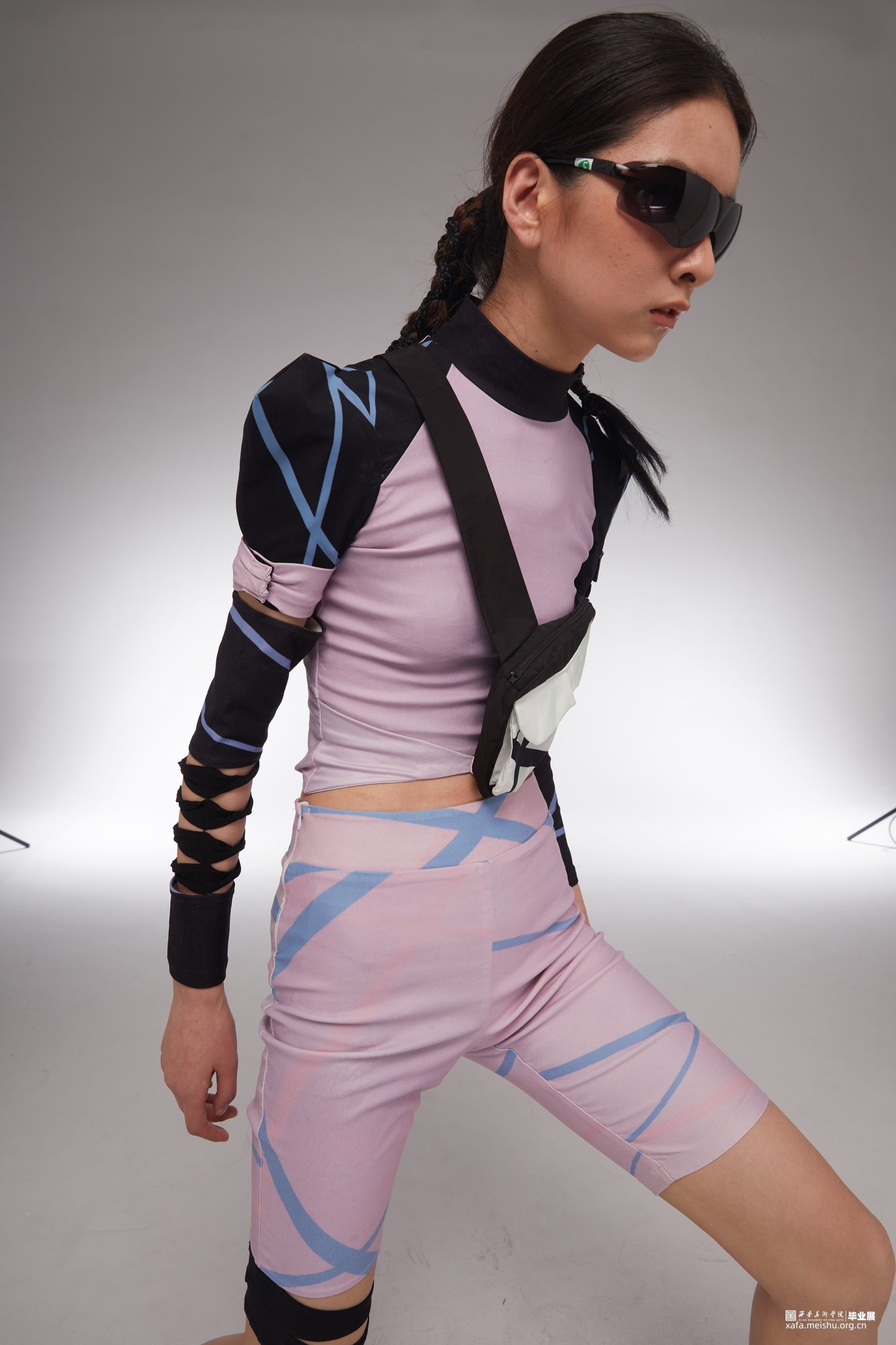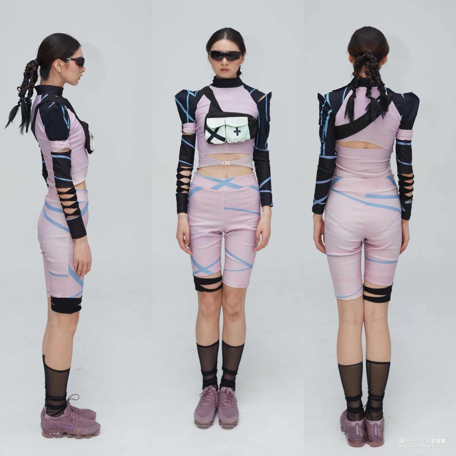 本系列三套作品颜色采用了2022年流行色紫色、绿色以及黑白基础色。整个系列意在设计出一个符合当下时尚潮流,满足当代都市骑行人民通勤场合与运动场合都能穿的都市骑行服,从而体现出服装实用和艺术的魅力,展示现代都市城市氛围下的运动风格,以现代运动服饰为载体,体现独有的中国都市文化。