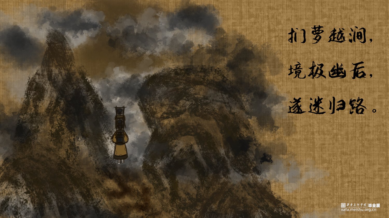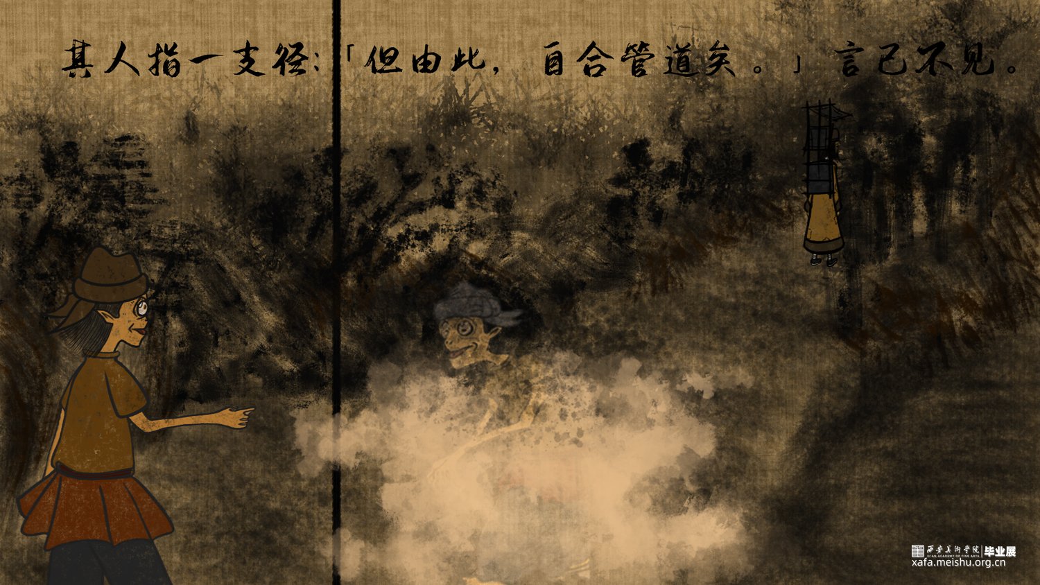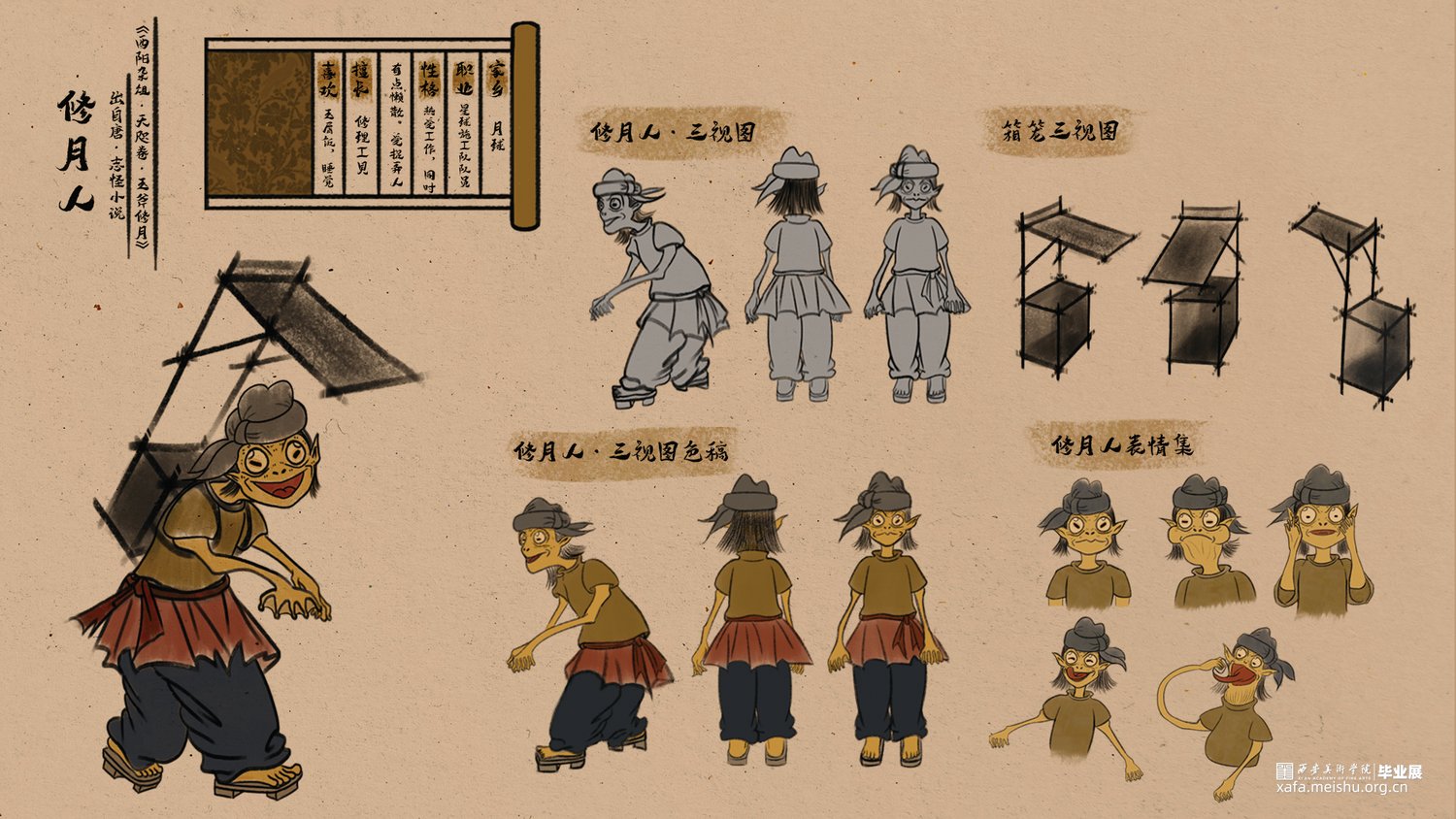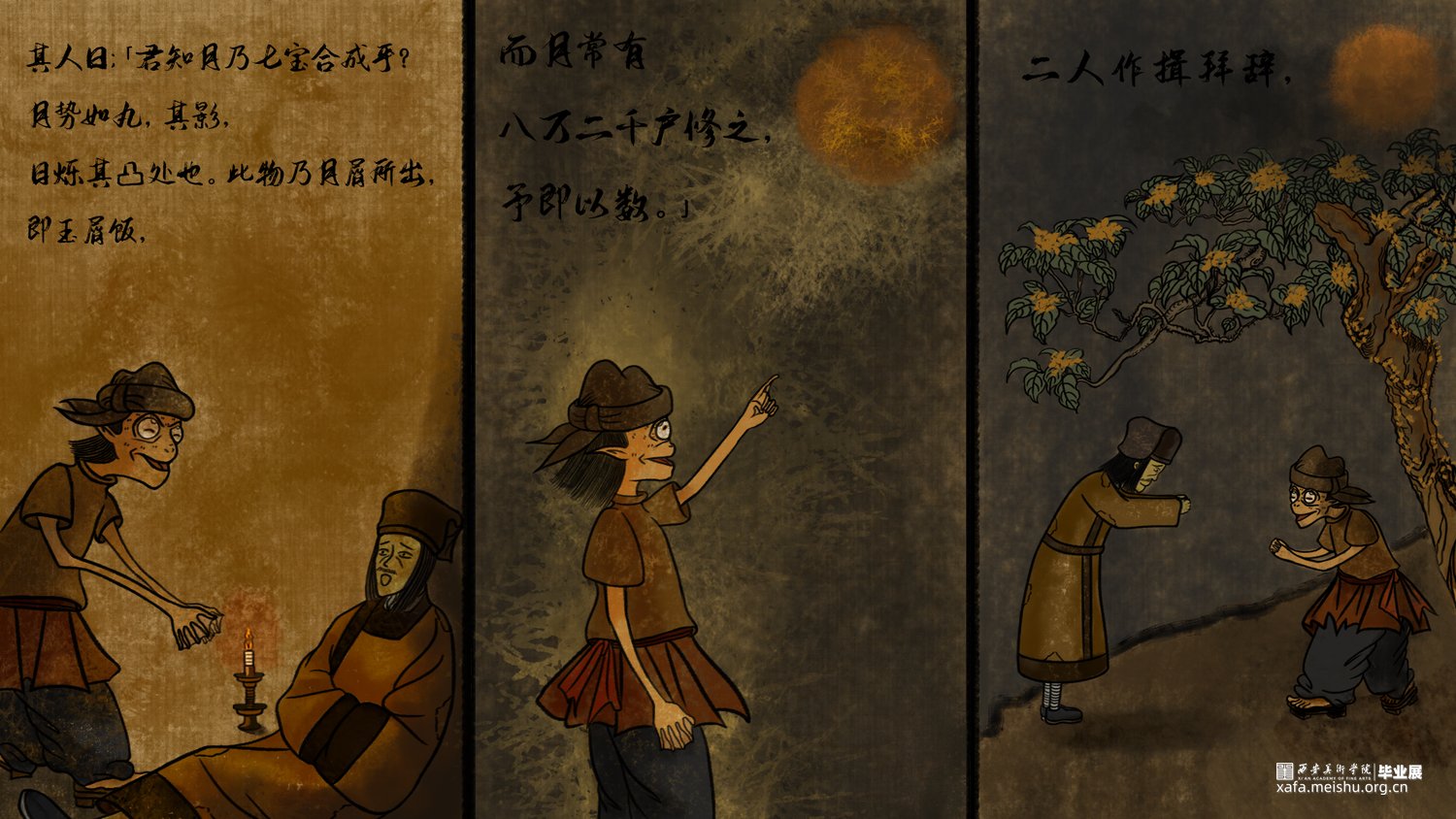 该短篇幅文字插画改编自唐代段成式创作的笔记小说集《酉阳杂俎》其中天咫卷中的玉斧修月篇,讲述了唐代大和年间,穷苦劳碌的王秀才为赶考途经嵩山,但入山之后迷失方向后,与来自月球的修月人相遇并产生交际的奇遇故事。尝试模仿并采用古代中国画的形式特点去绘制这篇短小的故事,个人创作时能感受到唐代文人对于月亮的浪漫想象以及渴望与地外文明产生交际的情感表达。初次尝试以文言文作为故事叙述的文本的形式采用图文结合的方式创作了此次短篇幅的文字插画;个人创作时尝试结合中国画的画幅形式与漫画分镜语言相结合的方式尽量完整的讲述这篇节奏较快的短篇幅文字插画作品。试图贴合故事时代背景的同时又能体现个人对形式创新的尝试。