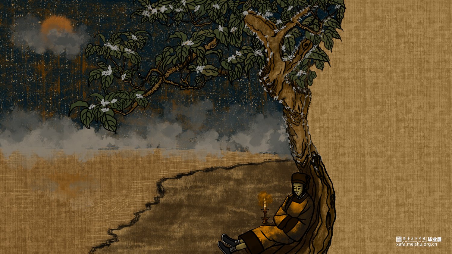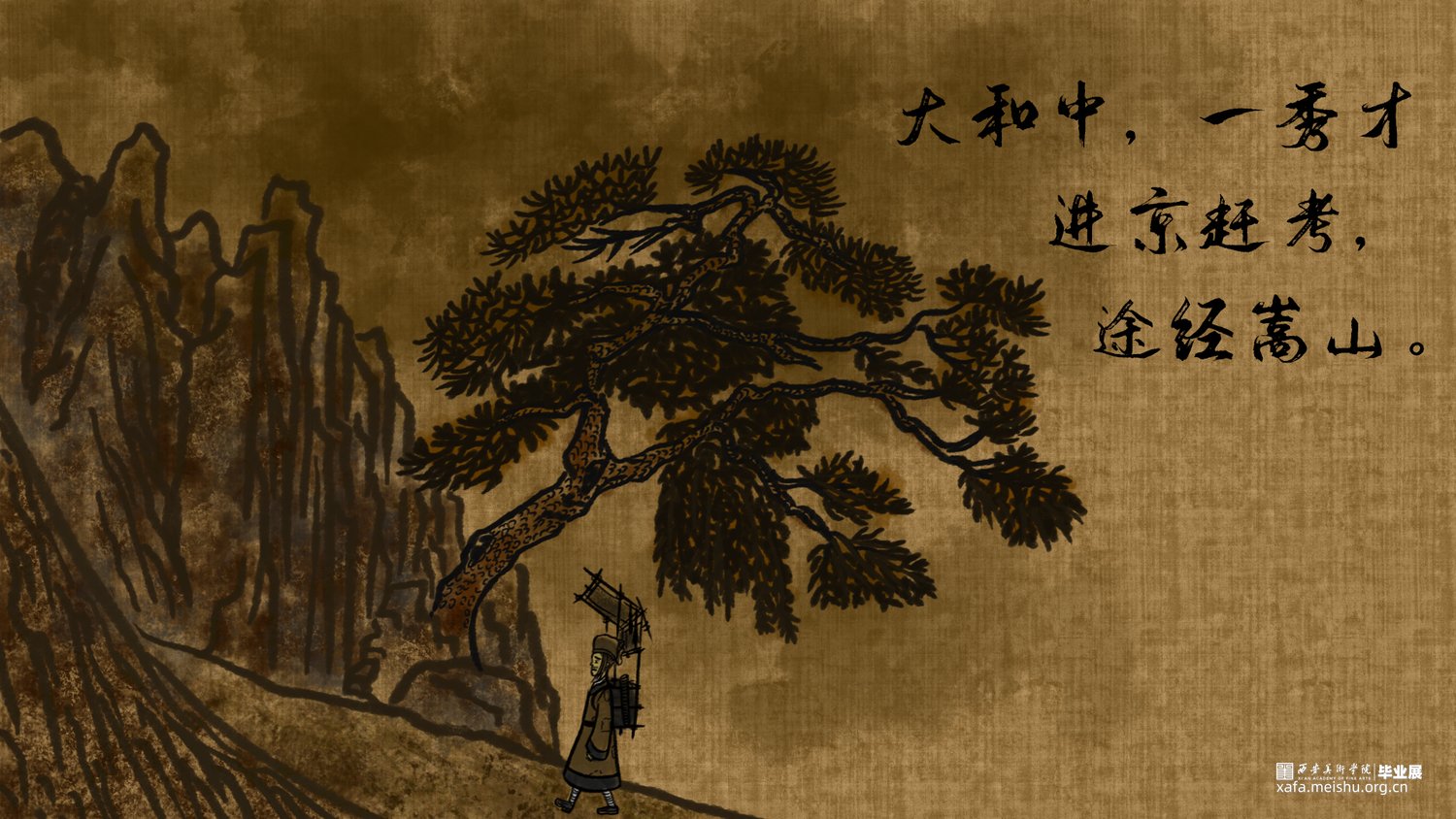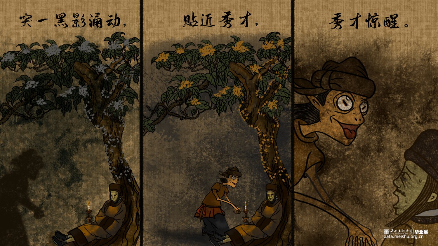 该短篇幅文字插画改编自唐代段成式创作的笔记小说集《酉阳杂俎》其中天咫卷中的玉斧修月篇,讲述了唐代大和年间,穷苦劳碌的王秀才为赶考途经嵩山,但入山之后迷失方向后,与来自月球的修月人相遇并产生交际的奇遇故事。尝试模仿并采用古代中国画的形式特点去绘制这篇短小的故事,个人创作时能感受到唐代文人对于月亮的浪漫想象以及渴望与地外文明产生交际的情感表达。初次尝试以文言文作为故事叙述的文本的形式采用图文结合的方式创作了此次短篇幅的文字插画;个人创作时尝试结合中国画的画幅形式与漫画分镜语言相结合的方式尽量完整的讲述这篇节奏较快的短篇幅文字插画作品。试图贴合故事时代背景的同时又能体现个人对形式创新的尝试。