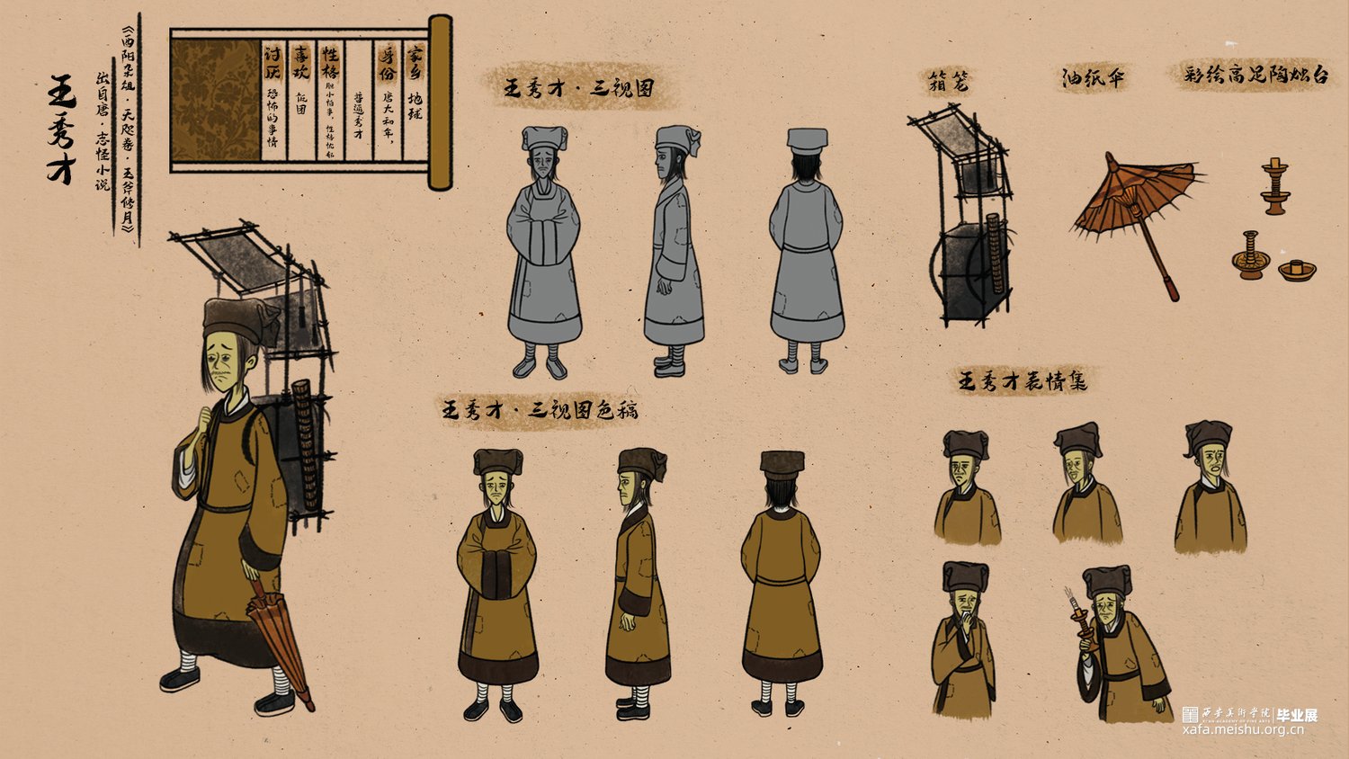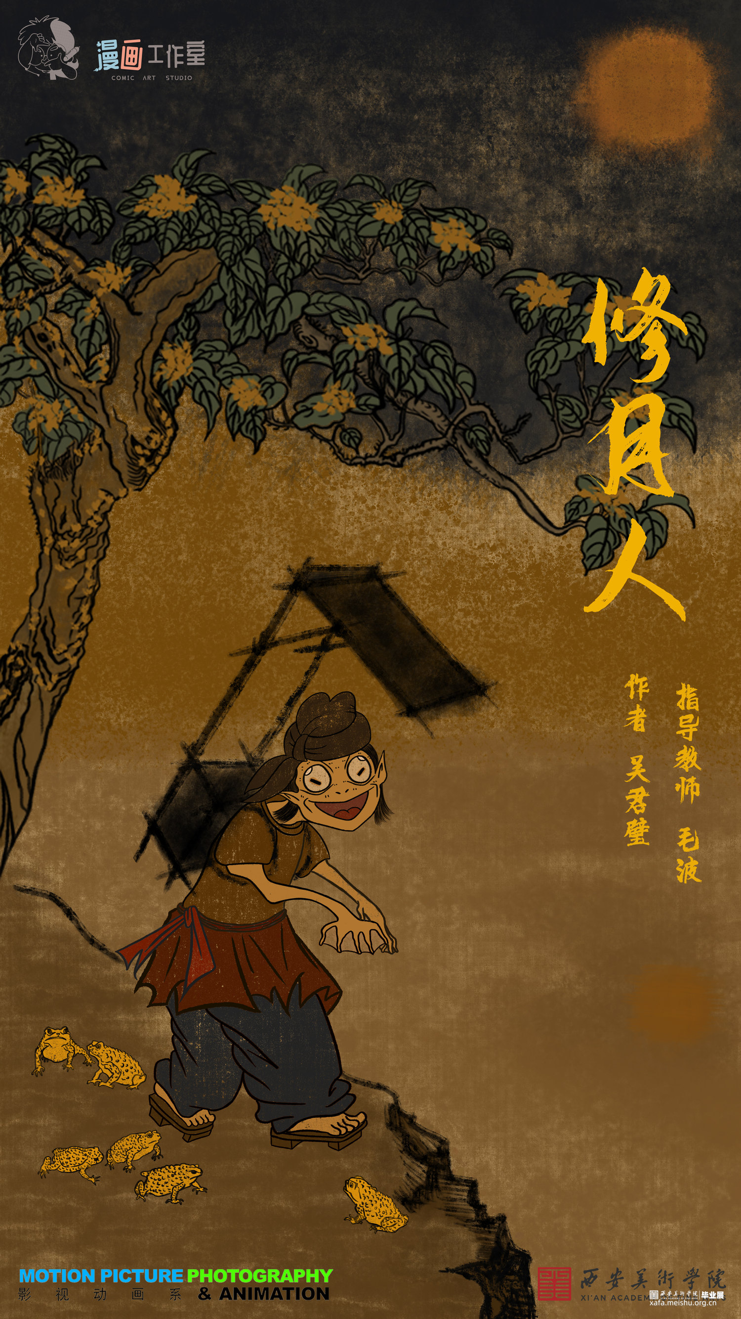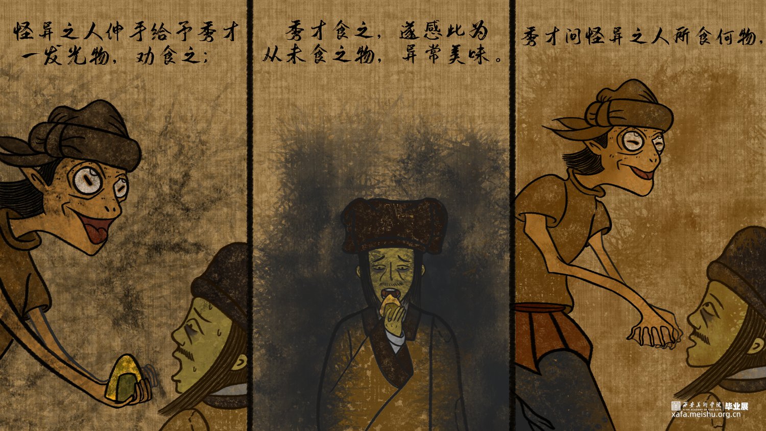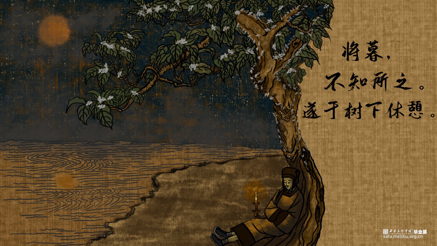 该短篇幅文字插画改编自唐代段成式创作的笔记小说集《酉阳杂俎》其中天咫卷中的玉斧修月篇,讲述了唐代大和年间,穷苦劳碌的王秀才为赶考途经嵩山,但入山之后迷失方向后,与来自月球的修月人相遇并产生交际的奇遇故事。尝试模仿并采用古代中国画的形式特点去绘制这篇短小的故事,个人创作时能感受到唐代文人对于月亮的浪漫想象以及渴望与地外文明产生交际的情感表达。初次尝试以文言文作为故事叙述的文本的形式采用图文结合的方式创作了此次短篇幅的文字插画;个人创作时尝试结合中国画的画幅形式与漫画分镜语言相结合的方式尽量完整的讲述这篇节奏较快的短篇幅文字插画作品。试图贴合故事时代背景的同时又能体现个人对形式创新的尝试。