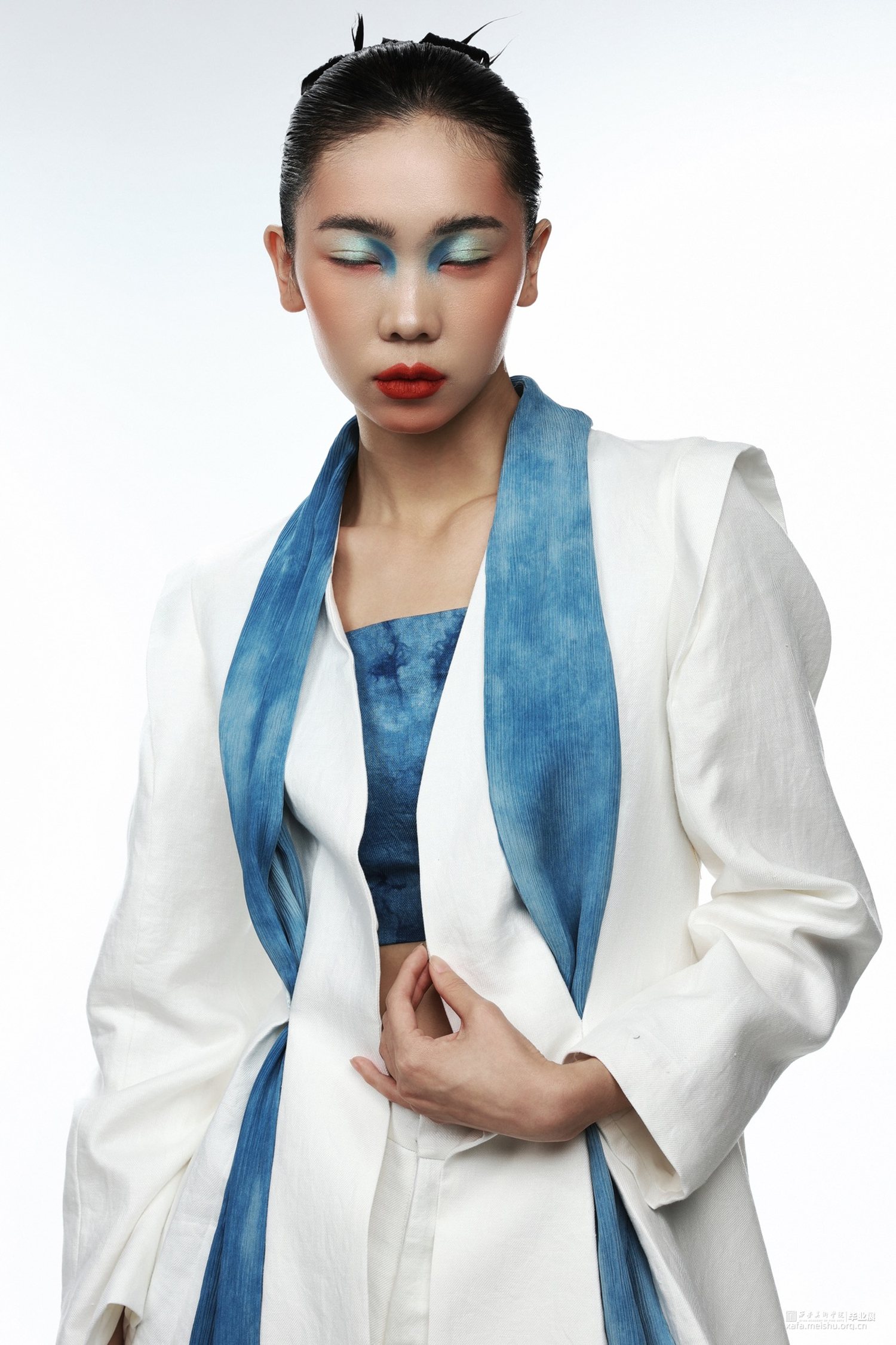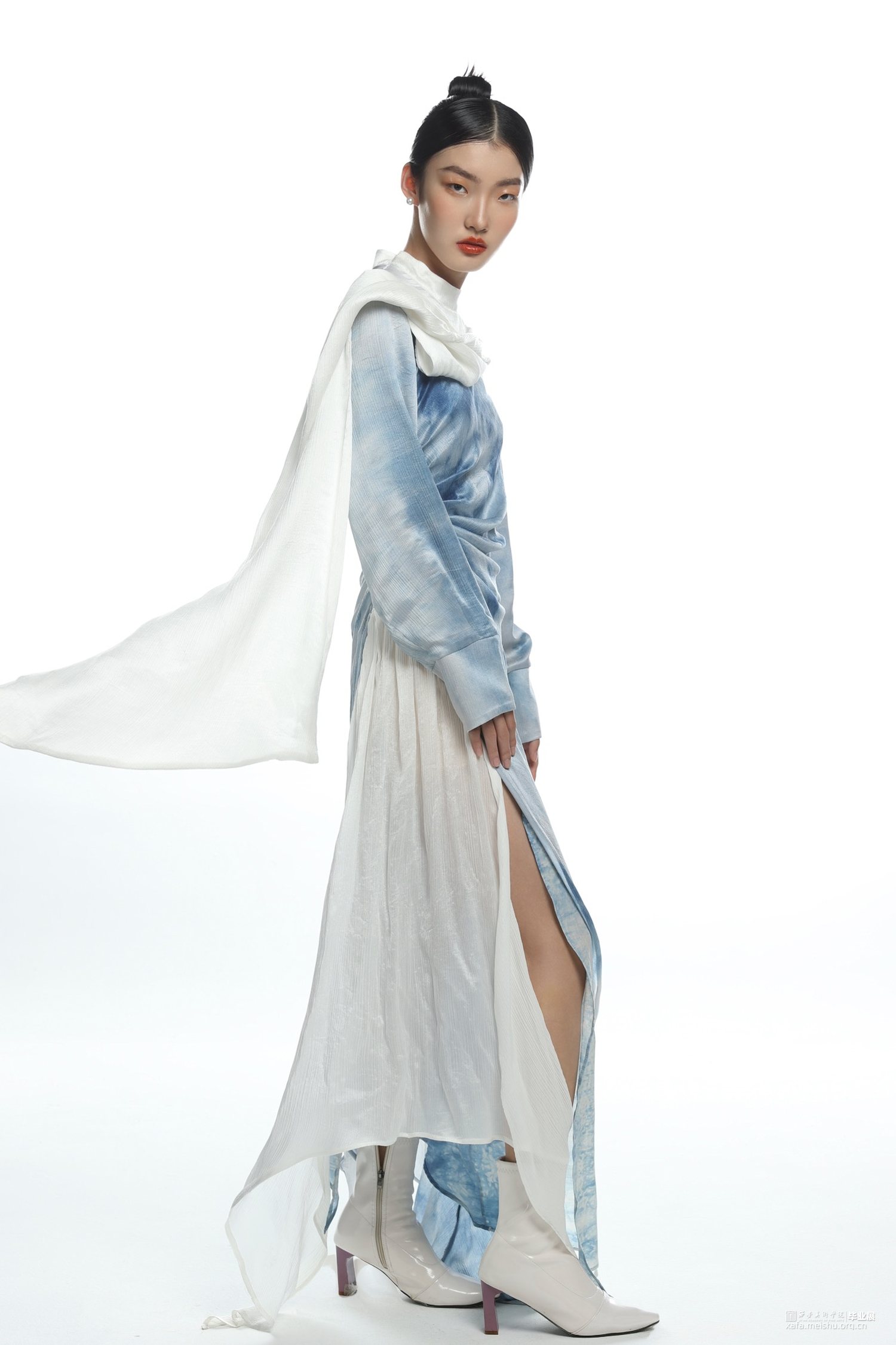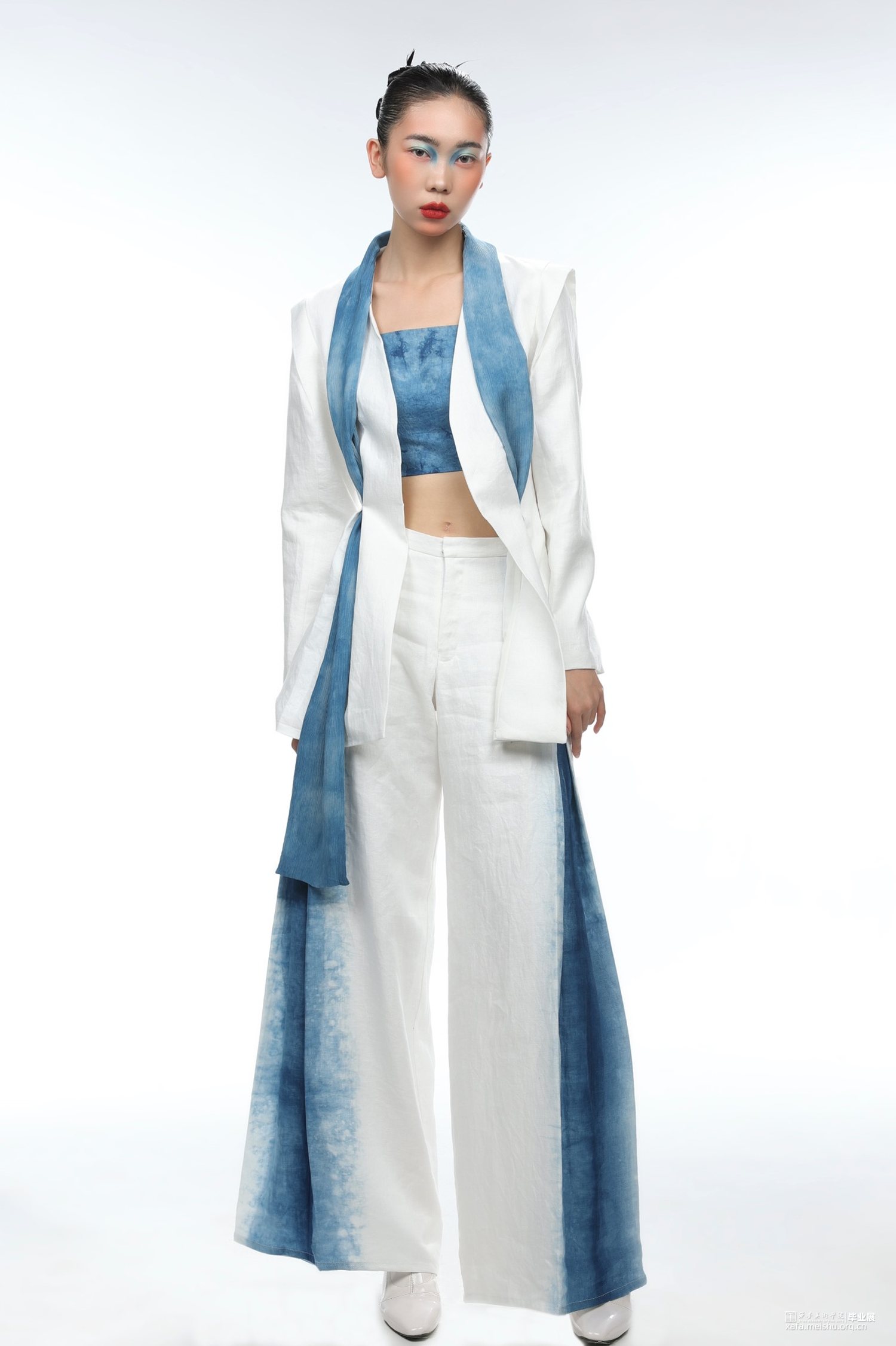 设计基本构思:采用干净利落的廓型设计,不对称的服装形态,加以垂荡摆较等工艺,融合历经岁月沉淀的蓝染面料,充分展现出女性的生动自由与优雅格调,在领部、腰部等处增加设计细节,使穿着者在严谨中透出一丝灵动俏皮,进一步强调女性多样的性格魅力。面料选用天然面料,采用蓝染技法进行手工印染,体现出设计匠心。将晕染面料的图案巧妙融合进服装结构设计中,面料与结构二者相铺相成,充满女性天然的恬静淡然气息。