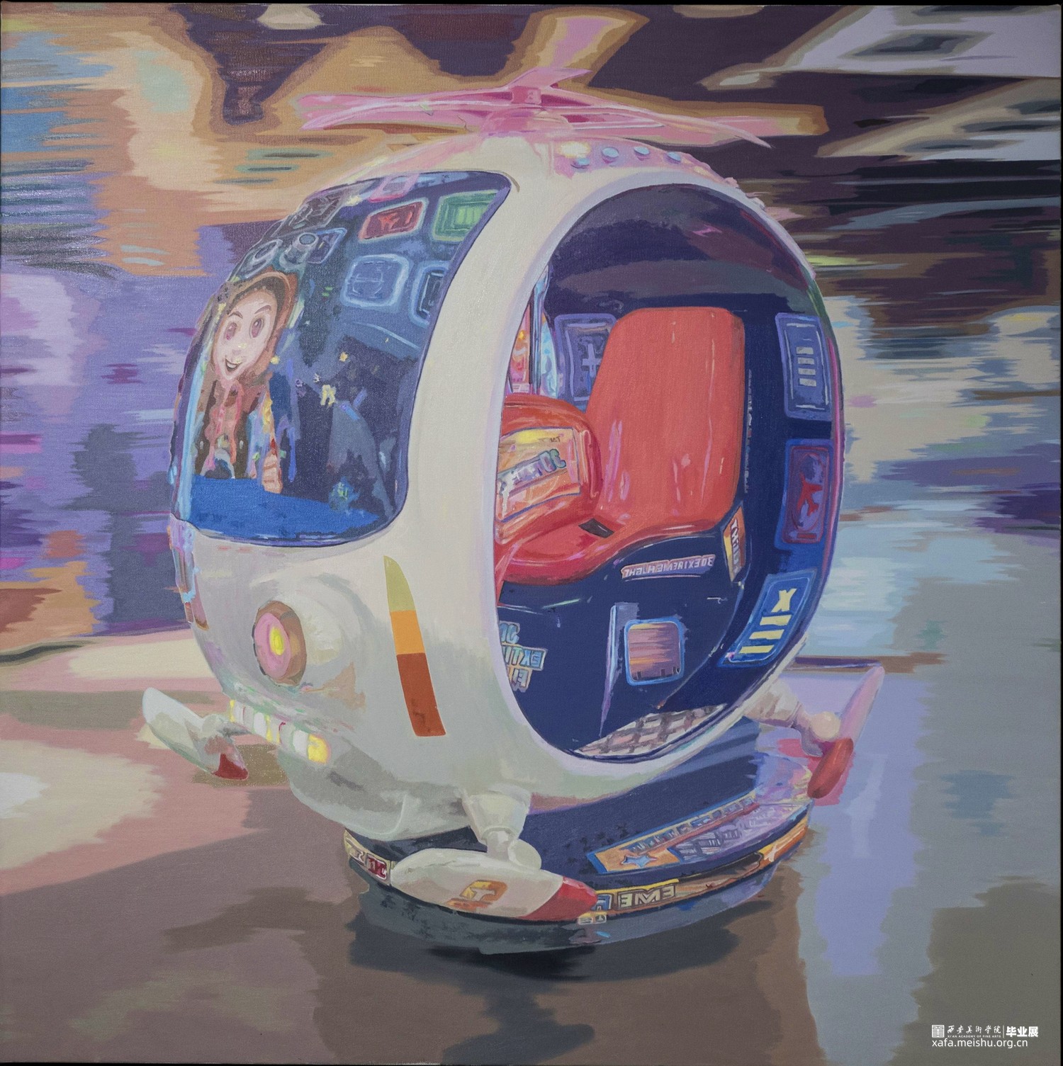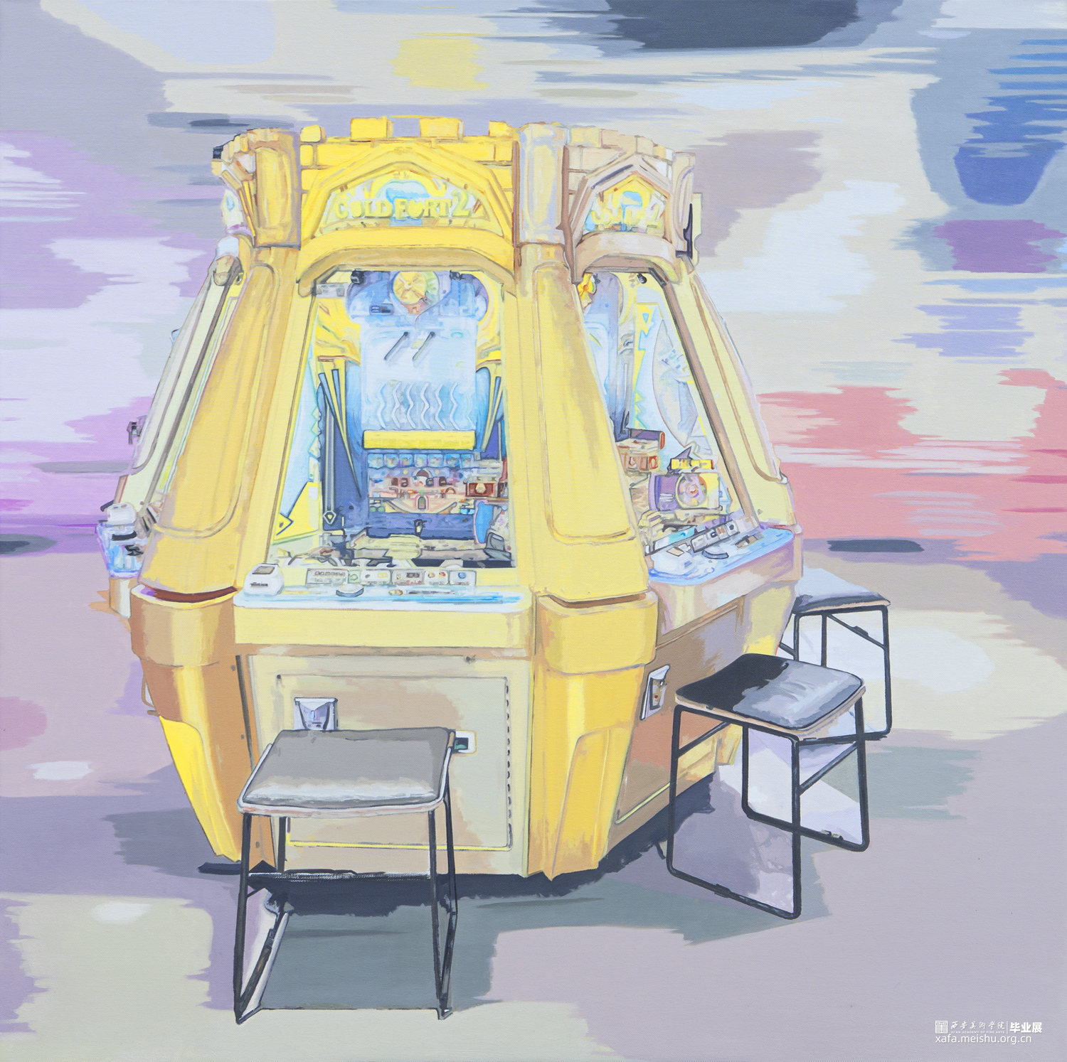 这幅画的主题是幻回童年。是无意间走进商场儿童专区,被里面的色彩与灯光所吸引,引发了很多儿时跟伙伴们在游戏厅里玩耍回忆,运用平面绘画与梦幻的色彩来达到主题的视觉效果