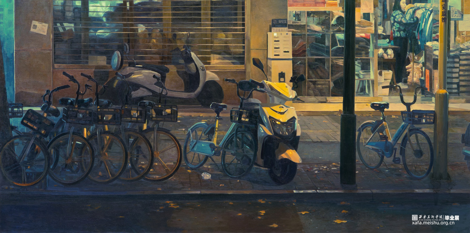 这张作品是我在2022年11月刚考完教资坐在因堵车停下的大巴车上往窗外拍的。当时正是疫情严峻的时候,学校封控,许多店铺也因疫情影响无奈放弃营业。当我看到在周围暗下灯光的店铺,这家还在营业时,我突然想到让人望不到尽头的新冠病毒,我们还是有希望战胜的。如今我们也渐渐地回归正常的生活,画面中右上角残缺的二维码也象征着我们即将战胜疫情。拍这个素材当天下过雨, 雨打风吹后的街区上散漫着树叶和生活垃圾,雨后的冲洗,物体渐渐从灰尘中露出它原本的颜色。一切是否真正的回归正常生活我不太清楚,但我知道雨停了它依旧会下,雨后是不是能见彩虹我也不清楚,但我知道这就是生活的常态,我能做的就是以平常的心态去感受它、接纳它。