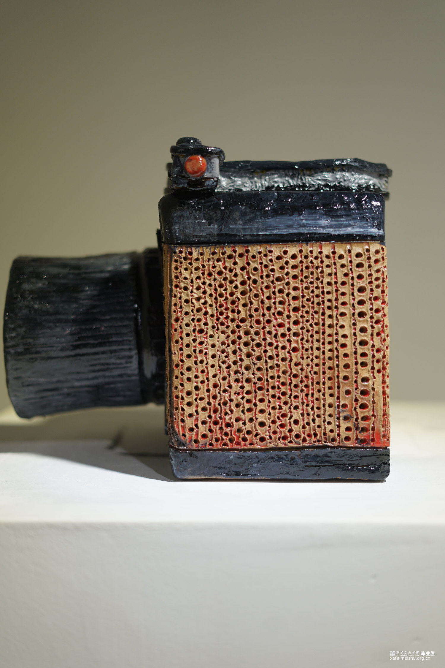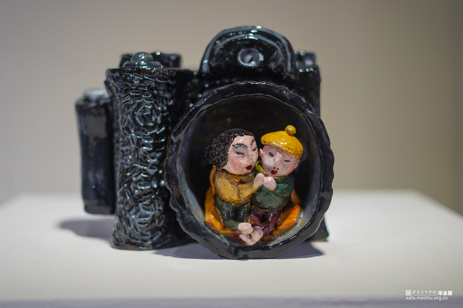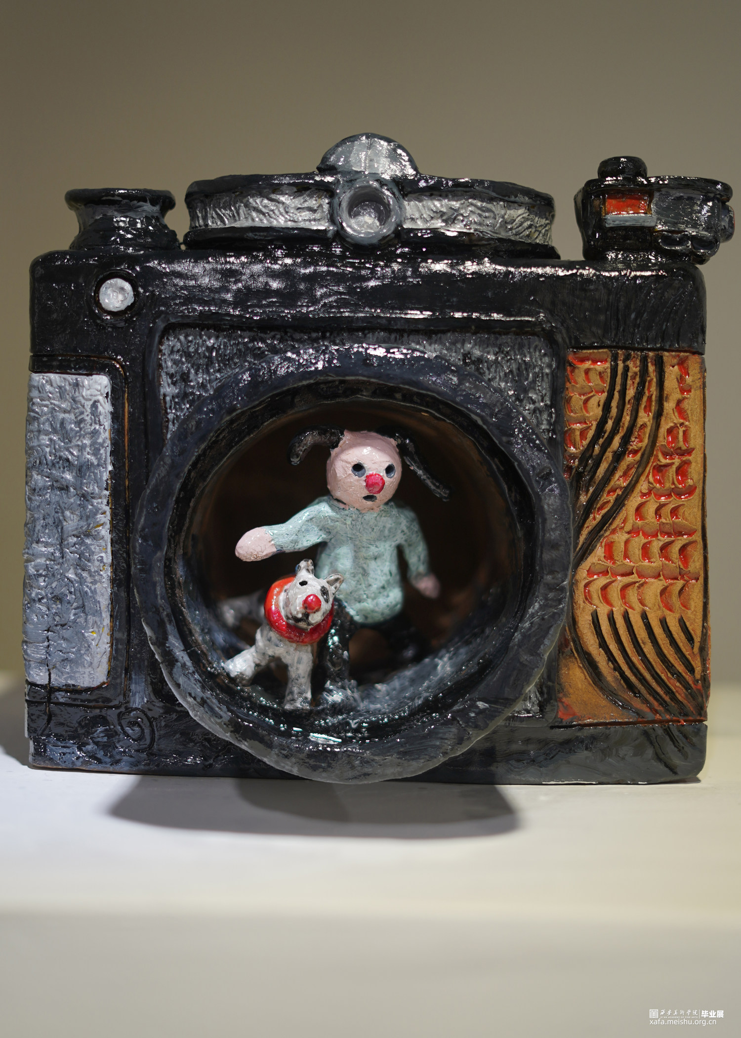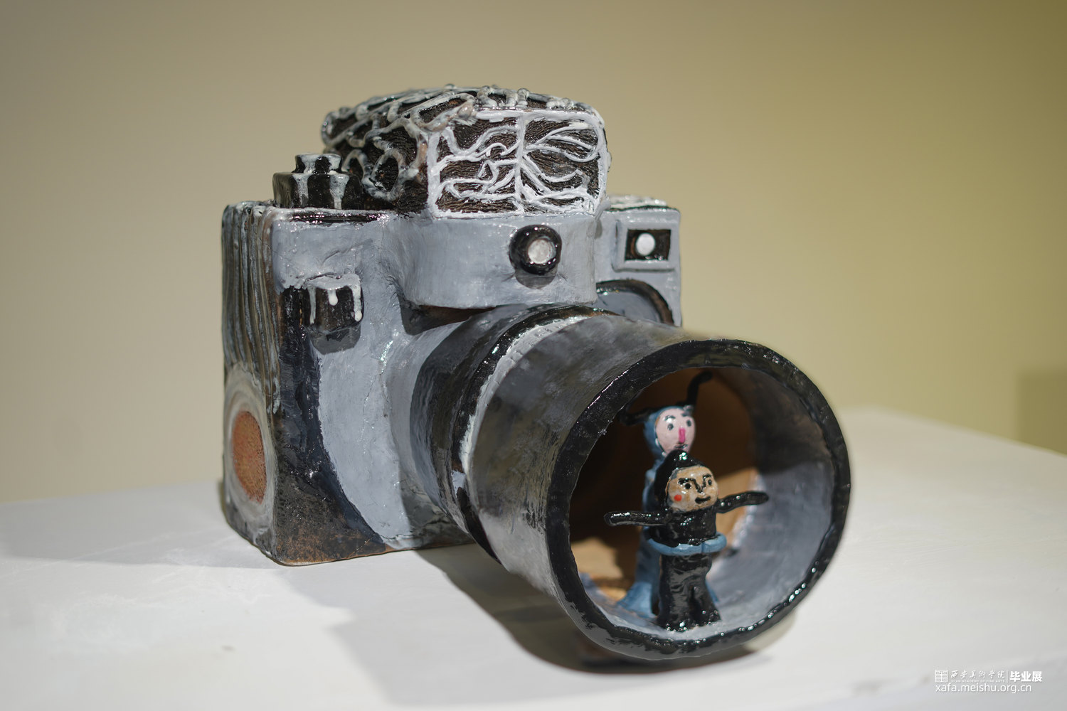 本作品以“相机”为主题,用陶艺手法将相机留存的瞬间完美展现。通过陶泥刻画人物形象在相机显示器中的形象,将艺术与日常生活巧妙地结合在一起,希望在这个快节奏的时代唤醒人们对于美好瞬间的回忆。