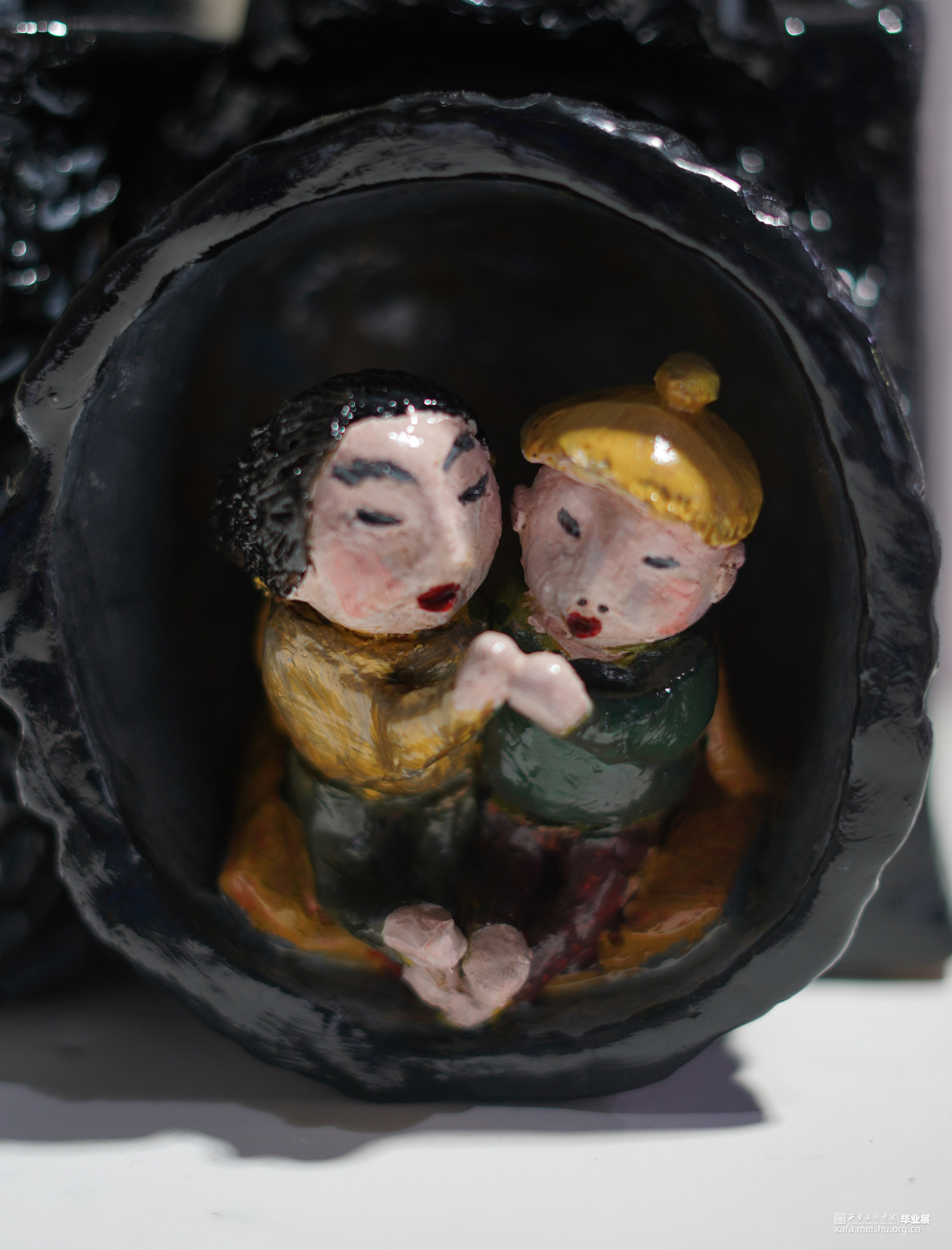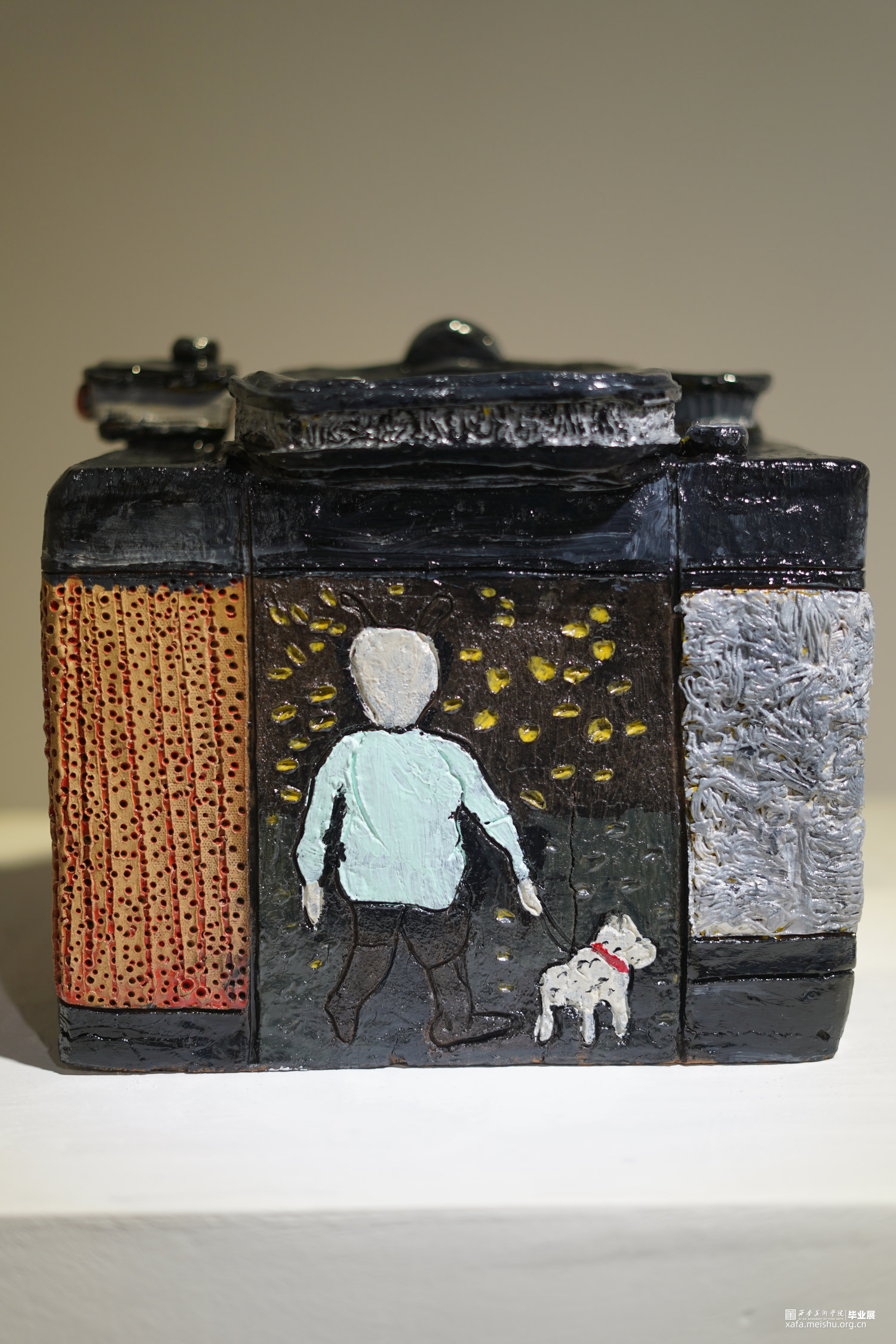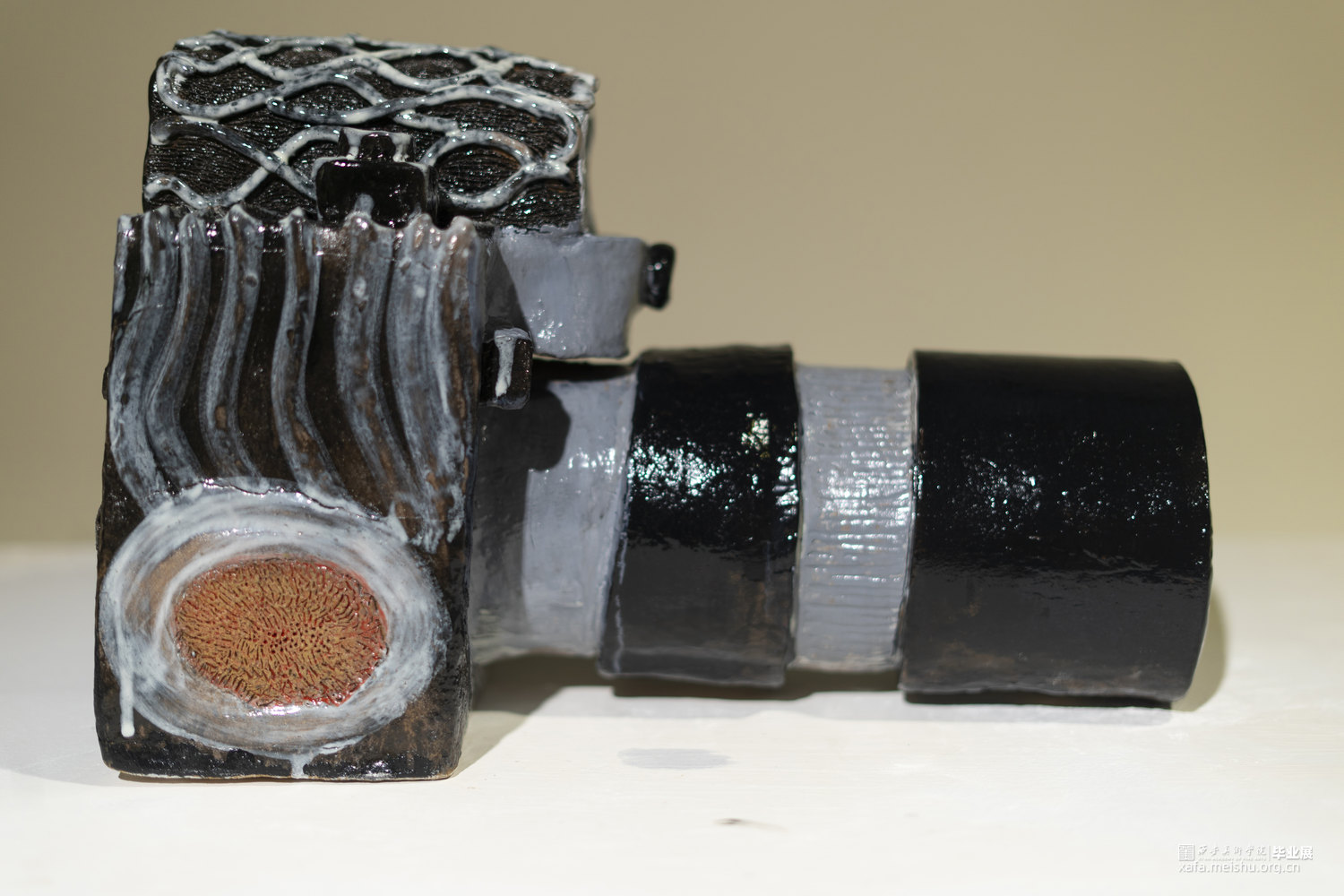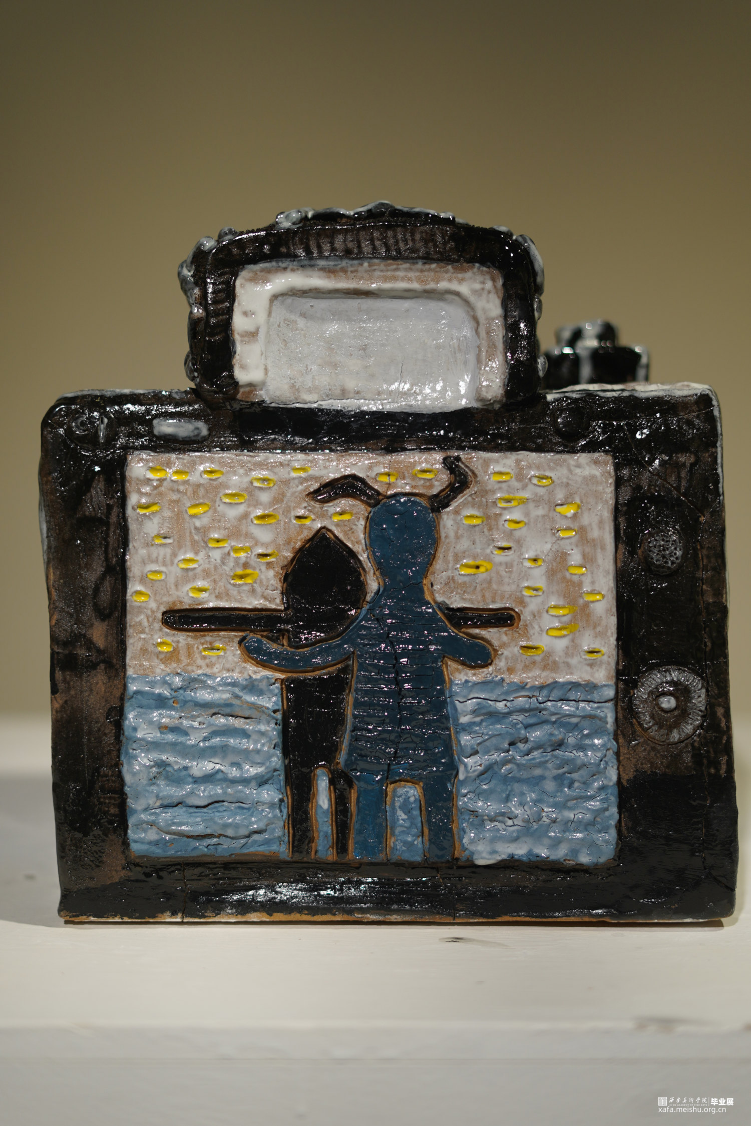 本作品以“相机”为主题,用陶艺手法将相机留存的瞬间完美展现。通过陶泥刻画人物形象在相机显示器中的形象,将艺术与日常生活巧妙地结合在一起,希望在这个快节奏的时代唤醒人们对于美好瞬间的回忆。