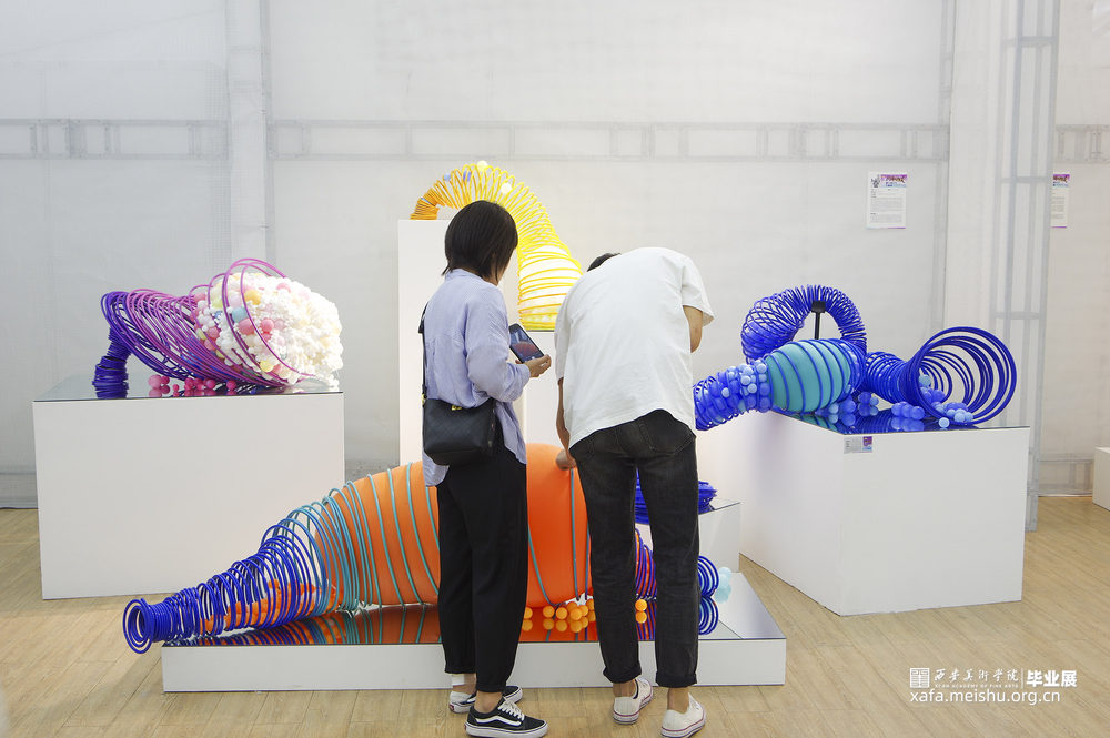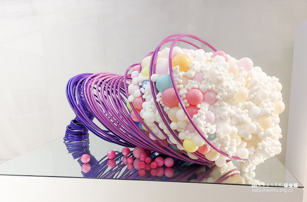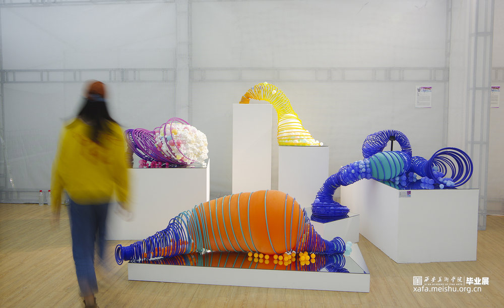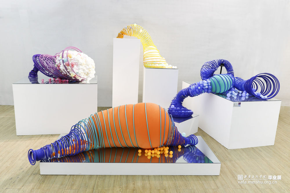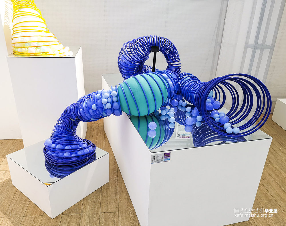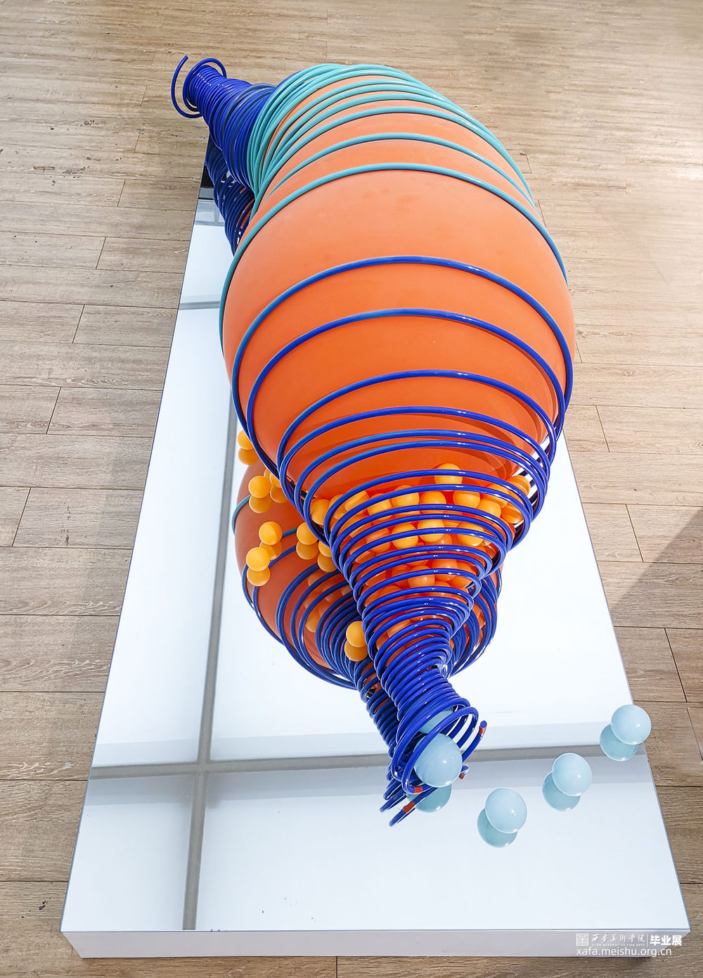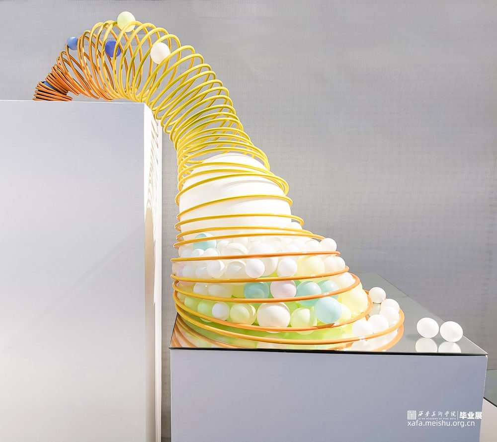 灵感来源于玩具——彩虹圈,其能变换多种形态。弹性的材料特质在重力的作用下可由惯性沿着阶梯不断伸展再复原,呈现“拾级而下”的有趣状态。由此思考个体与环境的关系,如皮亚杰所说:人生就是在同化和顺应中从一个平衡到另一个平衡的演进。在社会大环境下人们是应故步自封还是随机应变需要静心思考。彩虹圈带给人们的感觉是孩童时的单纯和柔软,通过清新的色彩和灵动变幻的不锈钢“彩虹圈”传递对生活积极无畏的心境以及面对百态人生张弛有度的包容。