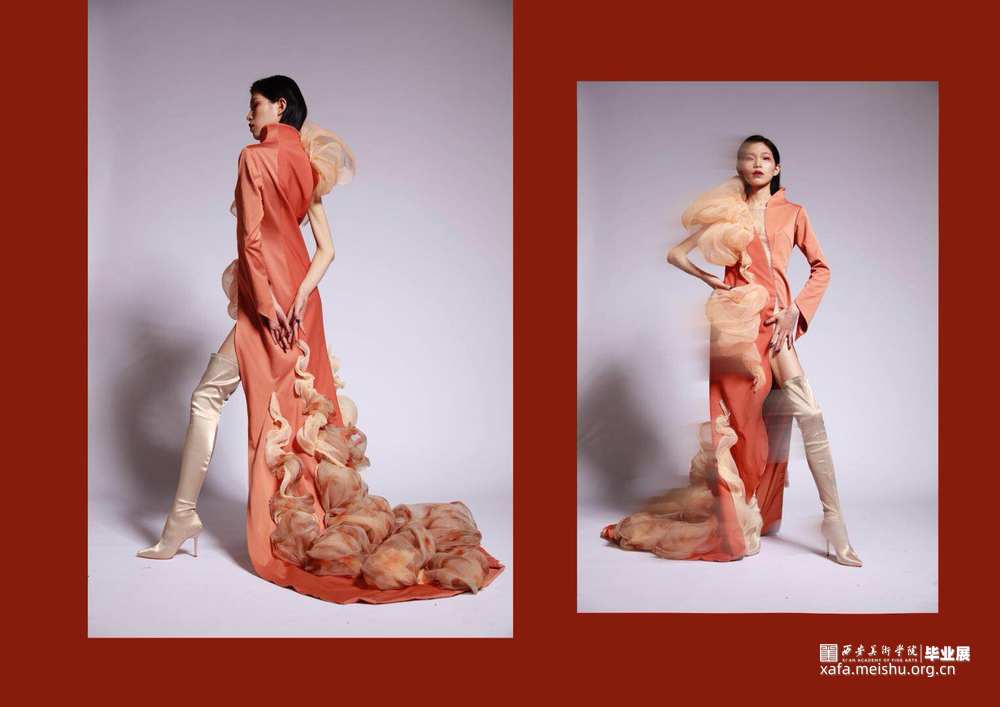毕业设计作品《胡姬•酒肆》是以胡旋舞为设计灵感,将胡旋舞舞转化为图像进行印花,并用纱与压褶工艺结合,来表现胡姬歌舞时的流动性和急速旋转的感觉。款式上参考了唐代胡服的款式与现代流行元素结合进行设计。塑造一个神秘的胡姬形象。