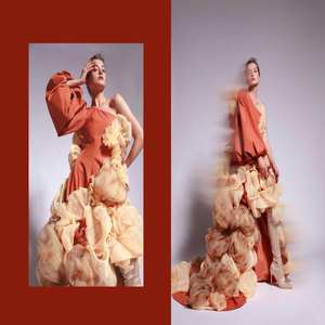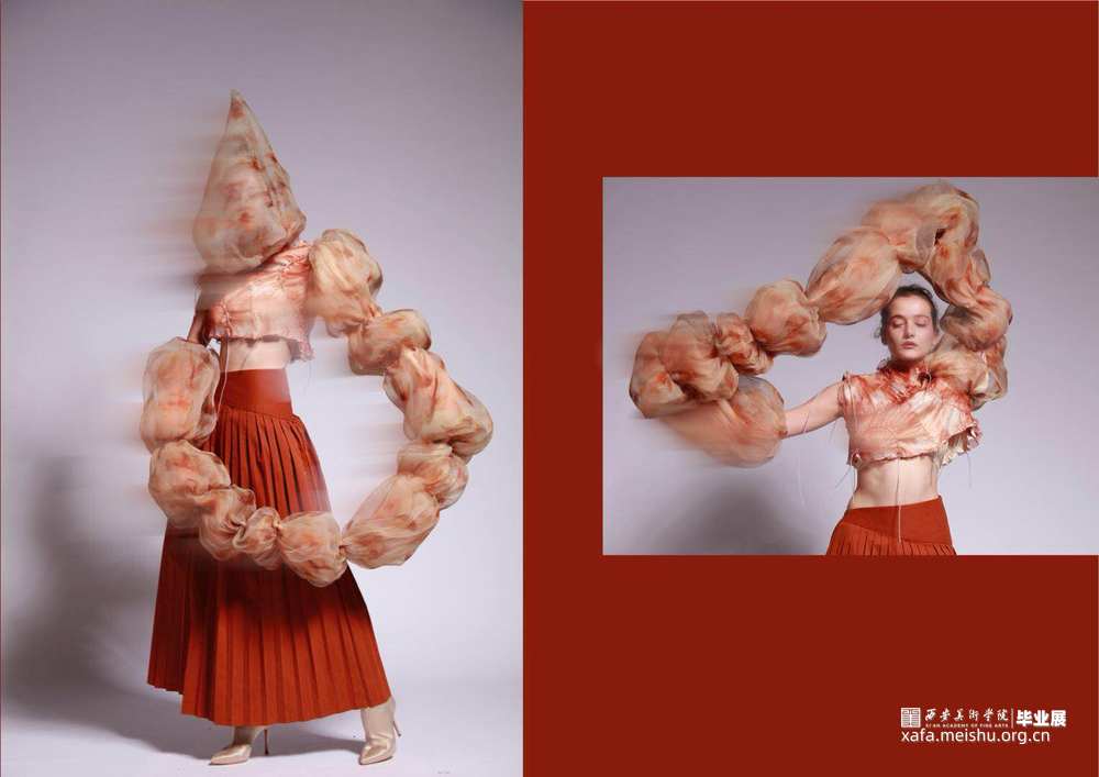 毕业设计作品《胡姬•酒肆》是以胡旋舞为设计灵感,将胡旋舞舞转化为图像进行印花,并用纱与压褶工艺结合,来表现胡姬歌舞时的流动性和急速旋转的感觉。款式上参考了唐代胡服的款式与现代流行元素结合进行设计。塑造一个神秘的胡姬形象。