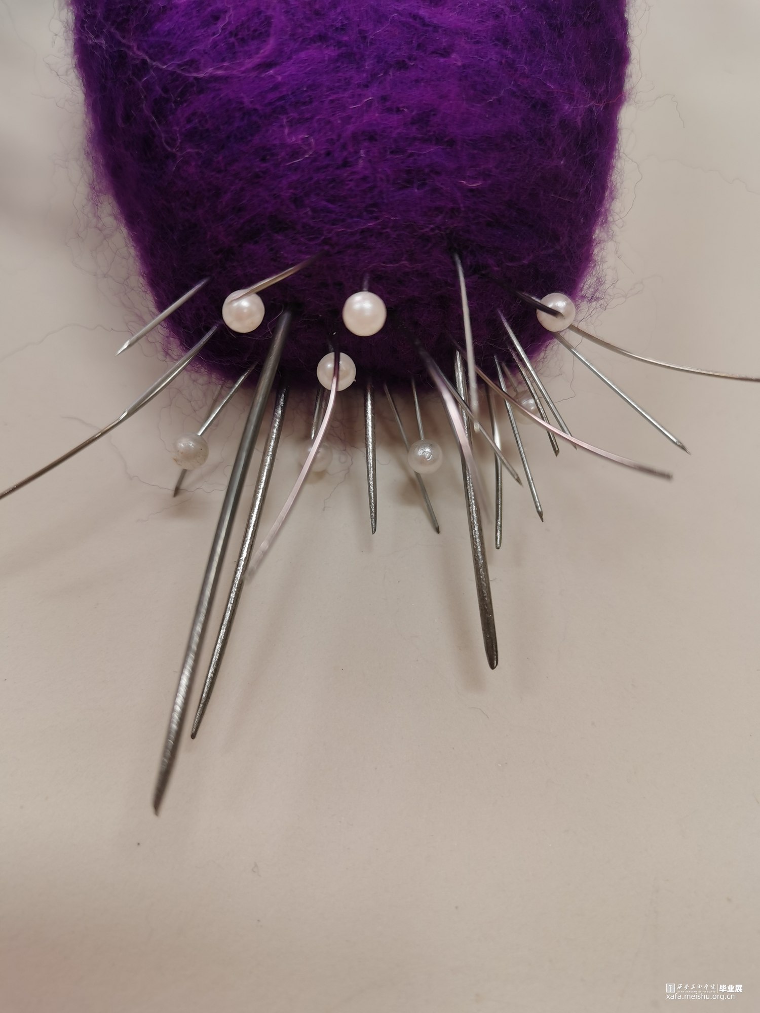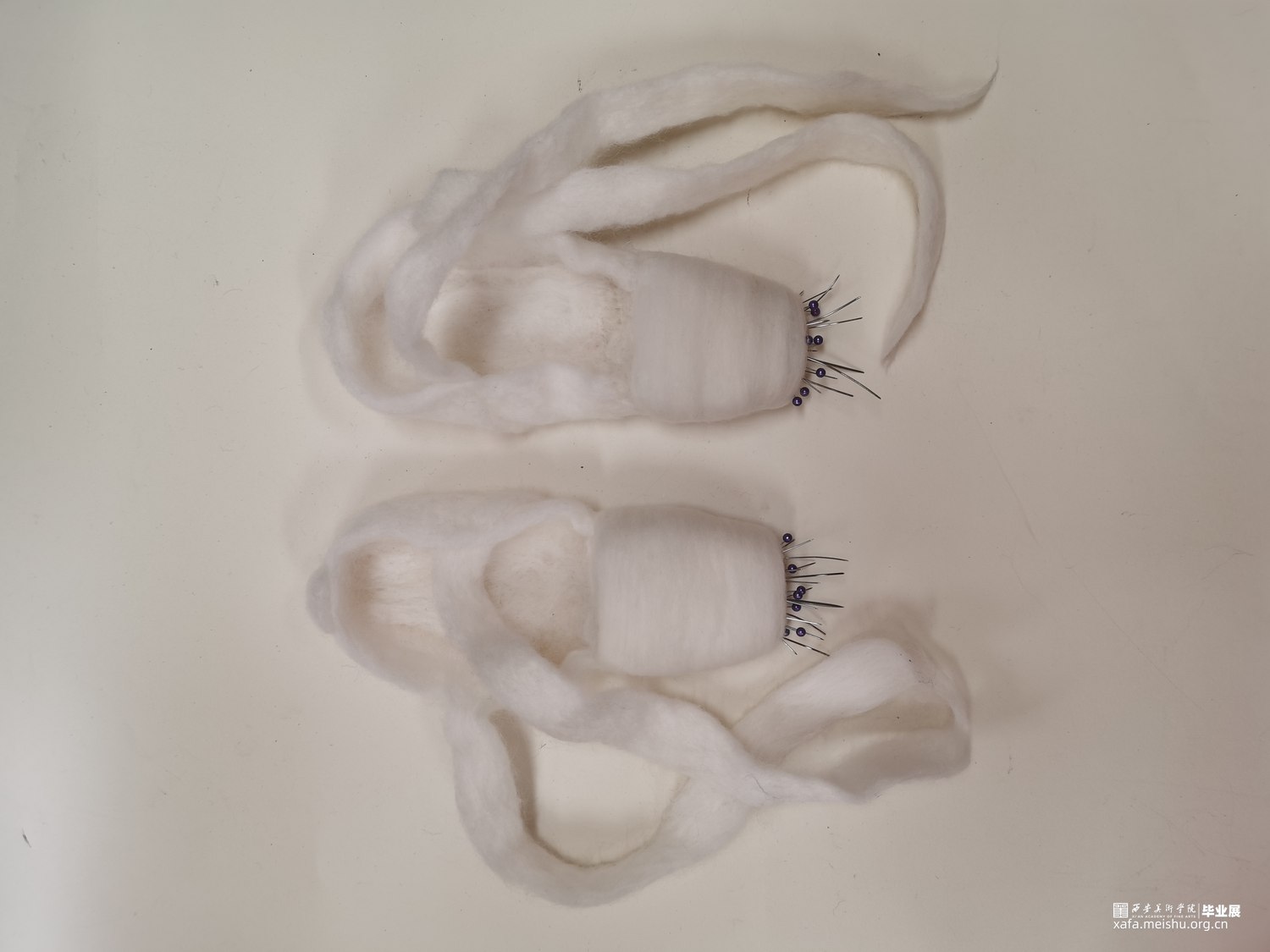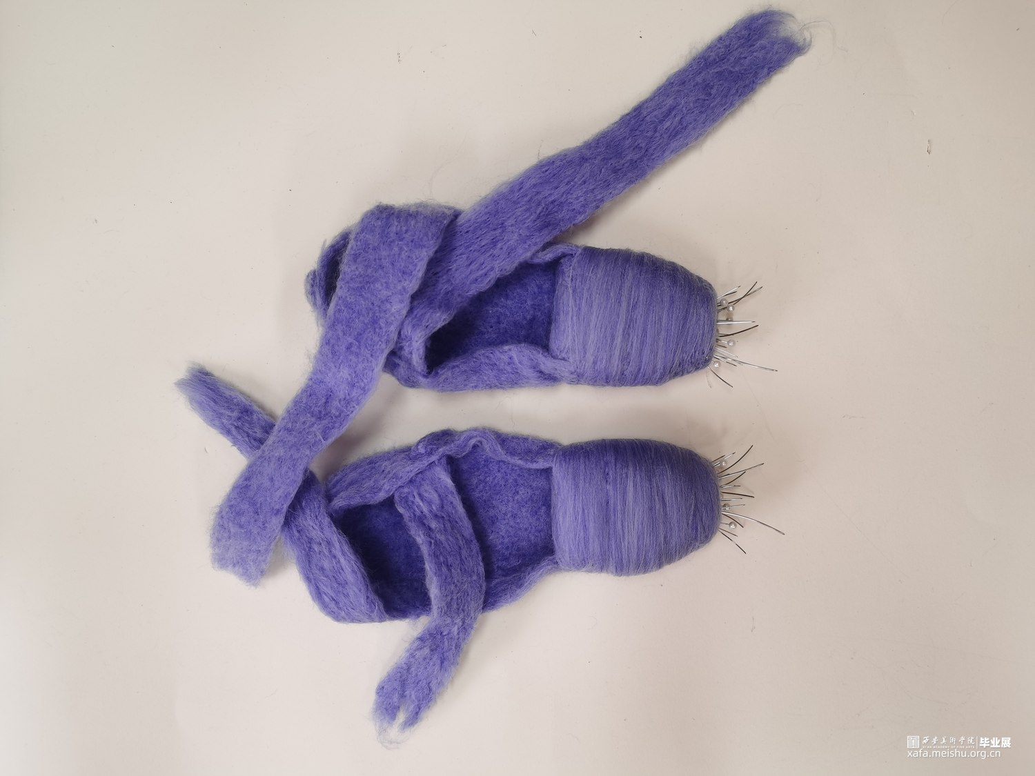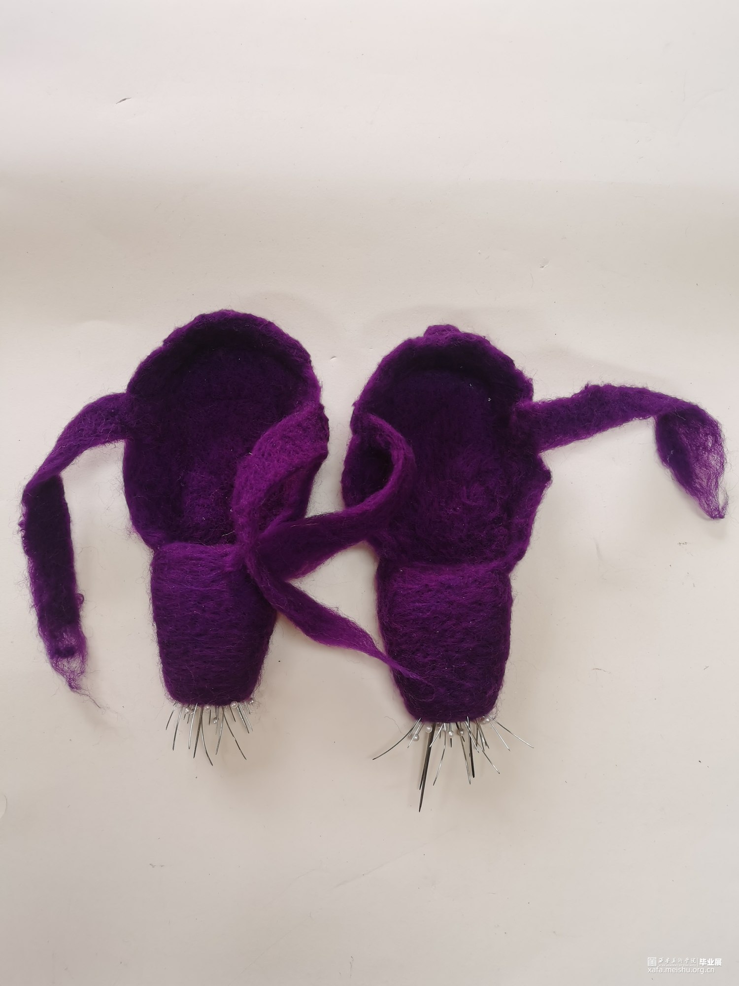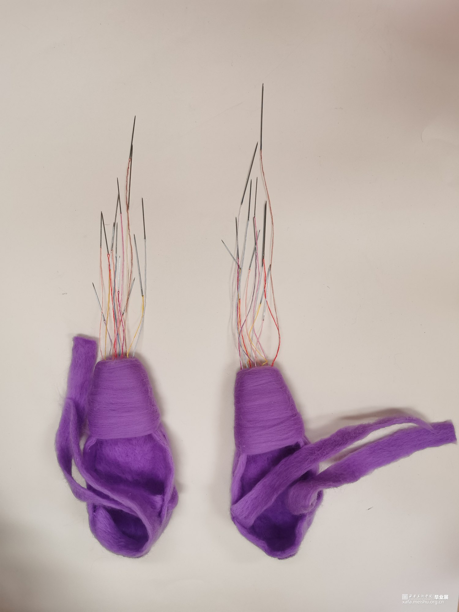 艺术相通,心相灵。舞台之上的舞者在璀璨的聚光灯之下翩翩起舞,给人们带来了一场视觉盛宴,如同梦境一般美好。却不知,“梦境”的背后是无数次疼痛的“现实”。本作品将毛毡与综合材料结合,而尖锐的针便是代表了芭蕾鞋练习时的疼痛感,从剧烈的直观痛感到用线与针连接时那若隐若现的痛感。“梦境”与“现实”共存才会达到最终呈现效果。
