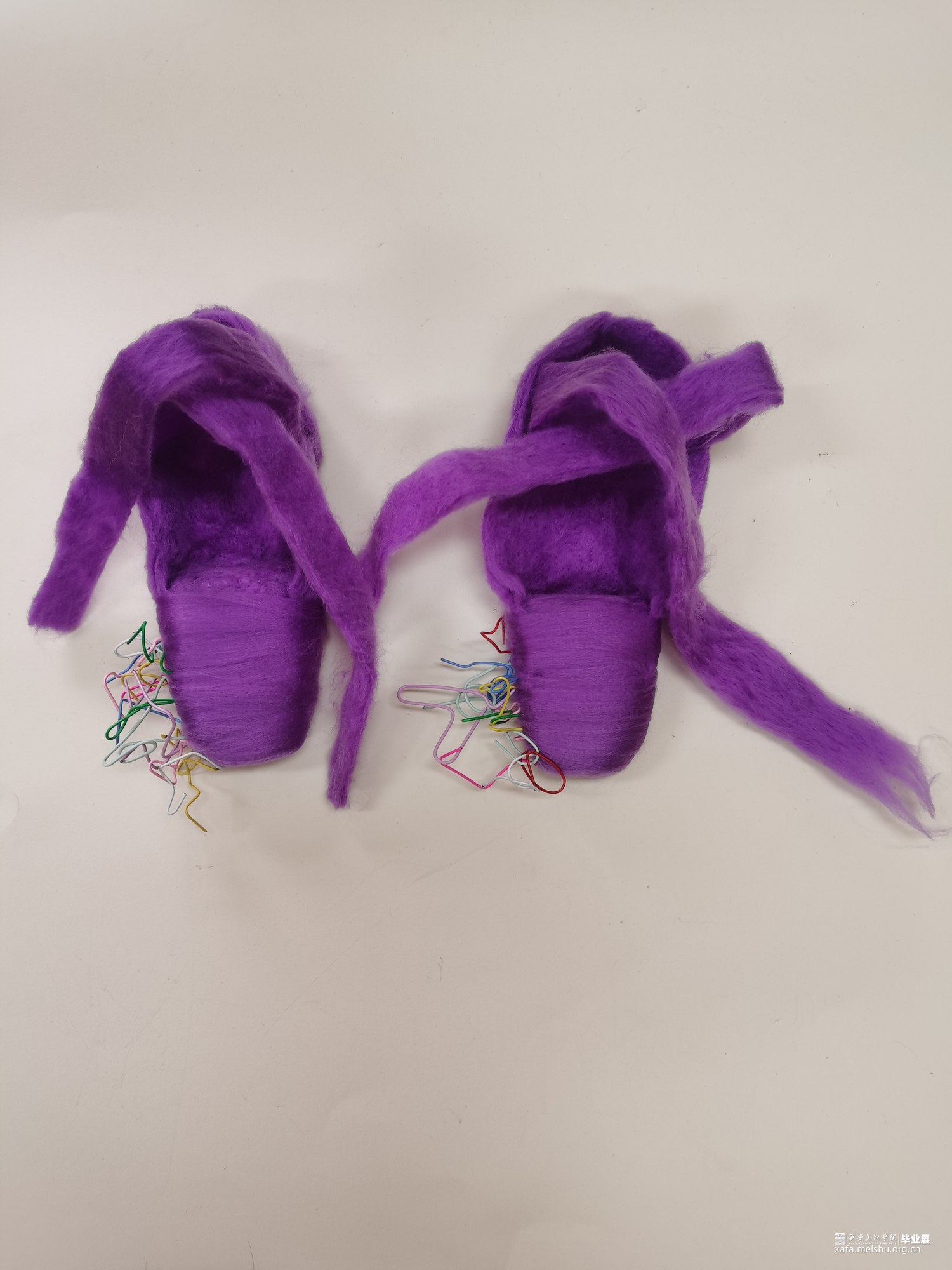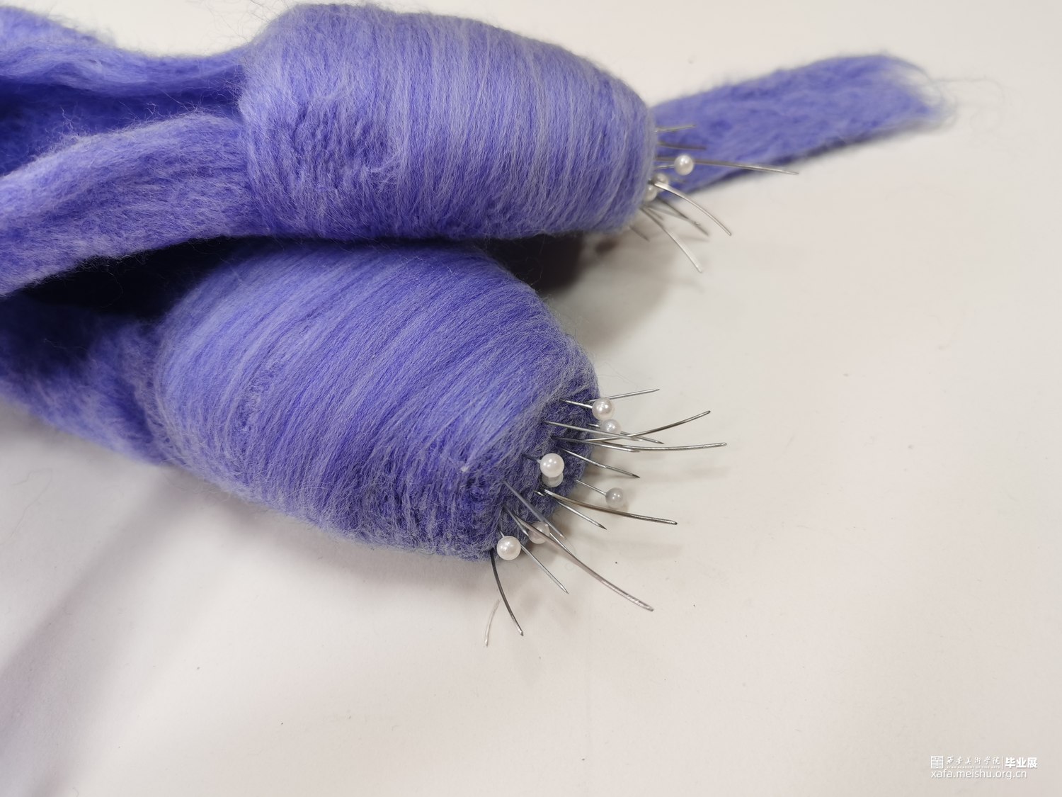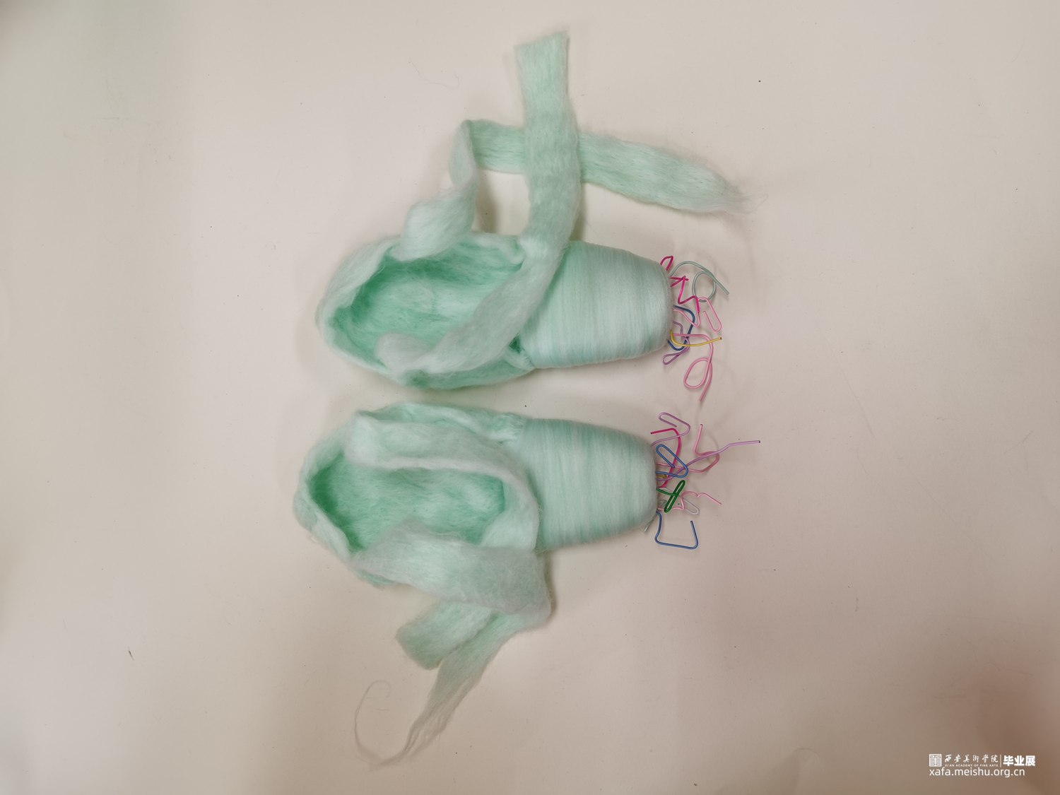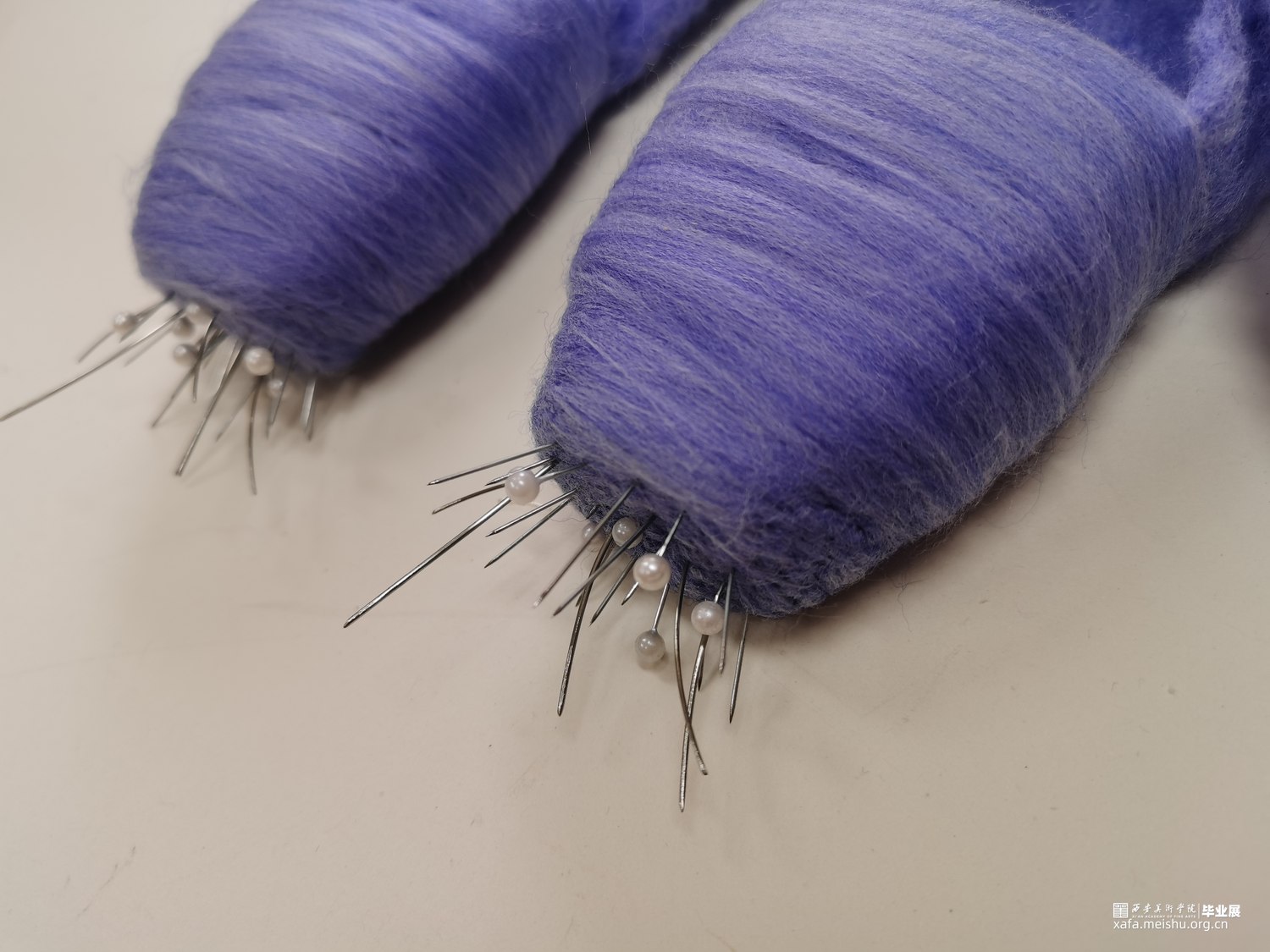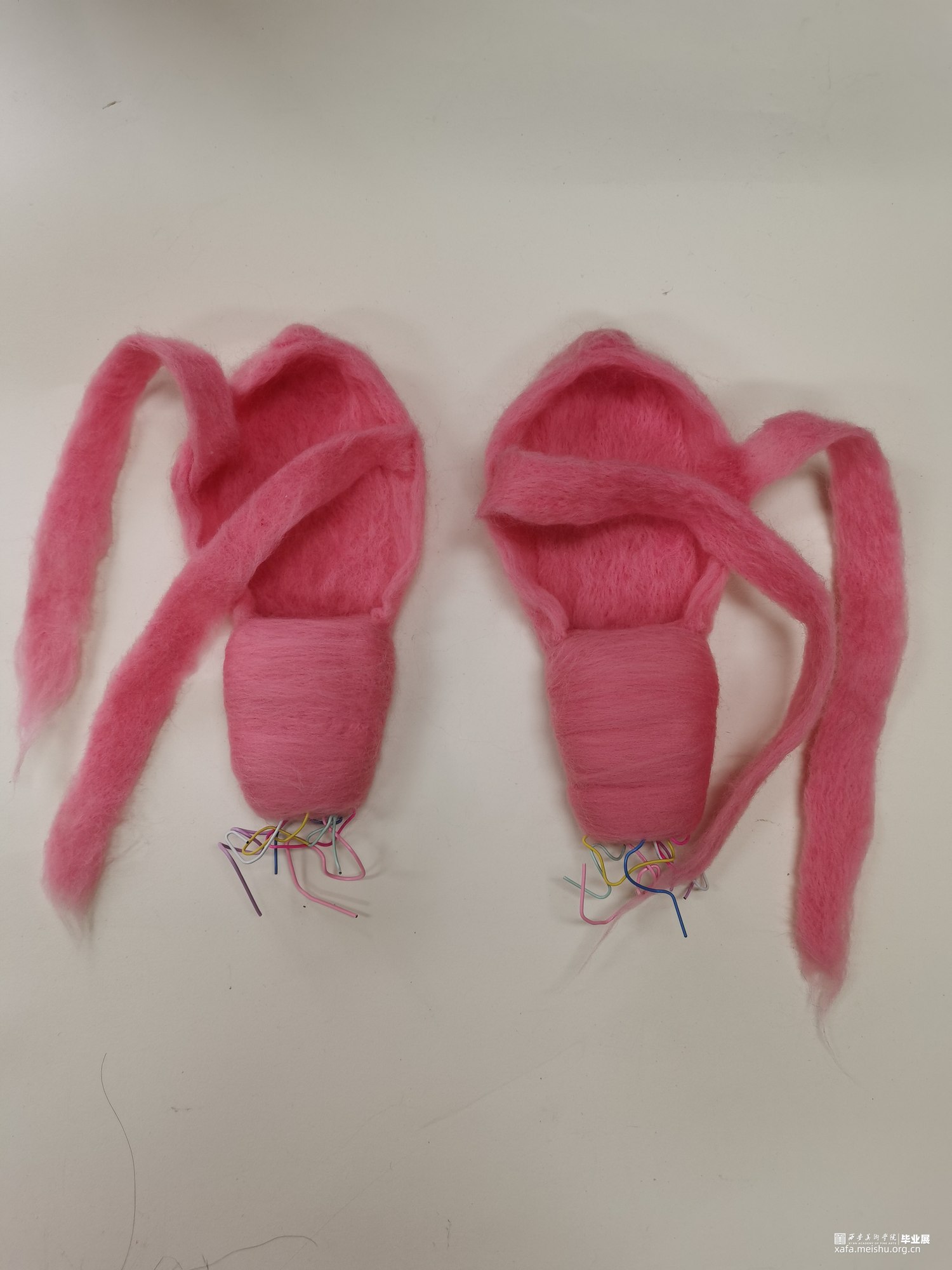 艺术相通,心相灵。舞台之上的舞者在璀璨的聚光灯之下翩翩起舞,给人们带来了一场视觉盛宴,如同梦境一般美好。却不知,“梦境”的背后是无数次疼痛的“现实”。本作品将毛毡与综合材料结合,而尖锐的针便是代表了芭蕾鞋练习时的疼痛感,从剧烈的直观痛感到用线与针连接时那若隐若现的痛感。“梦境”与“现实”共存才会达到最终呈现效果。