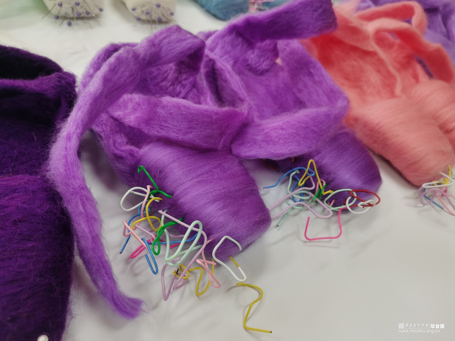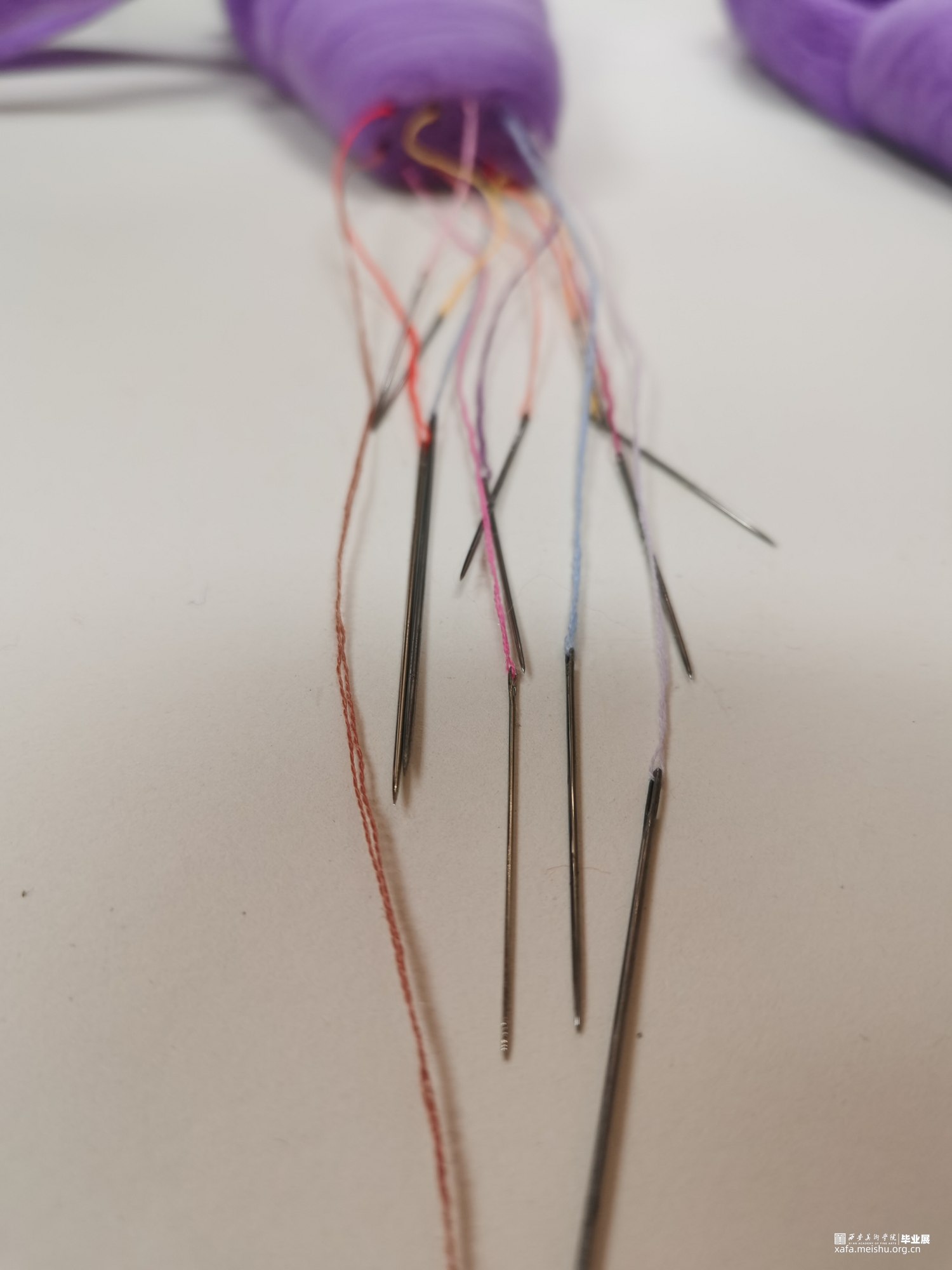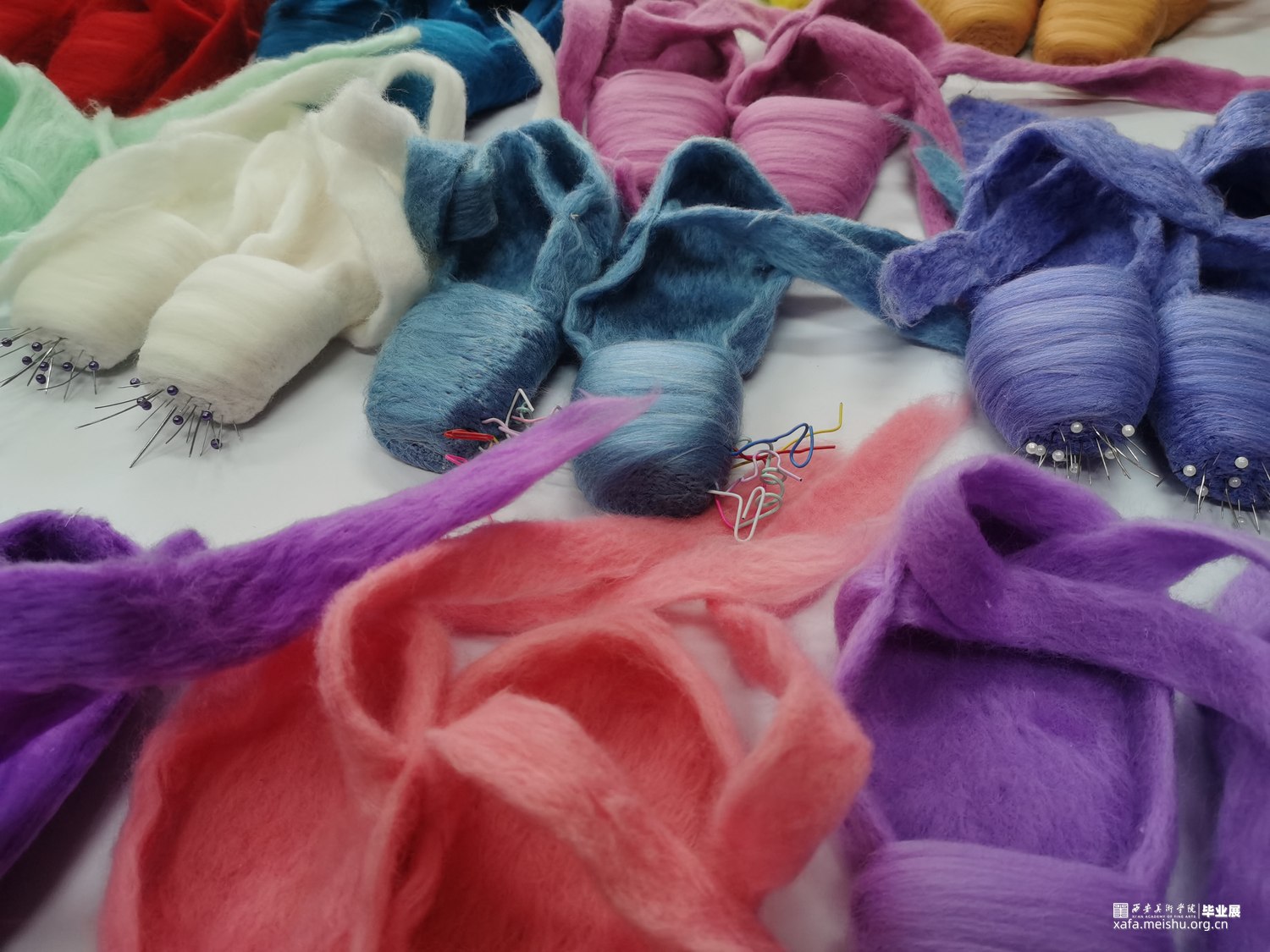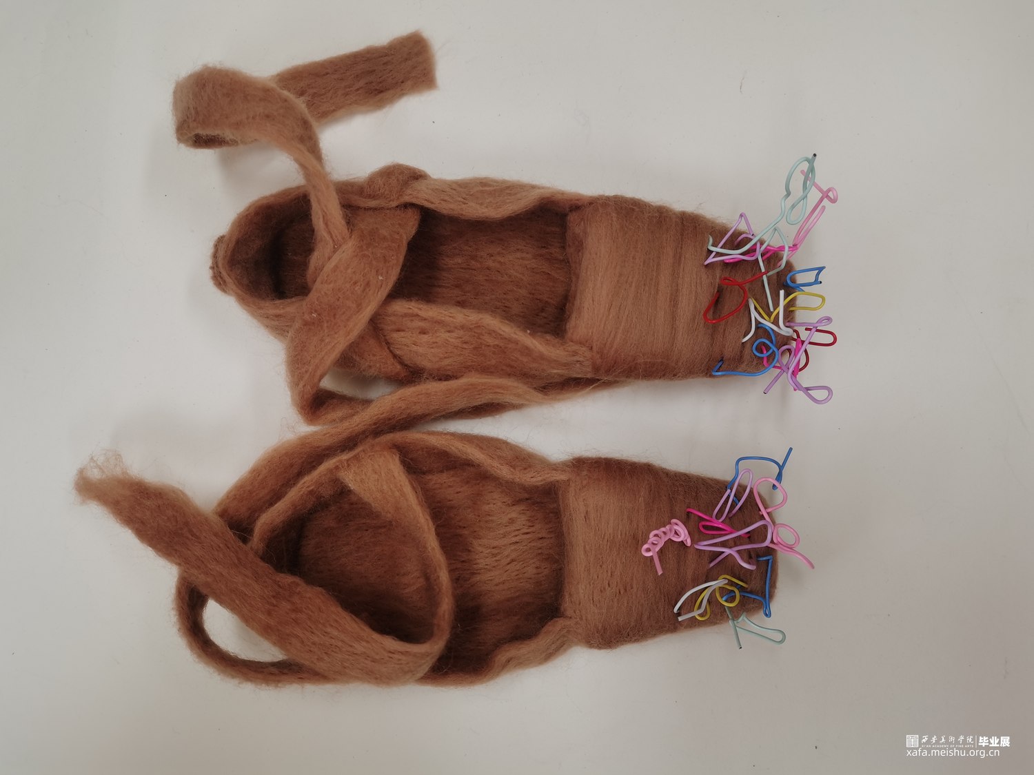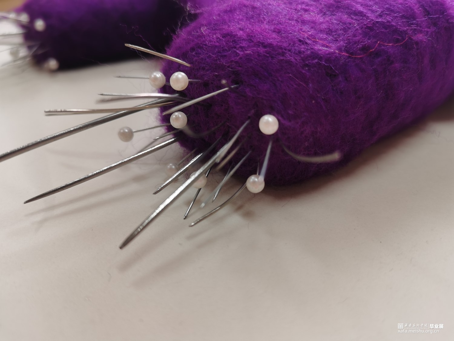 艺术相通,心相灵。舞台之上的舞者在璀璨的聚光灯之下翩翩起舞,给人们带来了一场视觉盛宴,如同梦境一般美好。却不知,“梦境”的背后是无数次疼痛的“现实”。本作品将毛毡与综合材料结合,而尖锐的针便是代表了芭蕾鞋练习时的疼痛感,从剧烈的直观痛感到用线与针连接时那若隐若现的痛感。“梦境”与“现实”共存才会达到最终呈现效果。