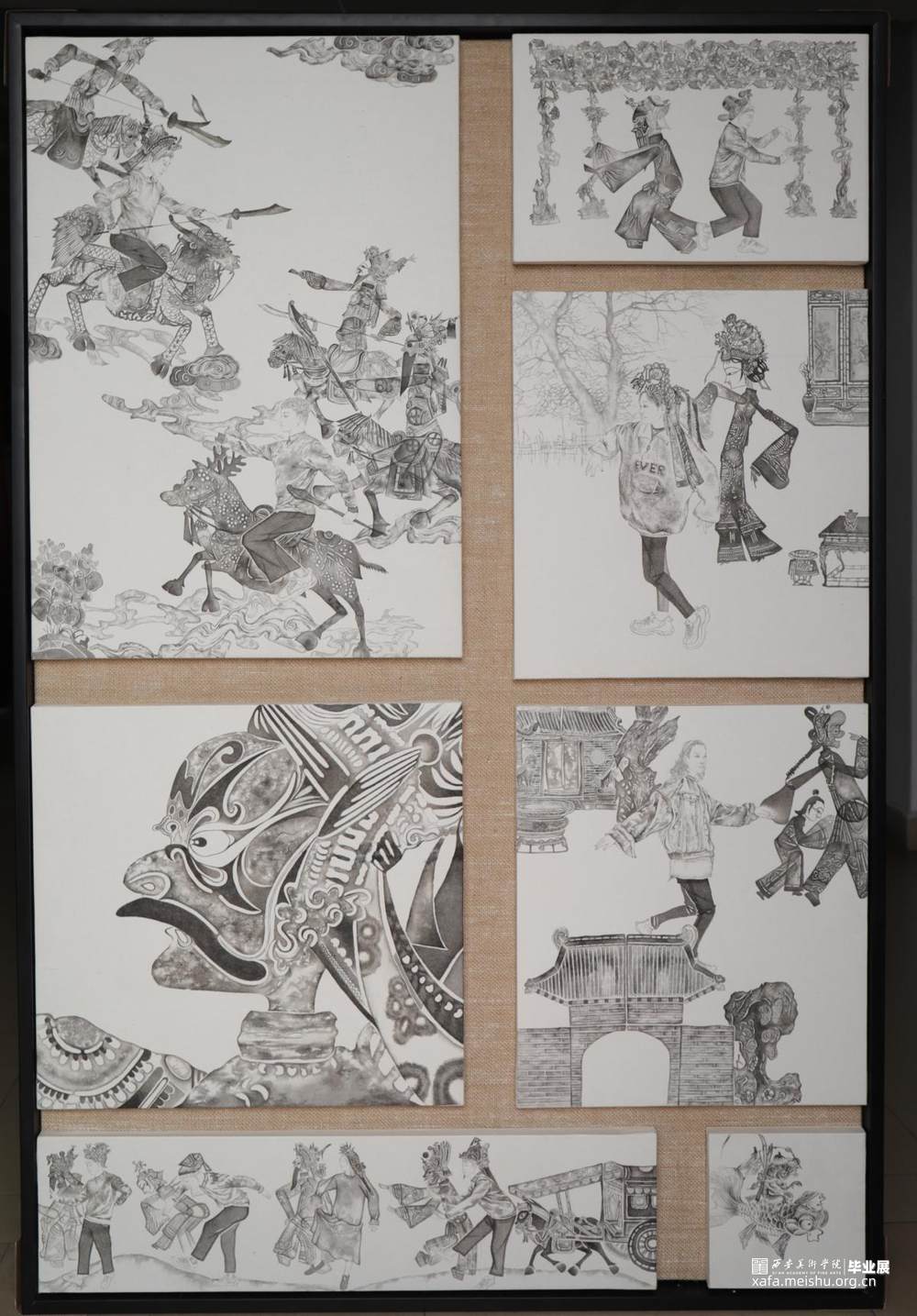 作品描述的是自己创作课程中的对传统艺术的一种思考,也是完成自己的一种幻想,画面中运用的载体就是民间艺人所创造的皮影,皮影在画面中代表的是传统的艺术形式,“我”在进入一个新的“世界”时,从开始的临摹,即使是一种滑稽的古怪的模仿,然后到学习路程中,被传统艺术带领着学习,最后,是与传统艺术进行的一种斗争,这种斗争不是摒弃的斗争,是一种突破的斗争。最后,传统艺术就像影子一般,融入到身体里了,伴随着“我”前行。
