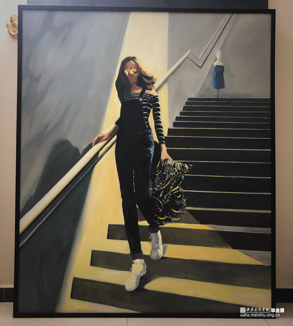 作品尺寸150CM*180CM,布面油画,人物场景创作。画面人物,走过深长的楼梯,孤寂和阳光,时尚的灵魂。
