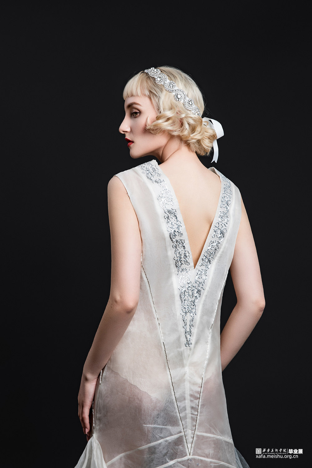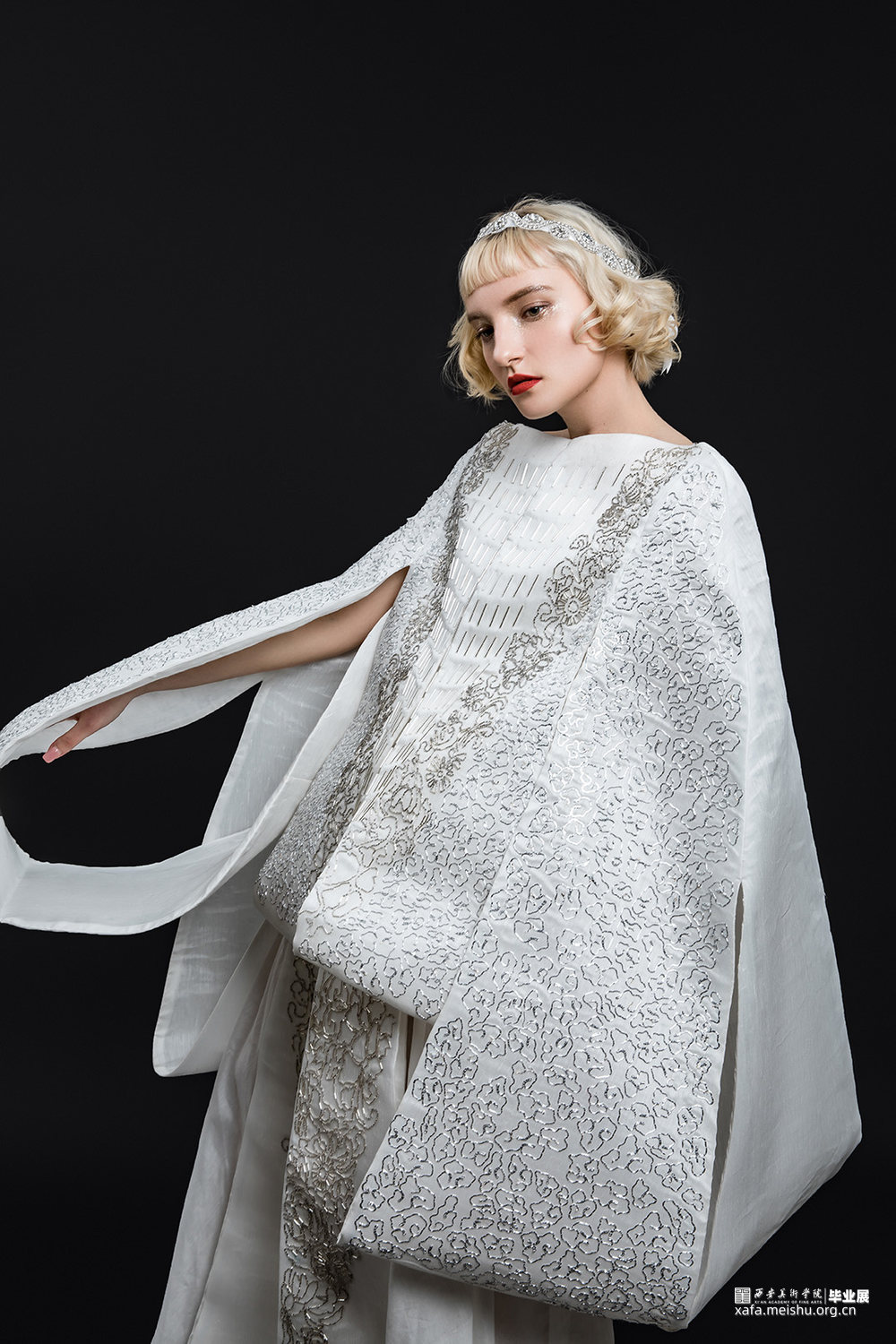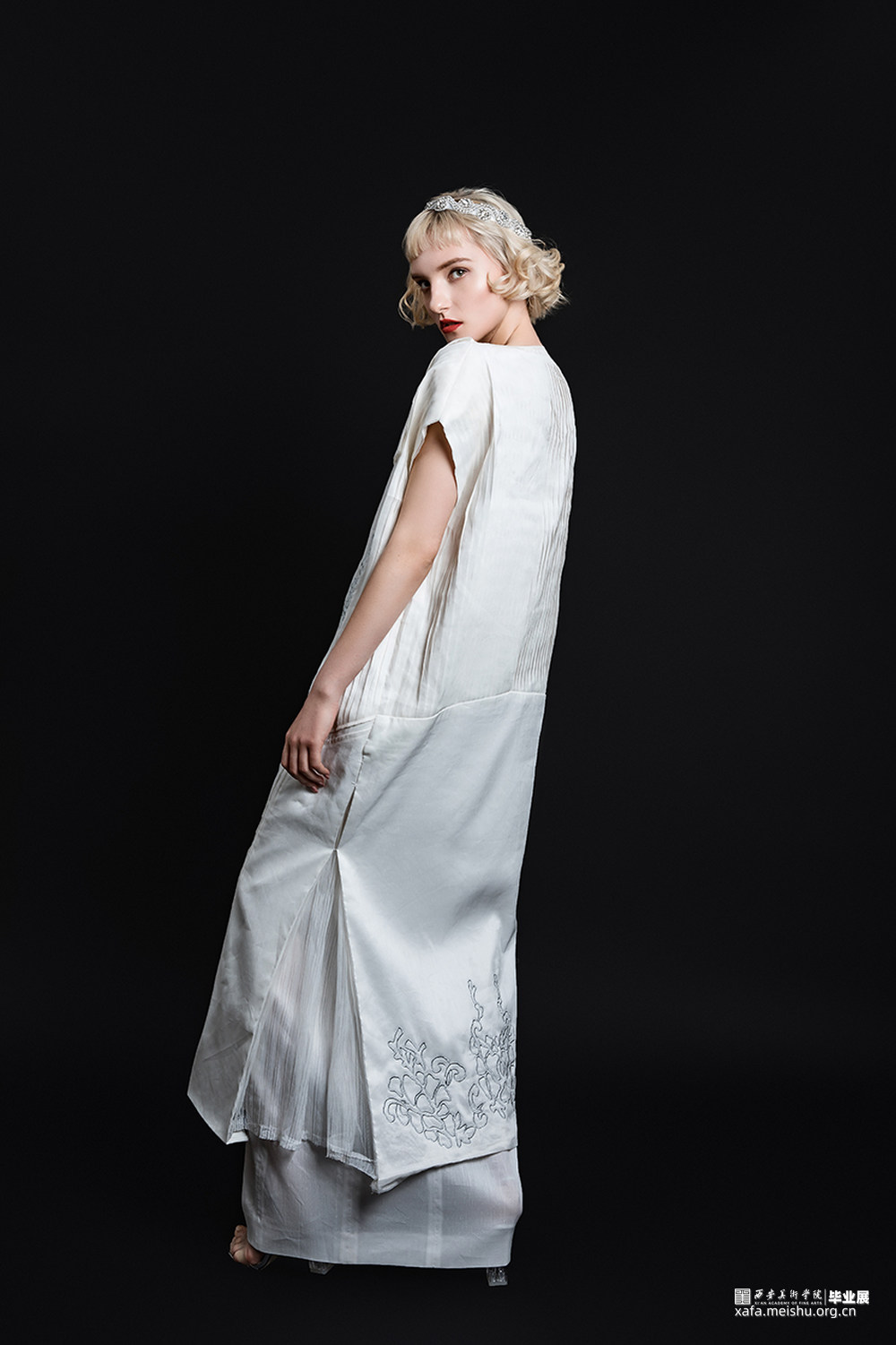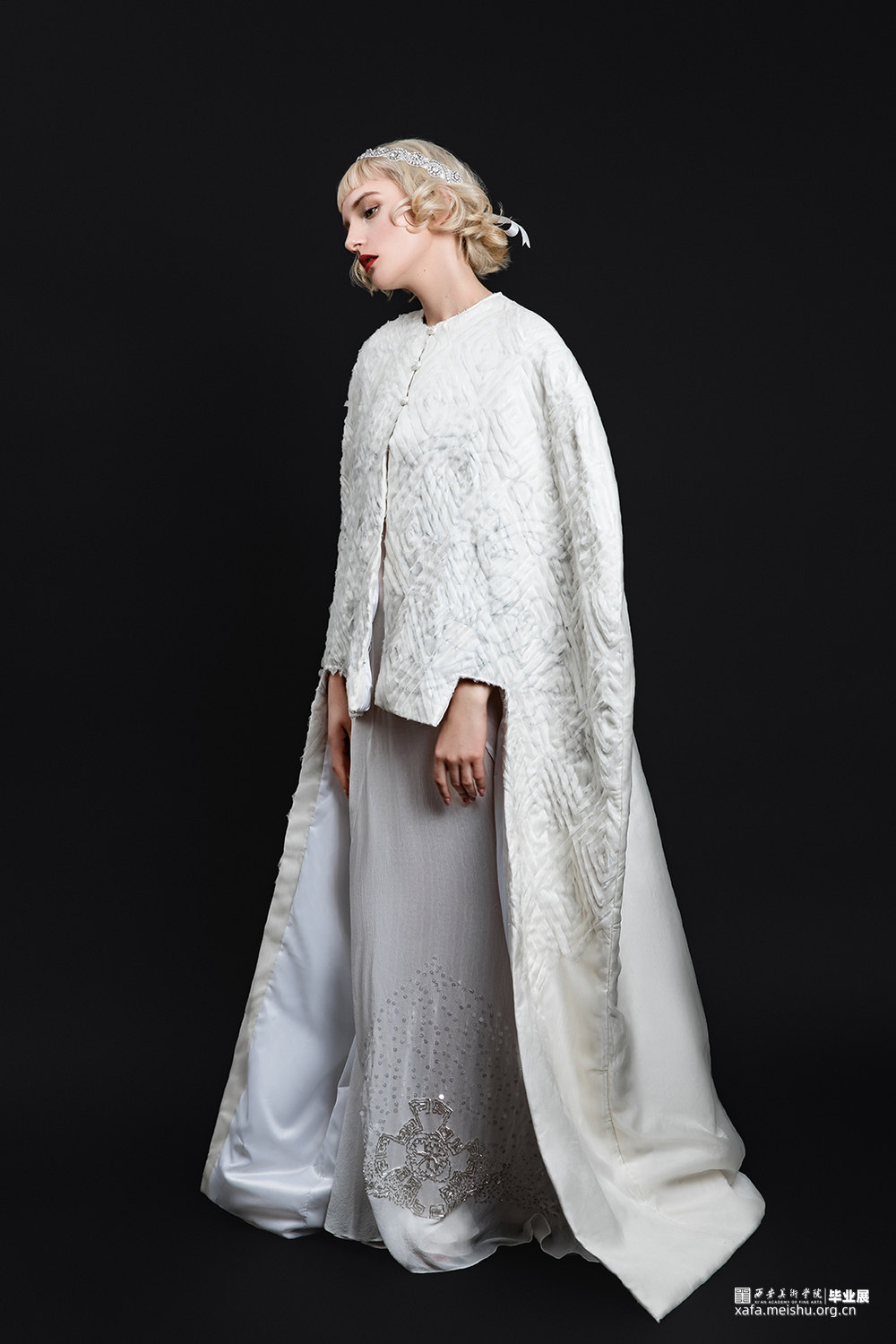 我的设计灵感来源于Art Deco风格“中国风”服饰对于女性的解放。主要运用不同密度的真丝面料来表现服饰不同的通透质感,表达女性不拘于传统,自观念上的解放。在工艺制作上选用立体裁剪工艺,使服饰更加贴合人体。在图案设计中运用Art Deco风格的几何图案特征将中国传统图案进行解构重组,对图案进行几何化处理,并用传统刺绣中的盘银绣及珠绣的方式进行展现。