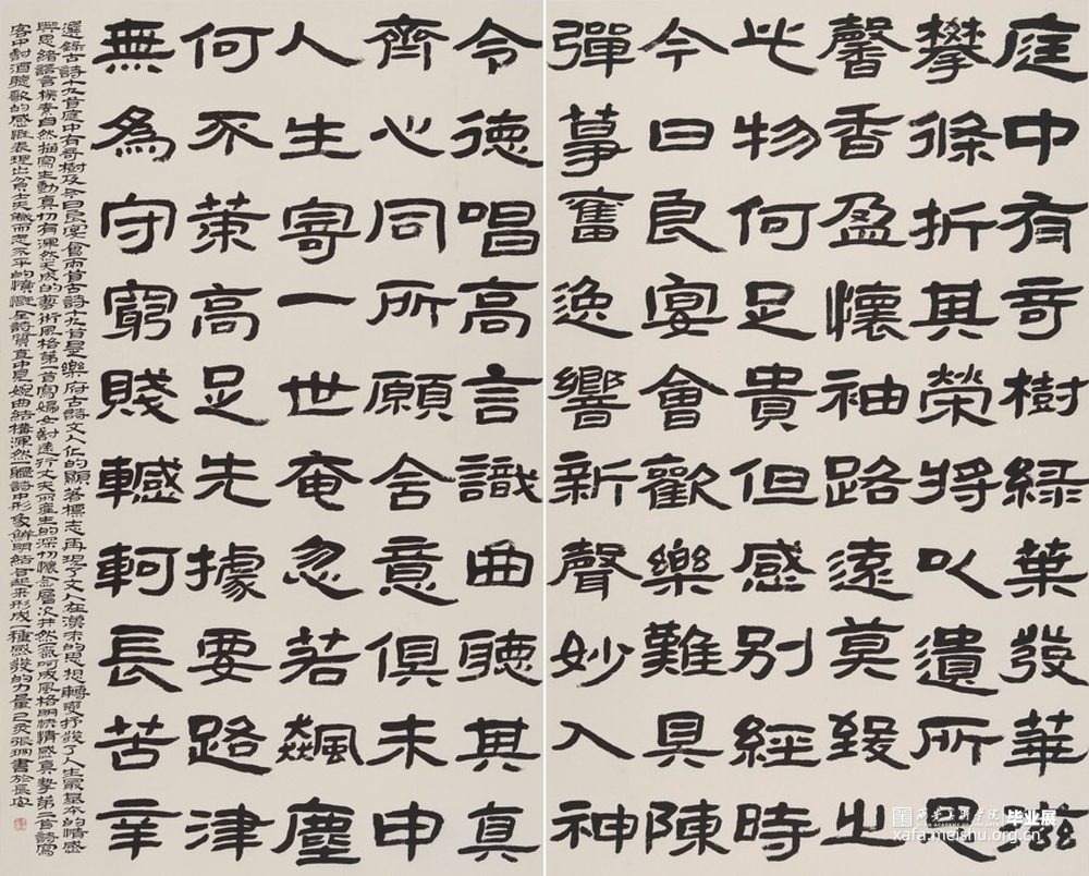 此作突出隶书的横向开张之势,取法《石门颂》笔意,表现坚定而不失典雅的气息。