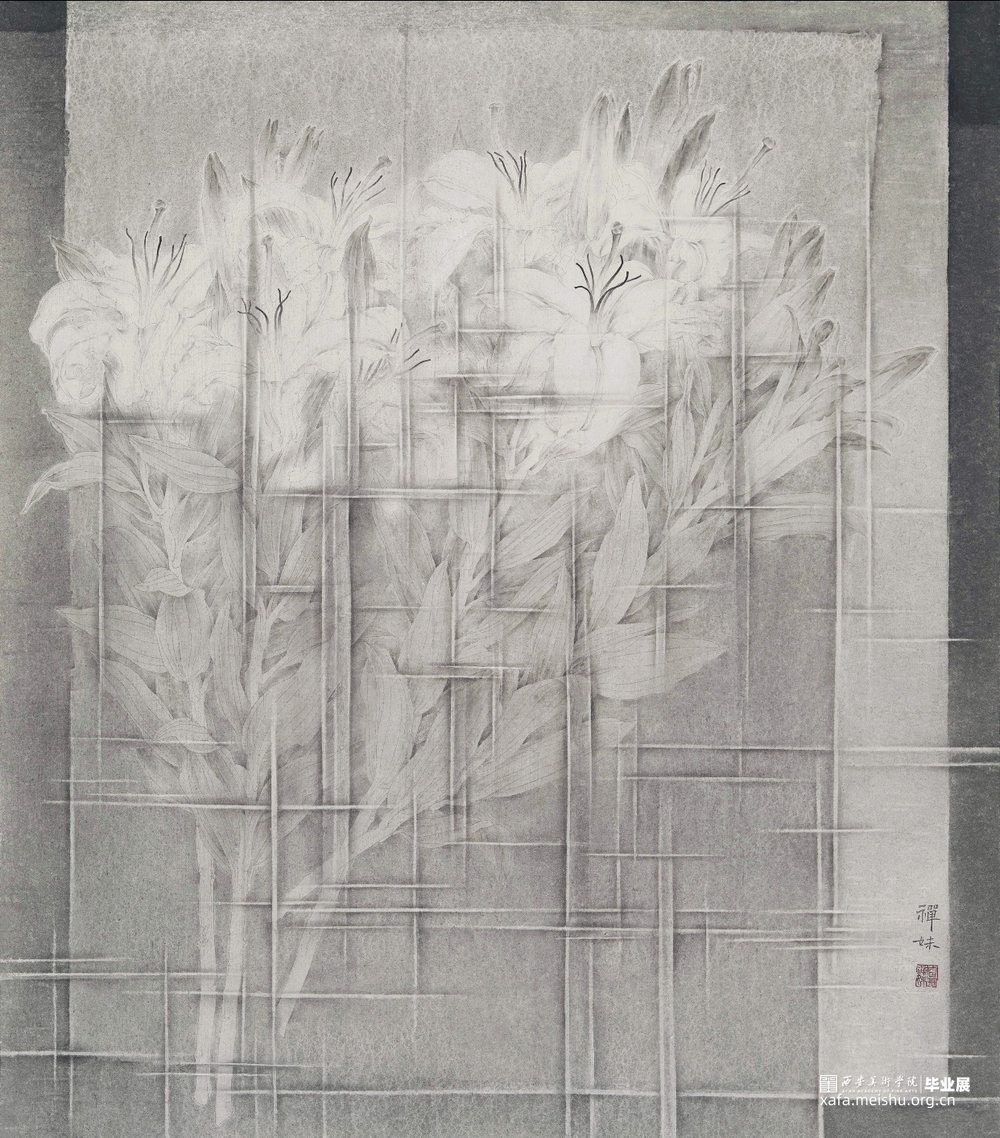 《绽放》取材于花卉市场,怒放的百合也是当下最为常见的鲜切花卉之一。鲜花自然的开放,色、鲜、香具备,鲜花也是规模化的产品,花头数量、叶片大小、折枝长短几乎一致。该作品以工笔和单色水墨绘制而成,使怒放的鲜花和数条横竖交错的痕迹凝结在一瞬间,力求建立一种冲突感和重建新的和谐。