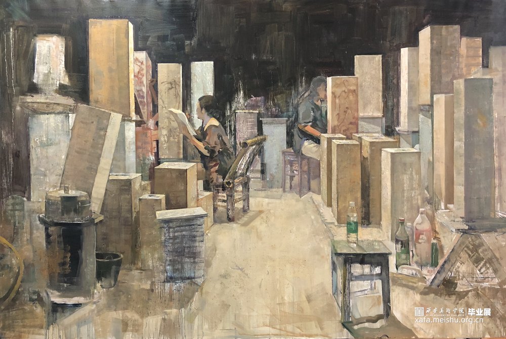 画油画时为了画面效果应该“不择手段”,不能仅仅局限于笔。在这张画中,我先是用较大的刷子用稀释过的油画颜料平涂黑色背景,然后用版画经常使用的油墨滚筒沾点泛暖的油画颜料在画面上来回滚动,使画面达到自然又和谐的色彩交融和一种特殊的肌理效果。