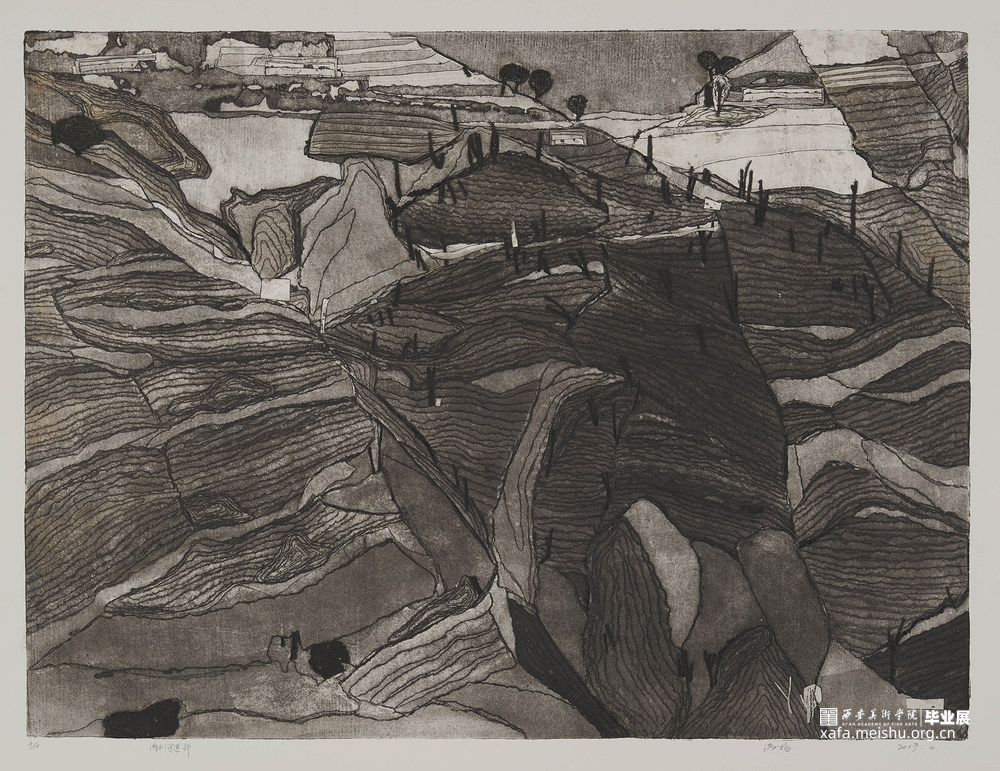 作品以“浪漫主义山河大地”为题,描绘内容是现实的和理想中的风景。作品是纸质材料通过拼贴、叠加等手段制成母版,涂油墨压印在纸上的纸本版画。母版制作过程中,纸本身的材料肌理和作者利用纸材料通过叠加、粘贴的方式制作的人工肌理,通过印制产生了风景的画面图像。母版中纸叠加产生的积聚感、机械而明确的纸边缘线产生的紧张感与层层叠叠、容易消逝的风景形象这两种语义结合;利用纸质材料本身的感性语义,表现风景这形象,达...