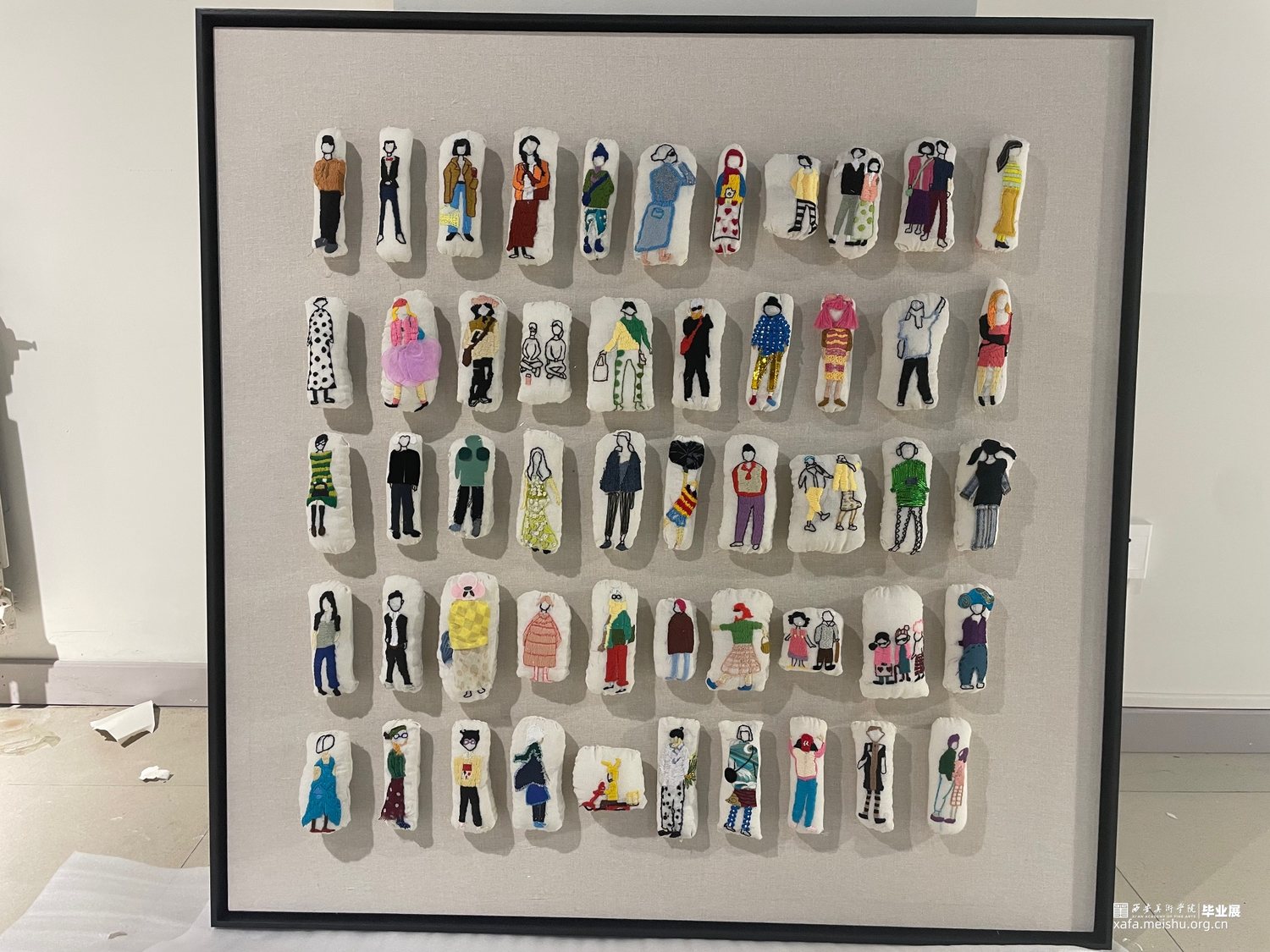 作品使用刺绣的工艺手法创作出数十个生动的人物形态,每一个形象都源自于创作者身边的朋友,也代表了正在拼搏的大学生群体,他们年轻、鲜活、富有生命力、朝气蓬勃…