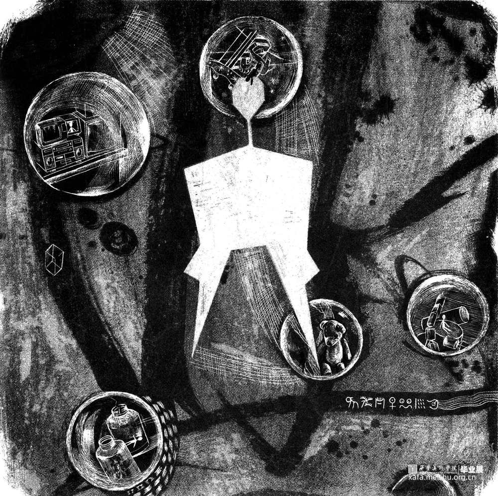 “轨迹”系列表现了我对自身成长经历的思考,每一幅画面都讲述着一个个不同的主题故事,整体构图呈现“碎片化”,素材大都来源于我儿时的记忆、印象和想象。 “轨迹”,数学概念里它叫做符合一定条件的动点所形成的图形,正如漫步在人生道路上的我们,每个人都像是一个个可以变动的点,我们按照自己的规则去移动,最终变为一条条轨迹印刻在人生的道路上。90后的我们行走在时代的洪流中,正经历着人生中最尴尬的岁月。我们早已不再是从前那个躲在父母身后的胆小孩童,我们急于去追逐外面世界的五光十色,可又在迈出脚的那一瞬间而感到迷茫踌躇。我们在流逝的光阴中成长着,面临着许多问题的考验,遭受着青春的磨难伤痛,也收获了来自生活的点滴喜悦。