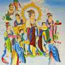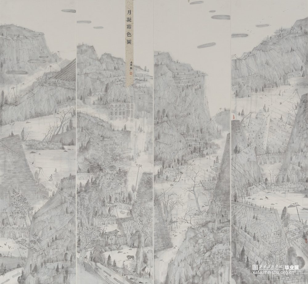 作品以陕北为表现题材,运用了水墨与构成切割的自我解构组合,结合自身笔墨理解,以求表现别样的陕北月夜下,冷寂清幽的静谧之感。