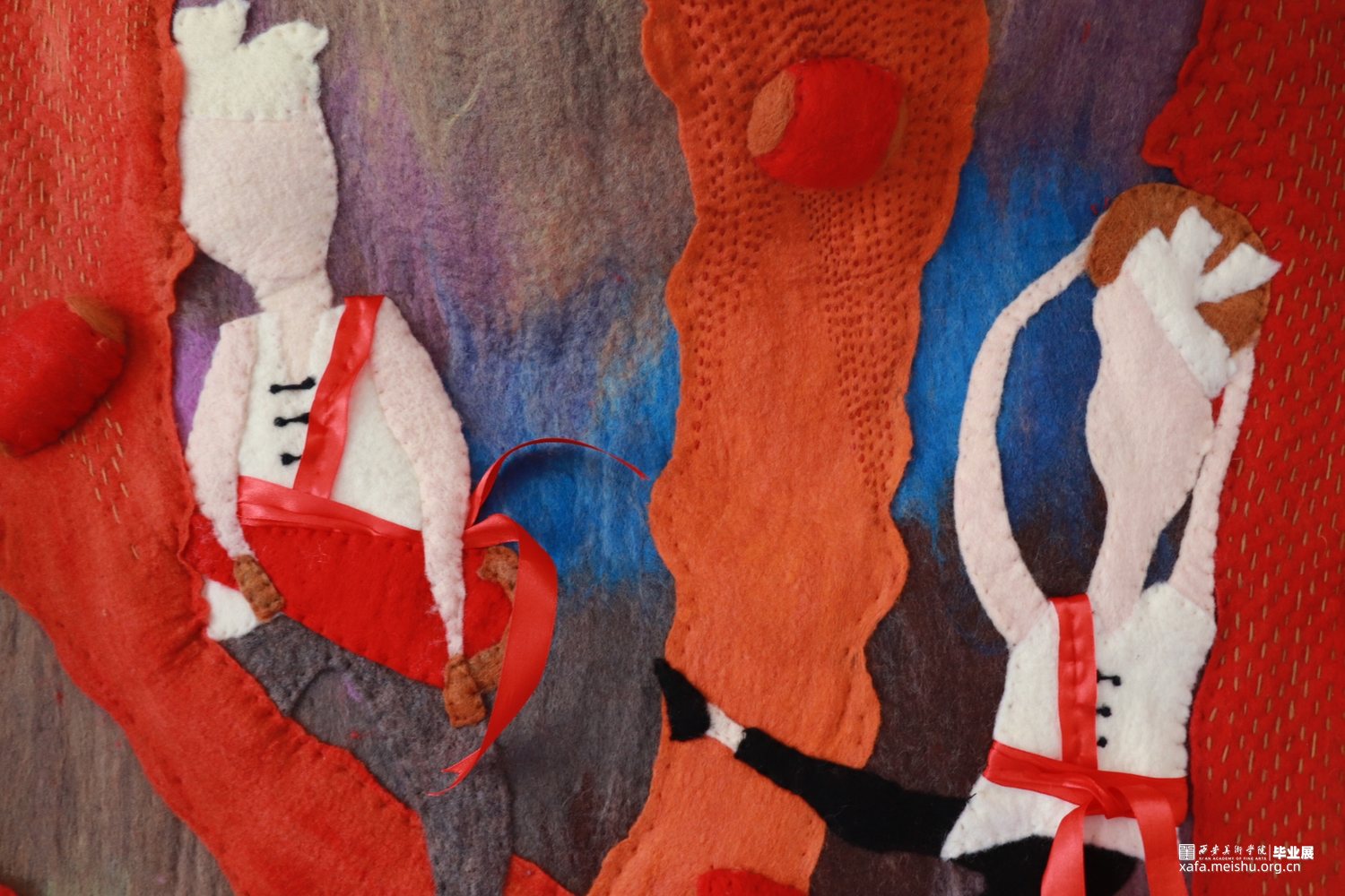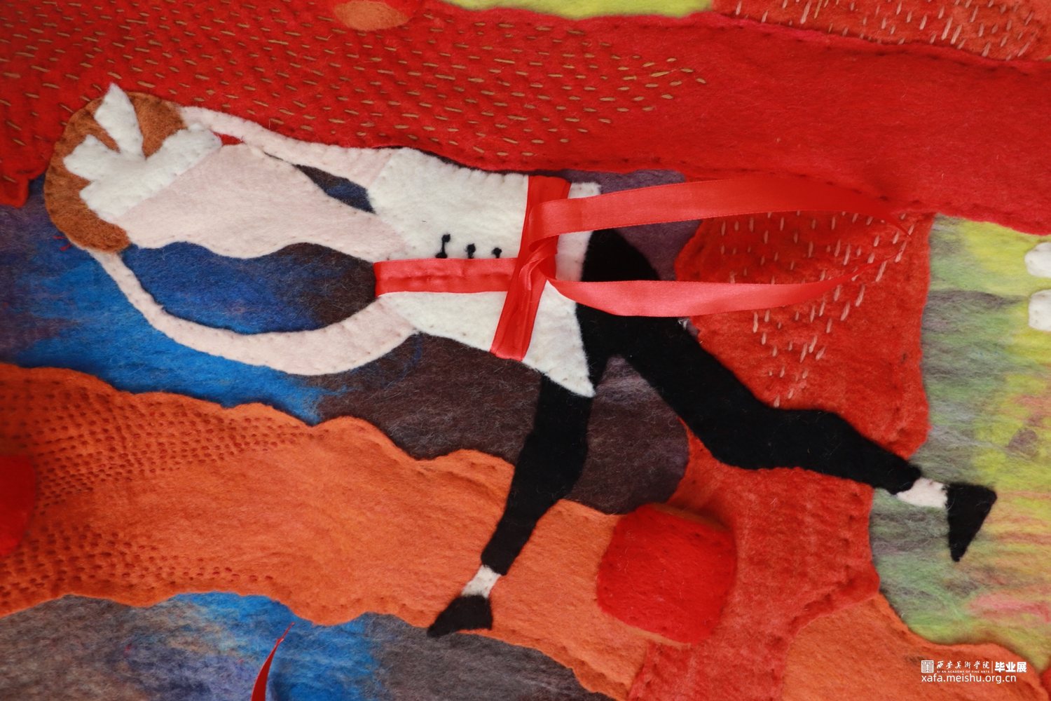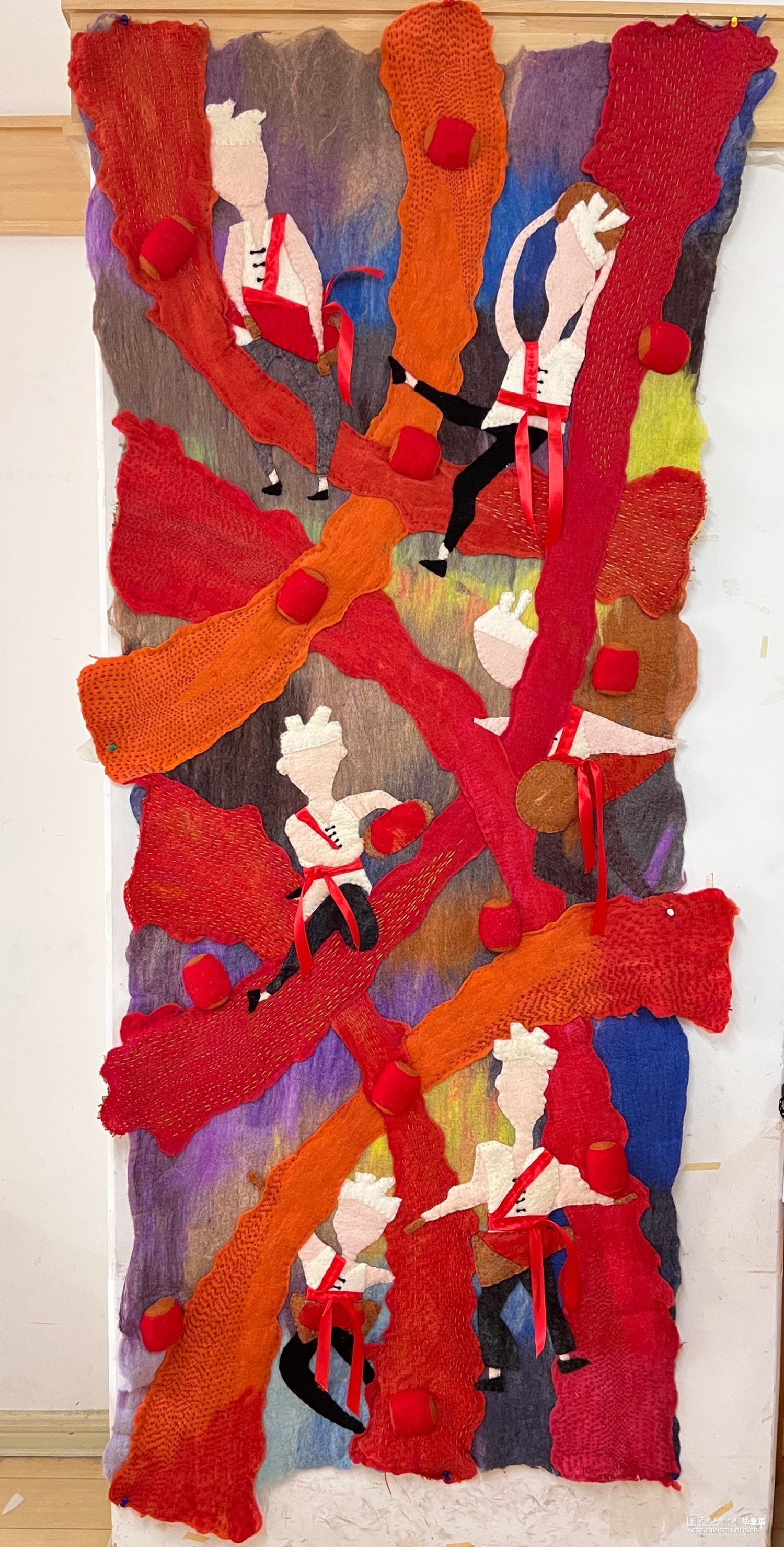 本作品将羊毛拉纤维艺术结合创新审美,表现安塞腰鼓在黄士地上发扬的场景。羊毛既是肌体也是色彩,其风格强健豪放,展示出西北黄士高原农民朴素、刚劲的性格,具有独特的美感。