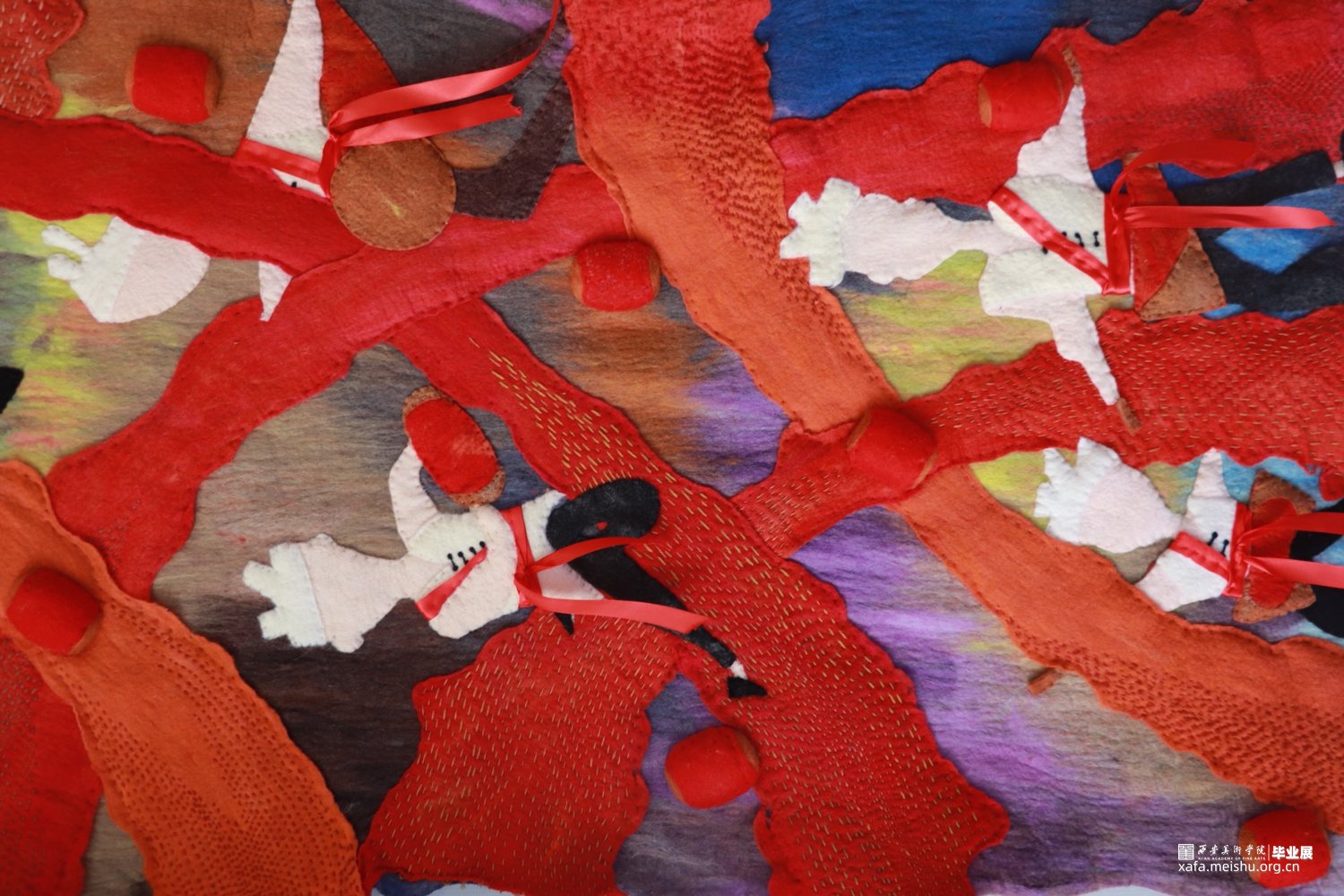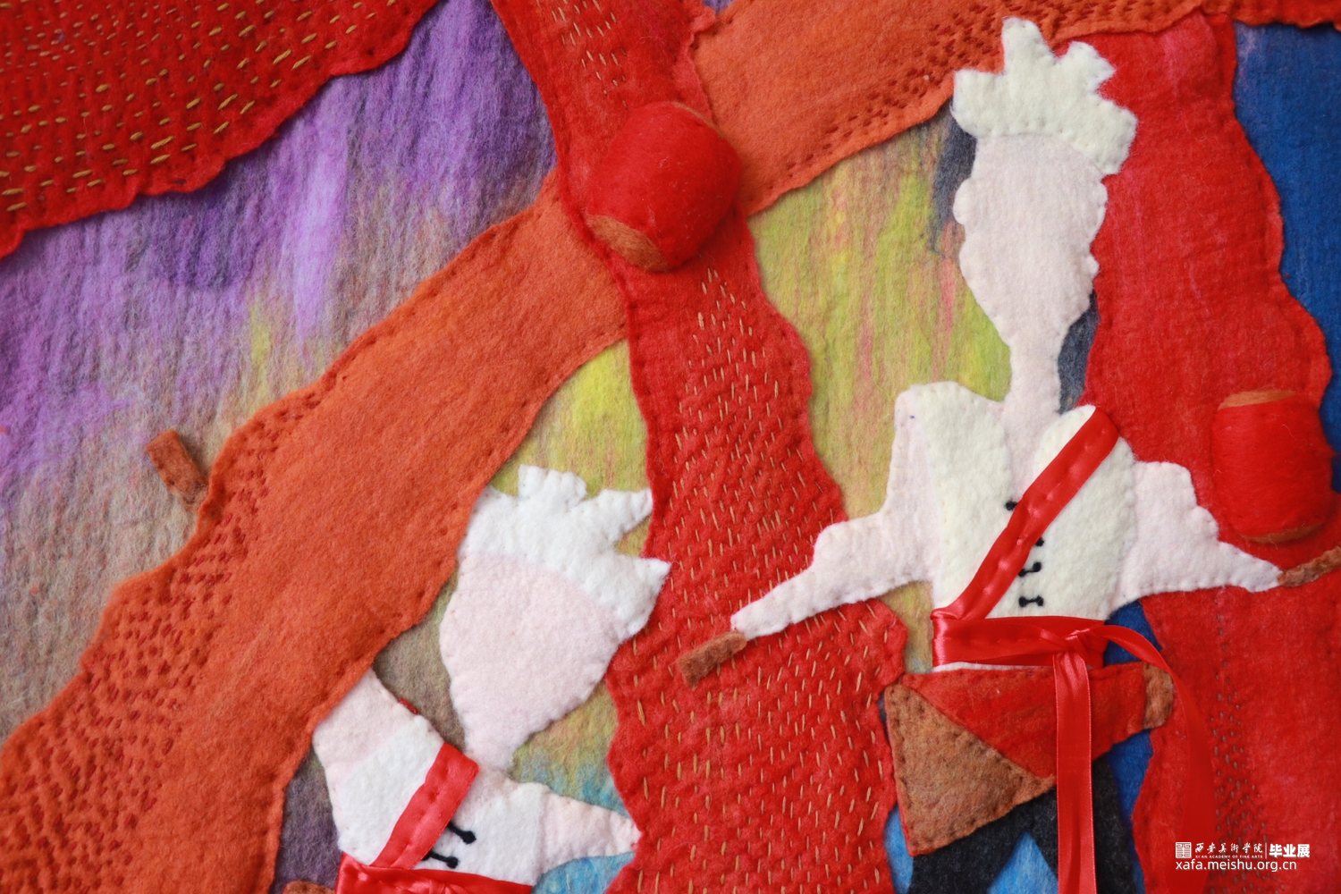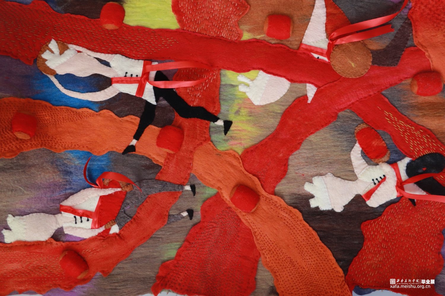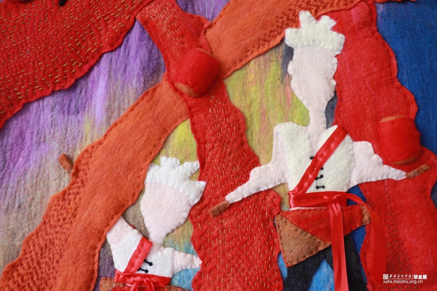本作品将羊毛拉纤维艺术结合创新审美,表现安塞腰鼓在黄士地上发扬的场景。羊毛既是肌体也是色彩,其风格强健豪放,展示出西北黄士高原农民朴素、刚劲的性格,具有独特的美感。