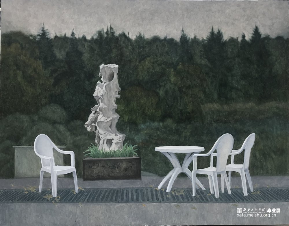 此幅作品是以一组白色桌椅为主题的创作。当下年轻人生活压力越来越大,节奏越来越快,在我们的日常生活中也很少有一个属于自己的闲暇时光。
