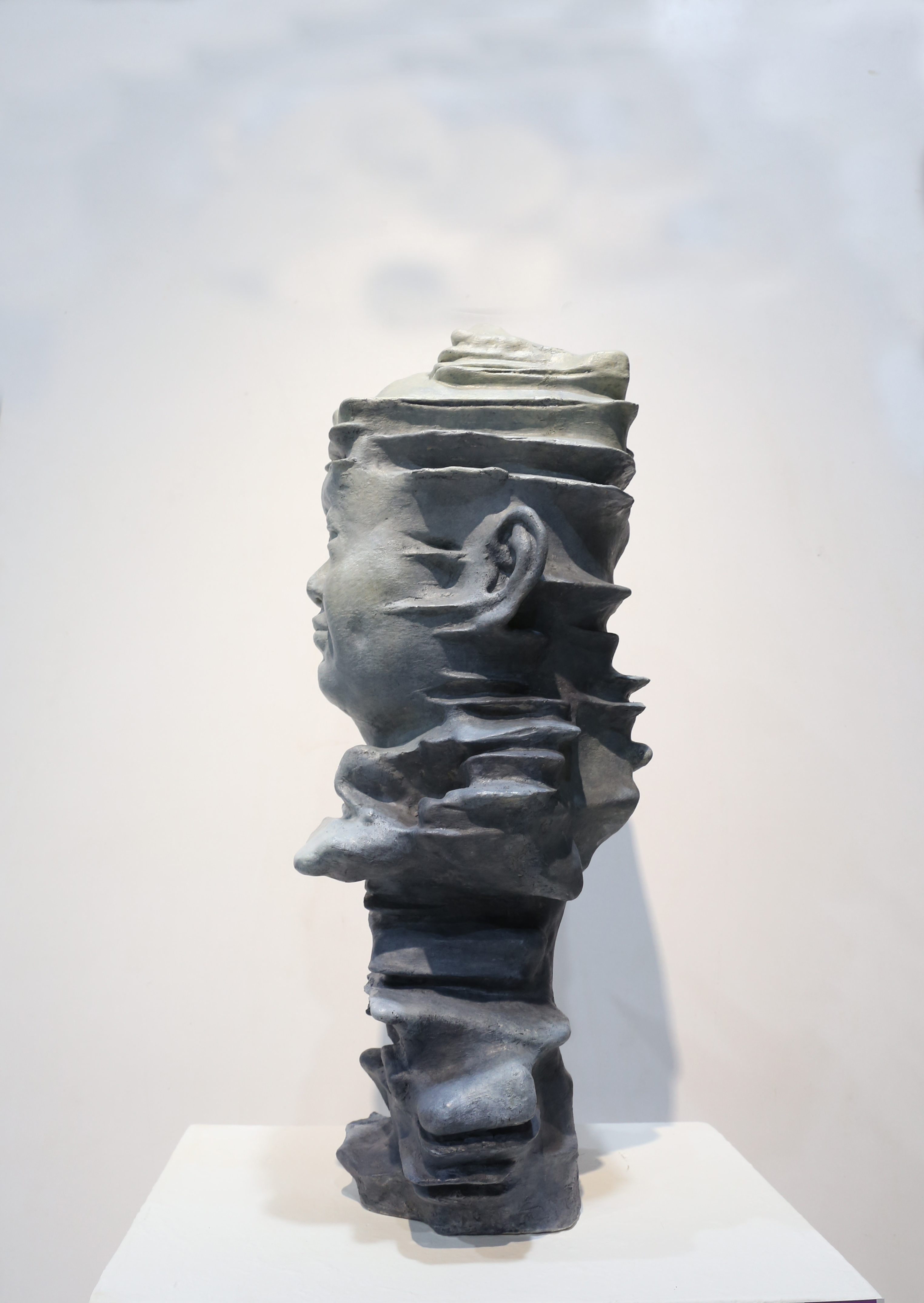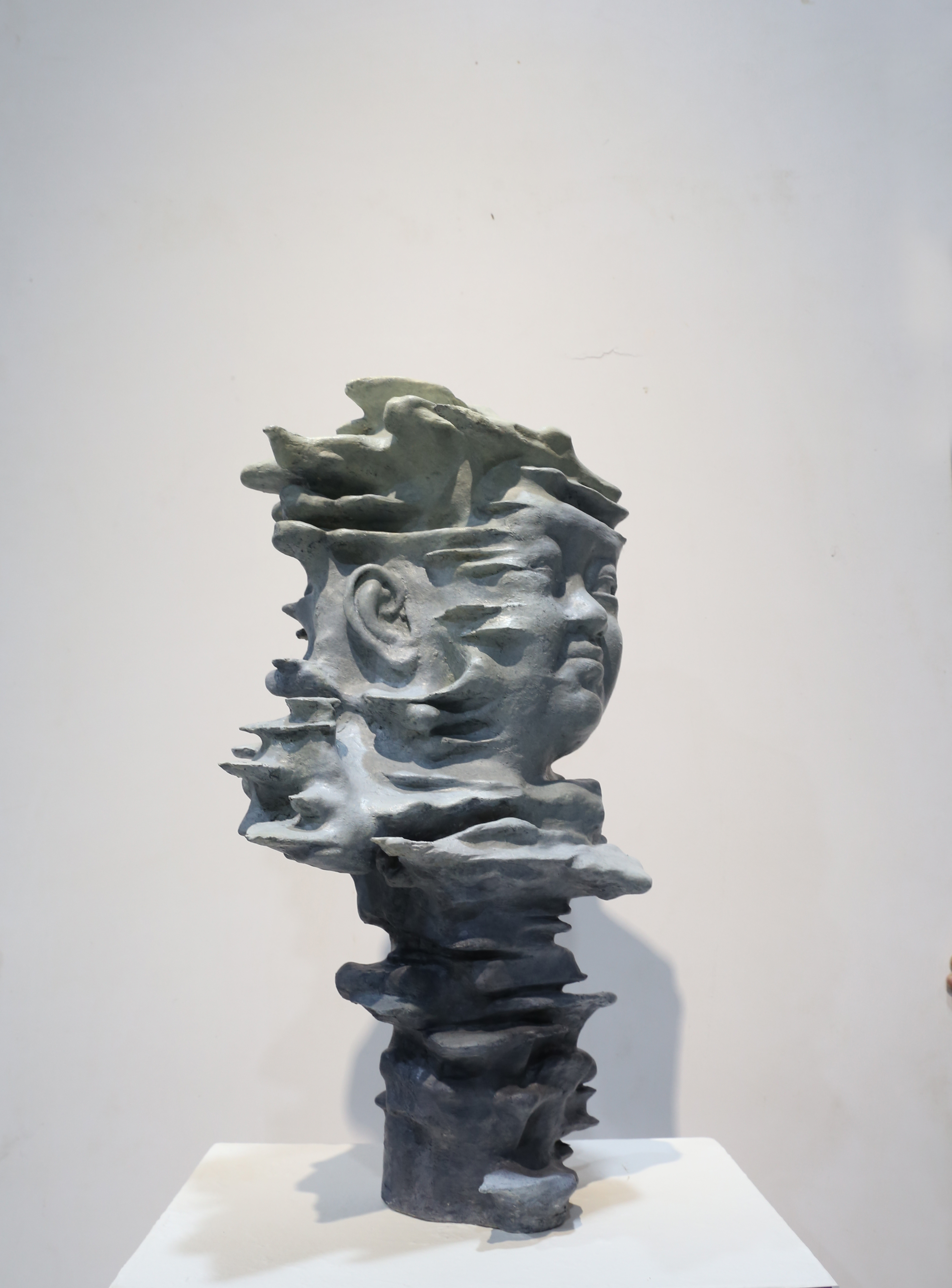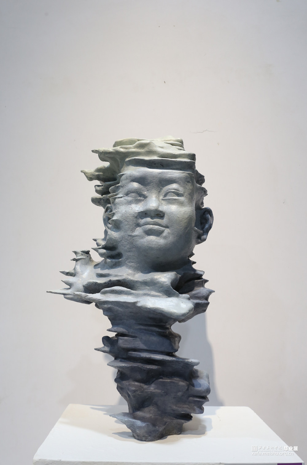 作品中我将戈壁滩上自然形成的风凌石和北方小男孩儿的形象结合在一起,不同地域的人有着不同的形象特征,通过对北方小孩的观察,我以北方的"大脸娃"为蓝本,结合自然形成的风凌石,通过这种神奇的自然现象,将北方小孩儿憨厚,朴实的特点展现出来。