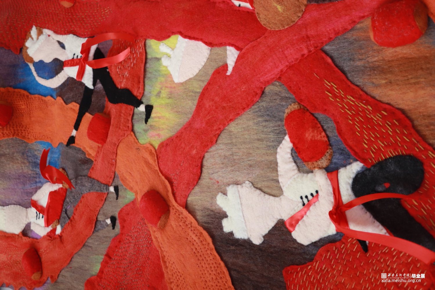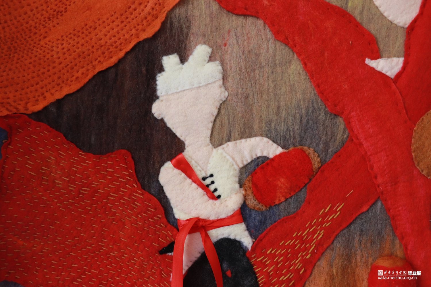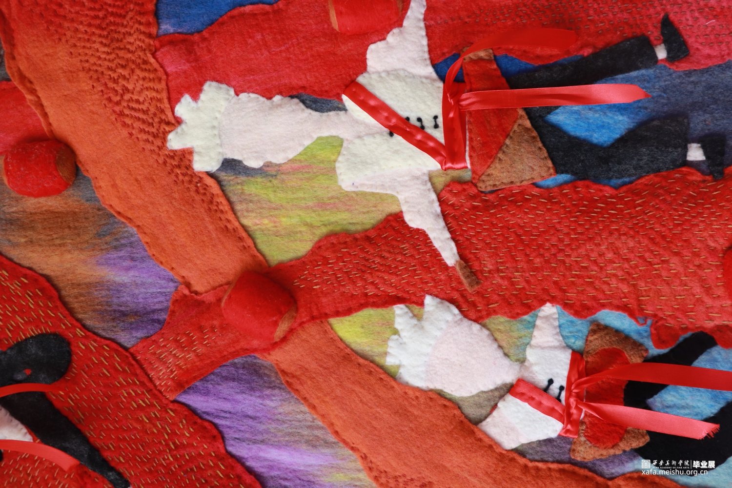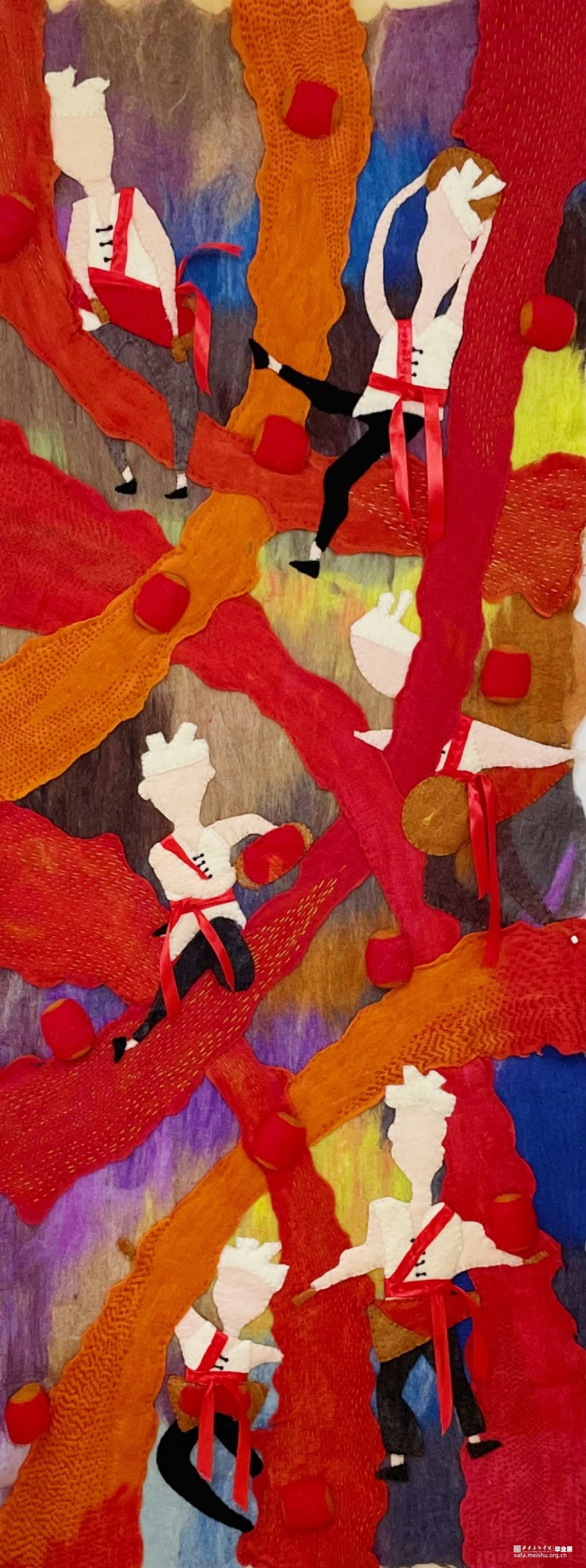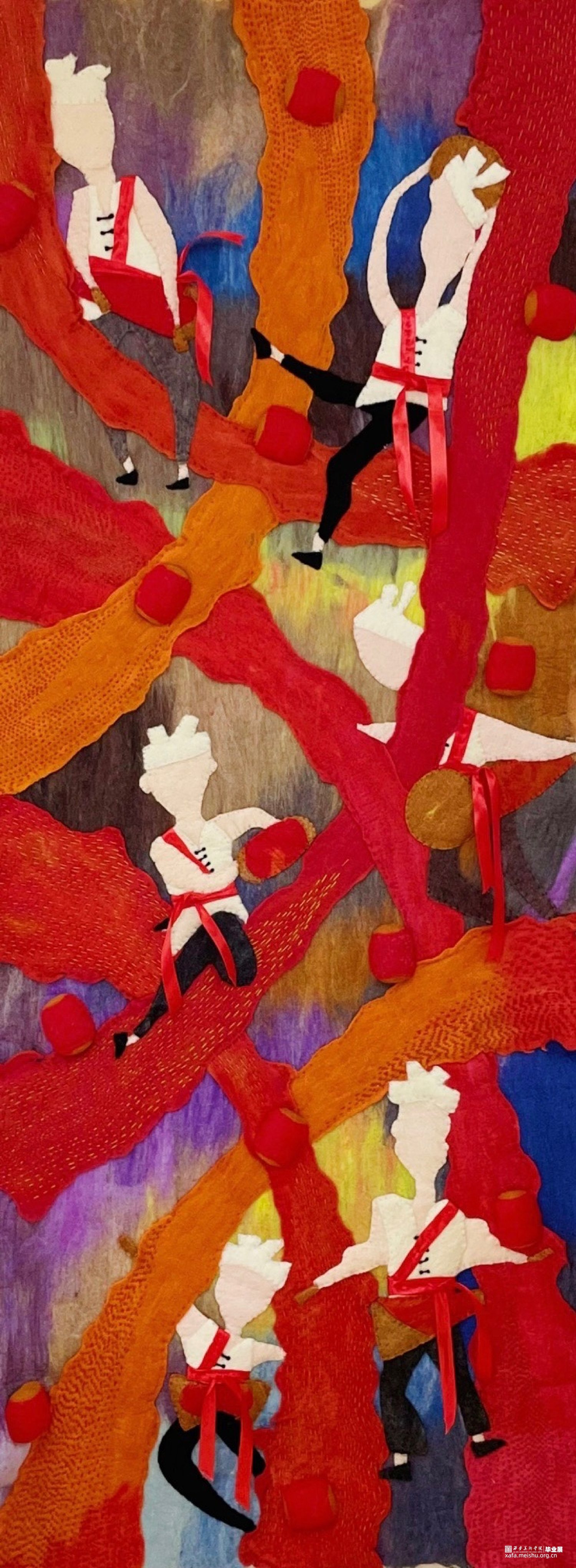 本作品将羊毛毡纤维艺术结合创新审美,表现安塞腰鼓在黄土地上发扬的场景。羊毛既是肌体也是色彩,其风格强健豪放,展示出西北黄土高原农民朴素、刚劲的性格,具有独特的美感。