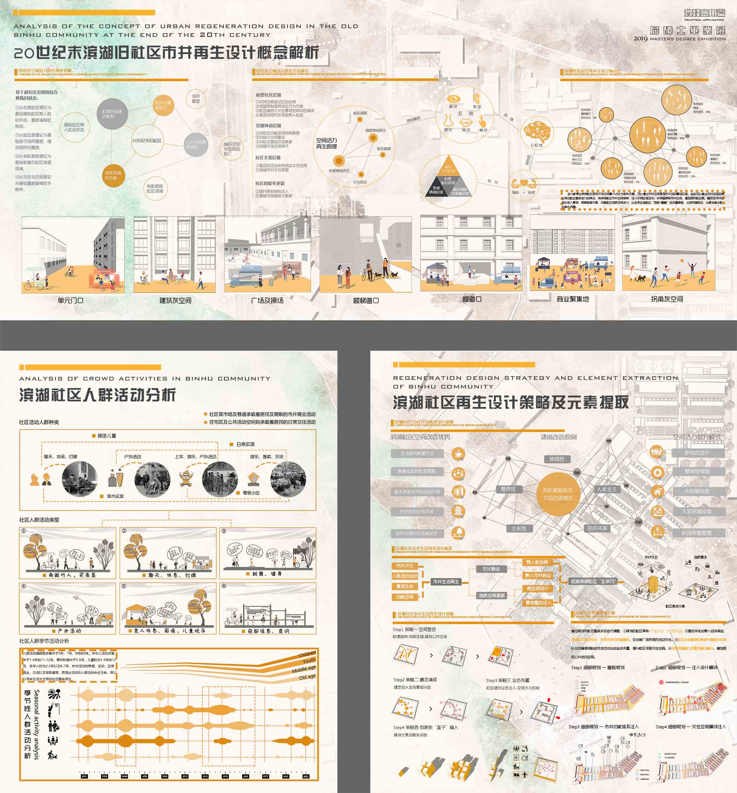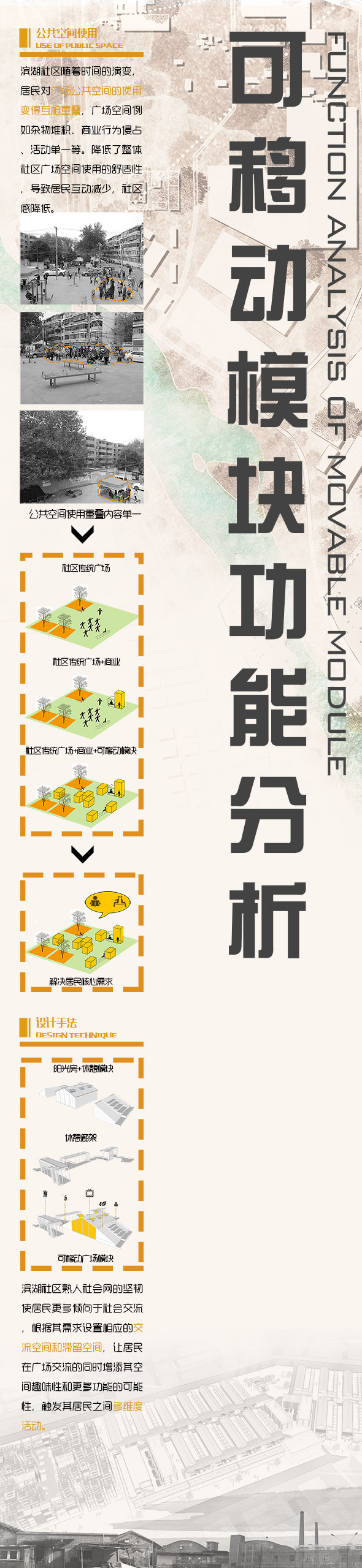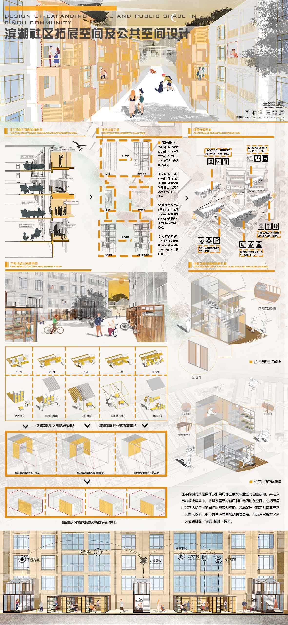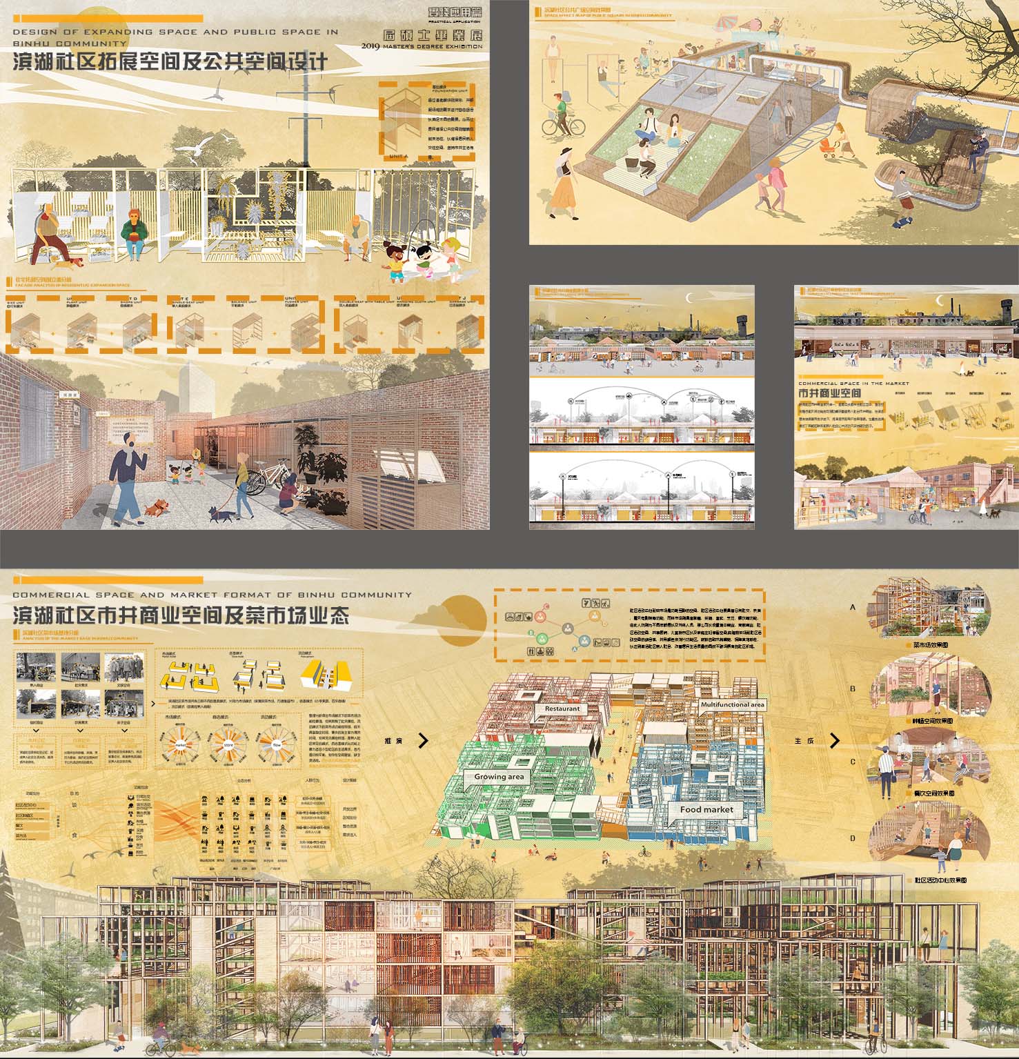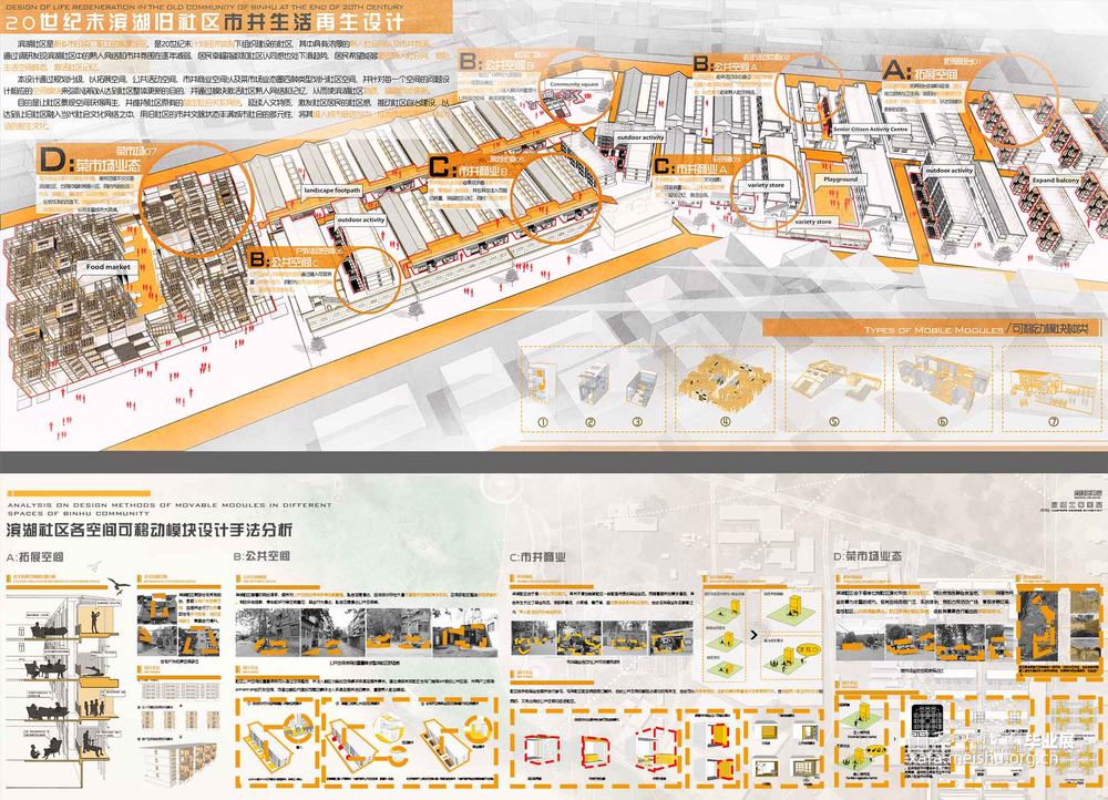 此设计通过对滨湖社区规划分级,以拓展空间、公共活动空间、市井商业空间以及菜市场业态圈四种类型划分社区空间,并针对每一个空间设计相应的空间模块来弥补缺陷以达到社区整体更新的目的,并通过模块激活社区熟人网络和记忆,从而使滨湖社区物质、精神同步更新。