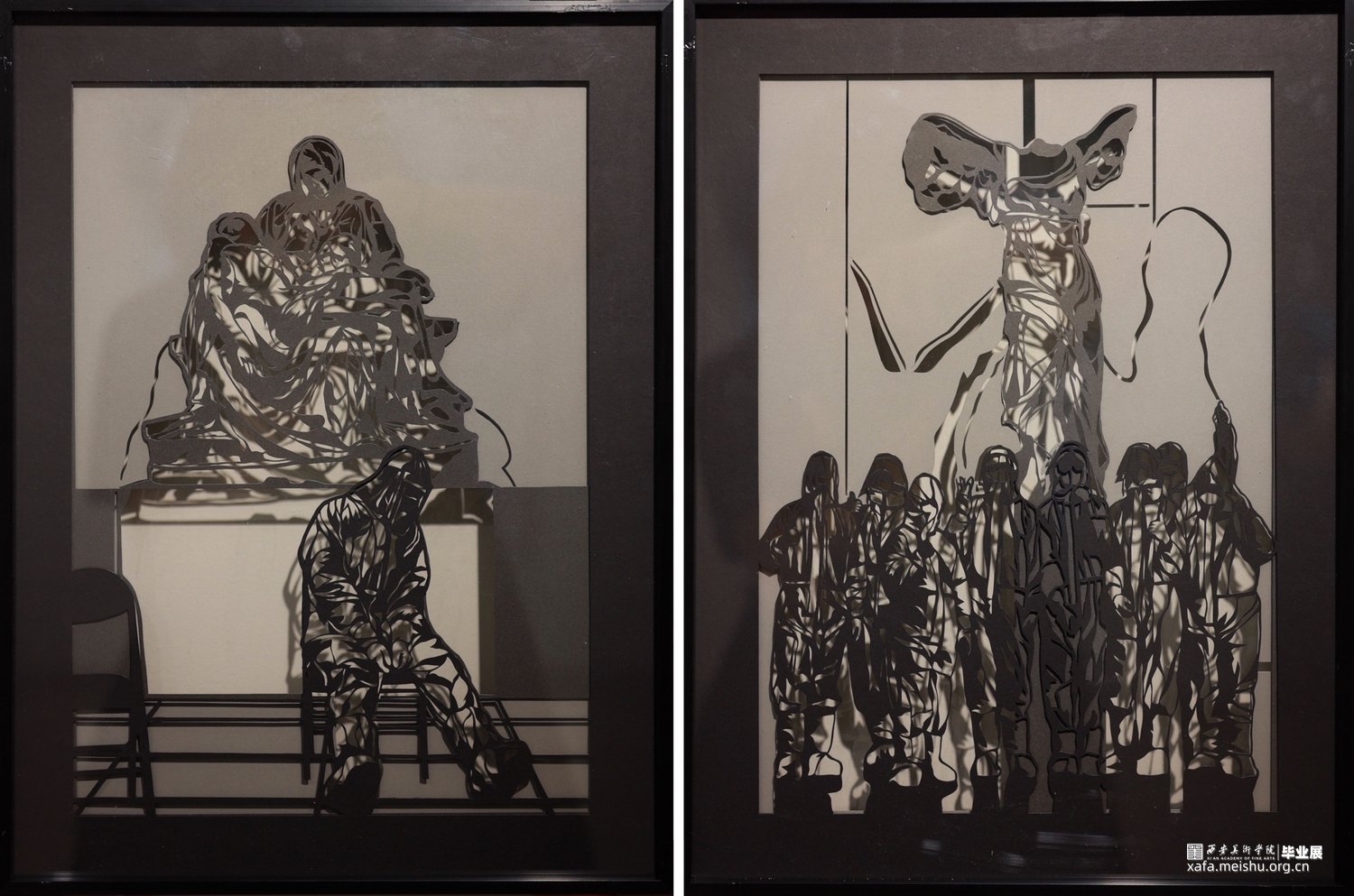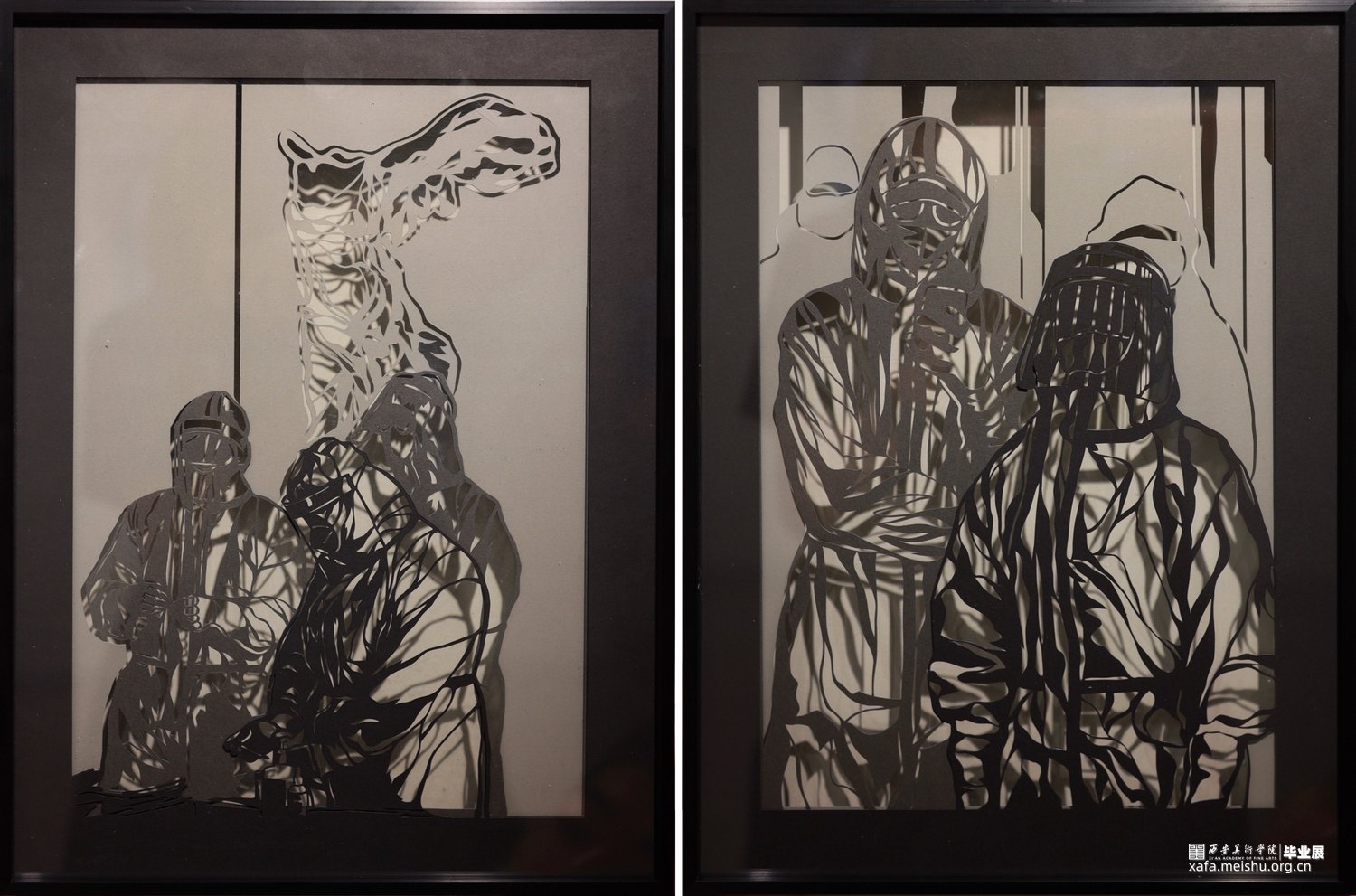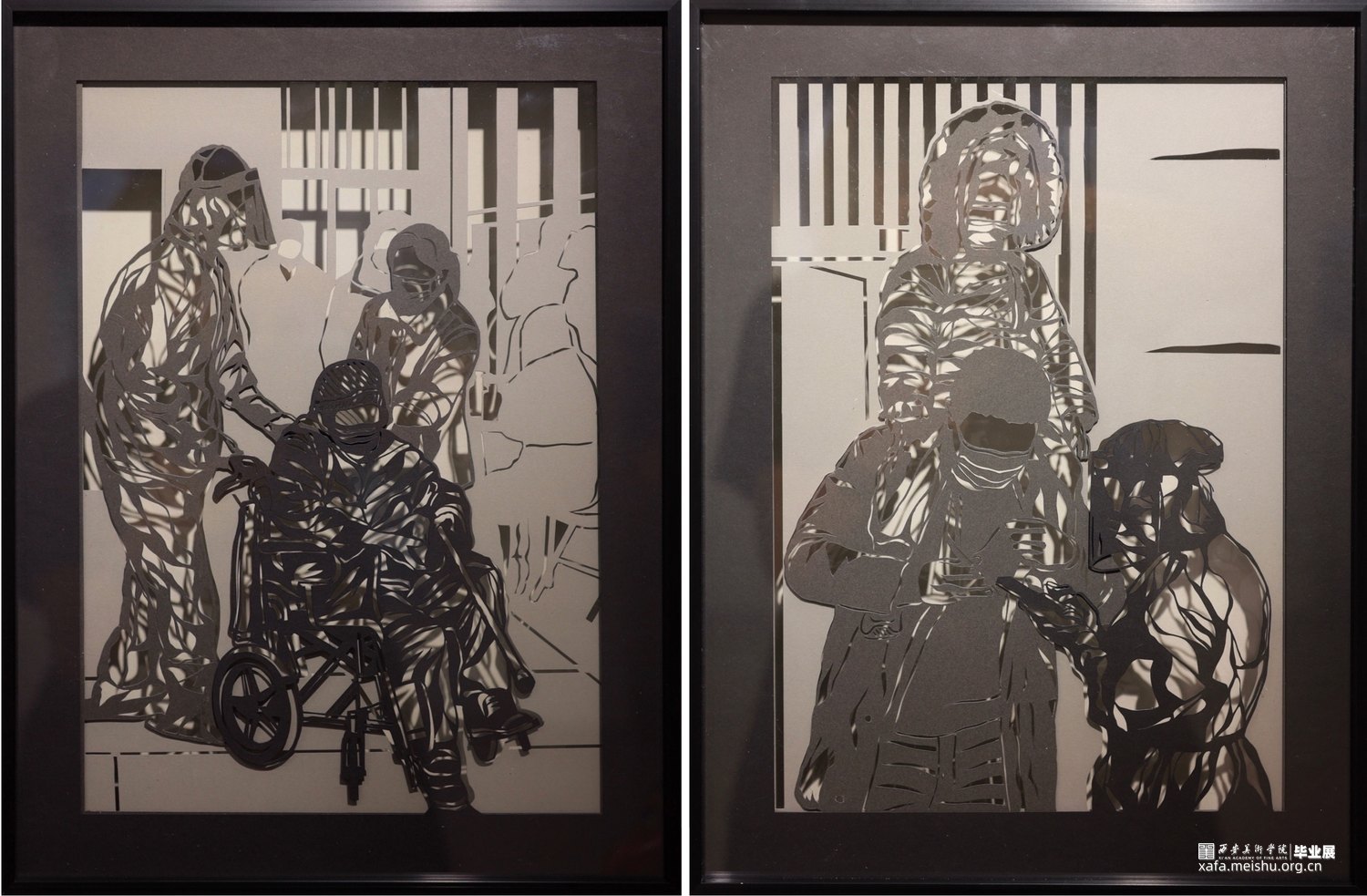 《让我再看你一眼》系列剪纸作品以今年年初西安新型冠状病毒肺炎爆发为背景,面对突如其来的疫情,美院的学子们投身到抗疫一线的队伍中。在封城封校的三十多天里累计做了二十多次核酸检测,本人有幸加入到志愿者行列,成为大白中的一员。这次毕设特地选择用现代剪纸的方式记录下抗疫中的西美人,他们不畏艰险,冒着严寒为大家服务,同时也出现了许多令人动容的温暖场面和瞬间。