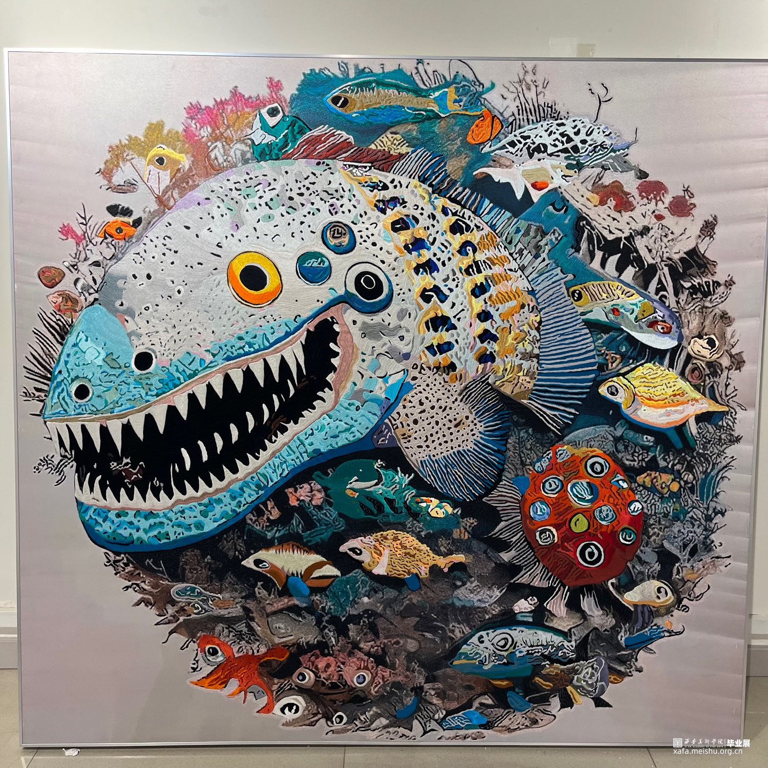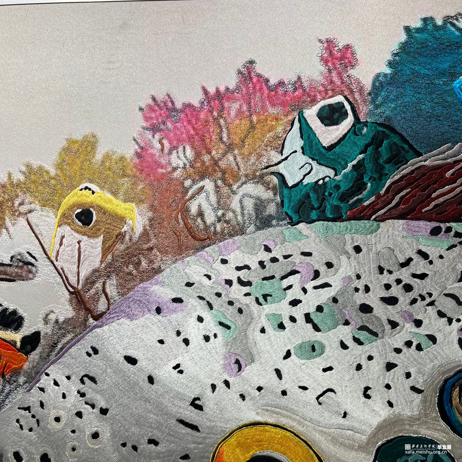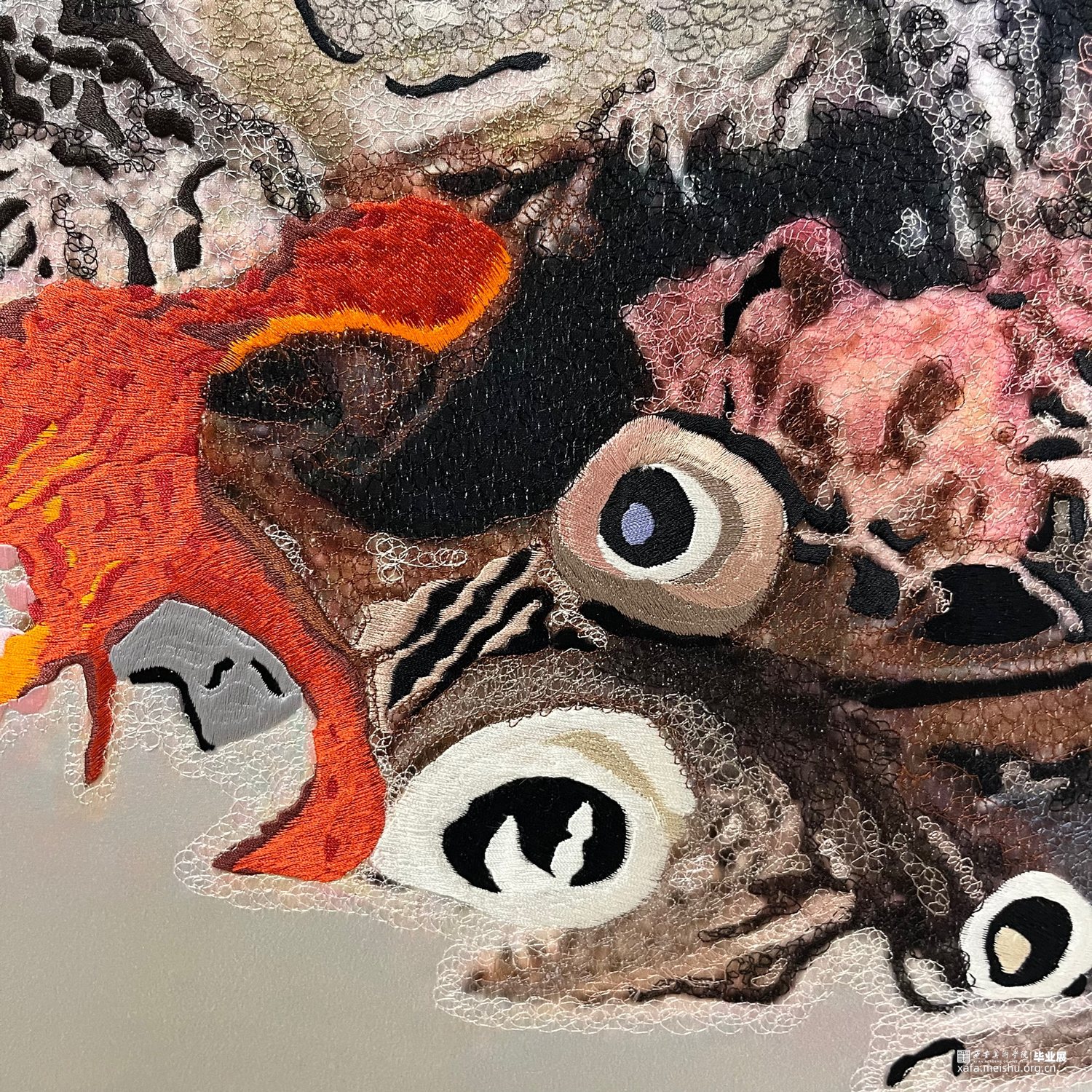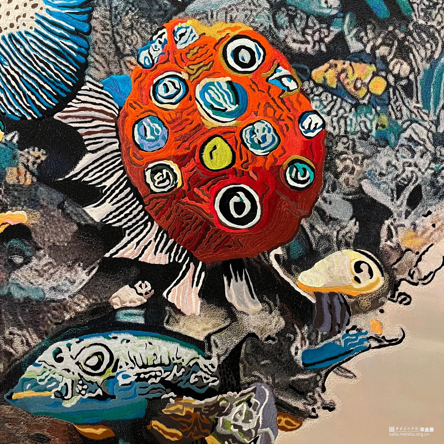 本作品展现了海洋生物因遭受了污染进行了各种奇异的变化。用刺绣工艺的手法展现出海洋生物的异变,用夸张的视觉效果给观众以警示。