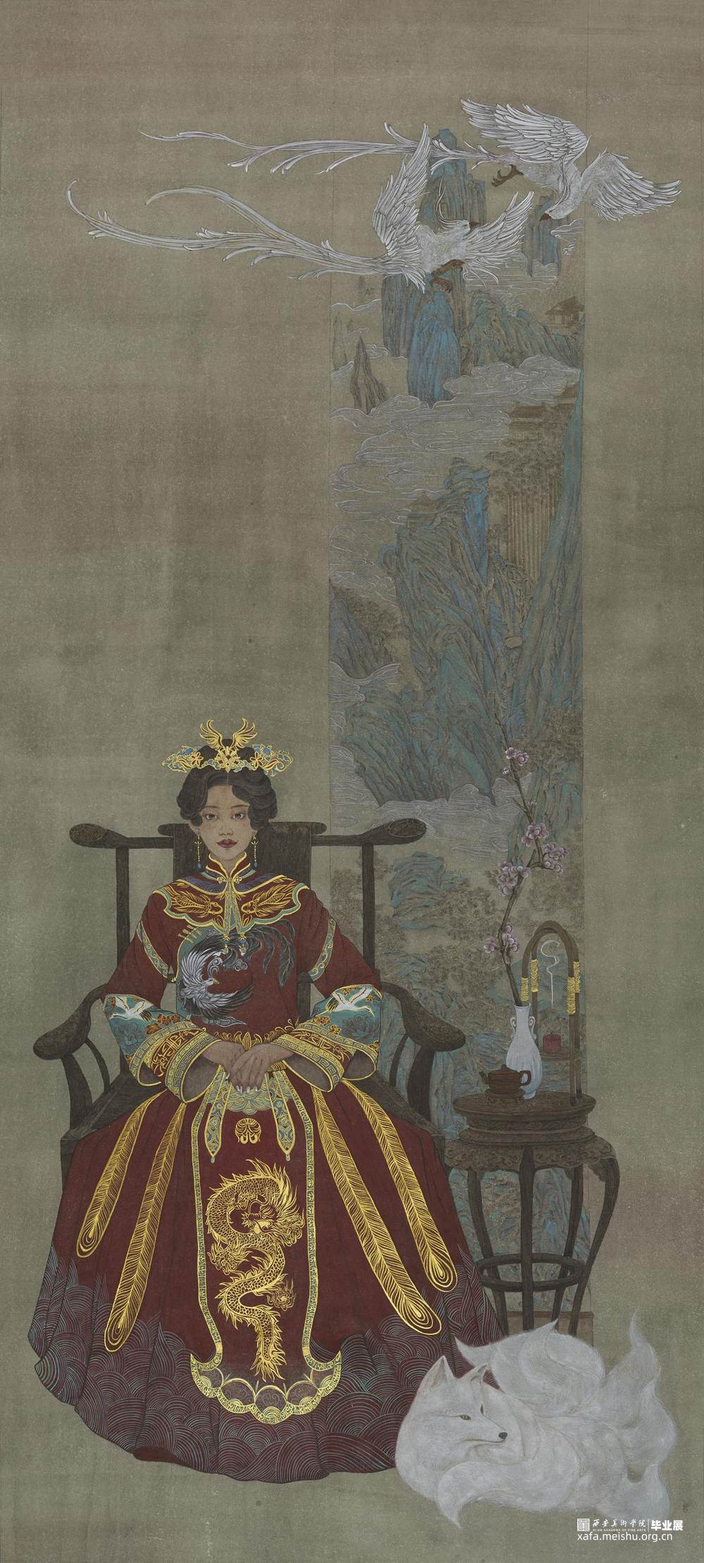 “一方墨侯,两联湖笔,三点朱砂画红妆”是这幅画的创作过程,自古以来,多少热血男儿镇江山,多少痴情女子守红妆,这幅画就以红妆为主,山海经中的珍奇异兽为辅,让更多人了解中国传统文化之美