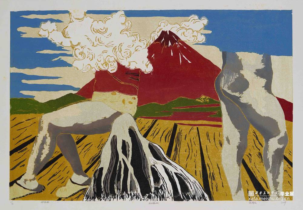 本作品由绝版套色木刻技法完成,共三张画共表现为气味的系列!自己对于口、足、腚感受不同,所以表现的画面颜色感受和冲击力也截然不同!有的颜色热烈很有冲击力,有的颜色明度饱和度低,传递一种五味杂陈的感觉,外加一些室外的风景从而体现一种画面环境感!在其中两幅画中都出现了火山,是因为想用火山爆发来表达这种味道给我的冲击感和爆发力!