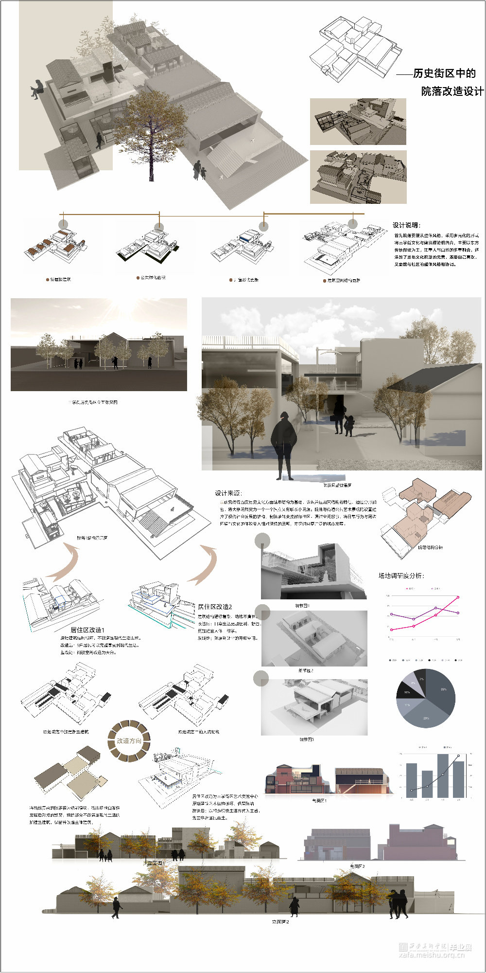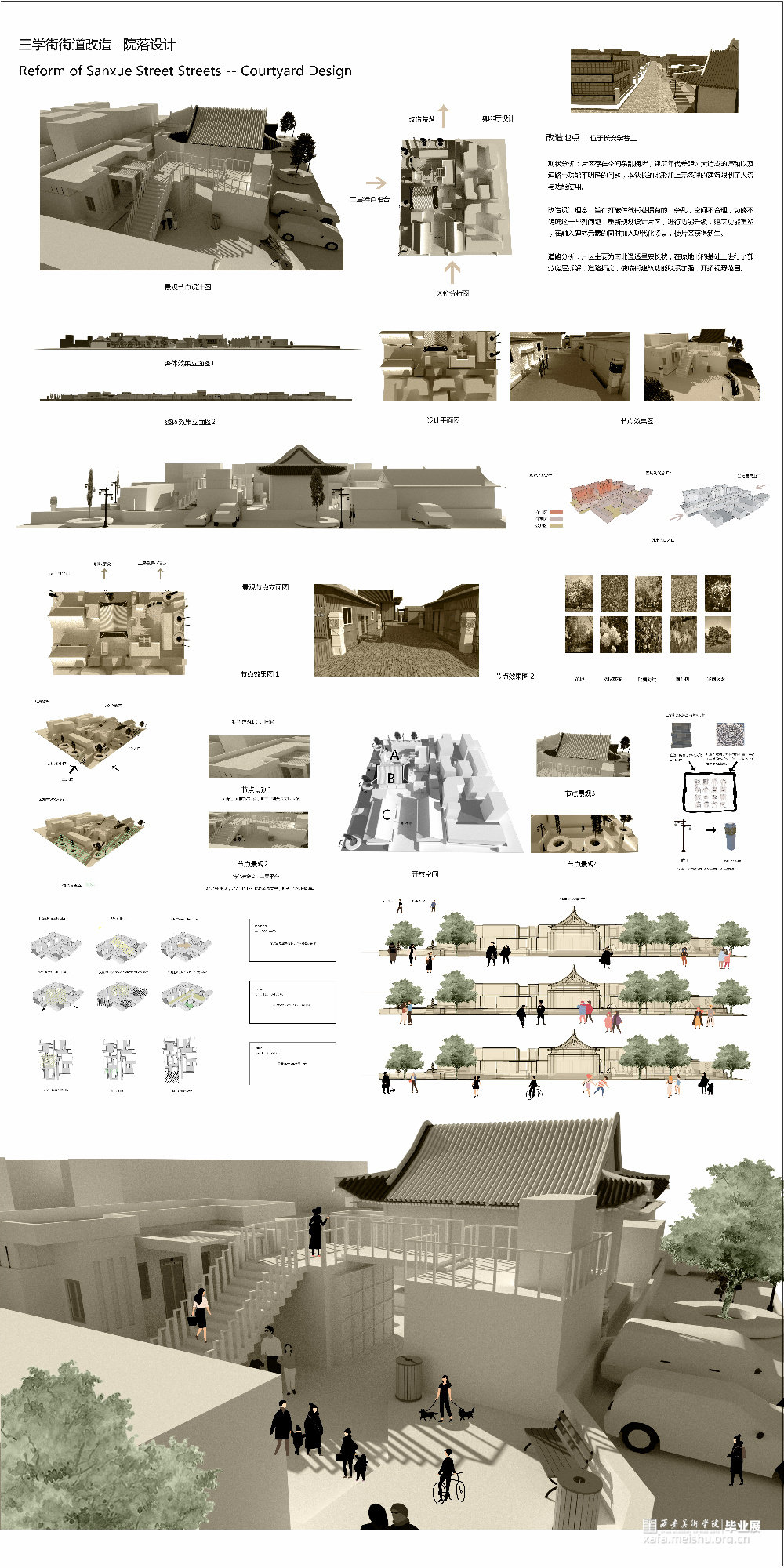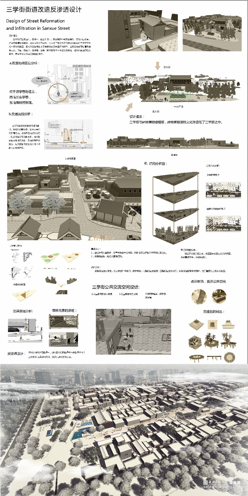 人口结构的适应性调整问题、生活空间和环境质量问题、风貌传承问题,是旧城更新进程中长期存在的三道棘手难题。西安市三学街历史街区环境景观提升设计的核心,在于充分了解场地本身的历史重要性与人的日常生活之间的关系。以客观辨证的角度看待该街区中长期存在的自发性建造与自发性更新现象;在尊重当下人们生活的同时,把握关键的设计要素,将碑林文化与旧城风貌环境景观设计渗透进场地节点中,从而以点线面的形式形成环境设计的影响力辐射范围。