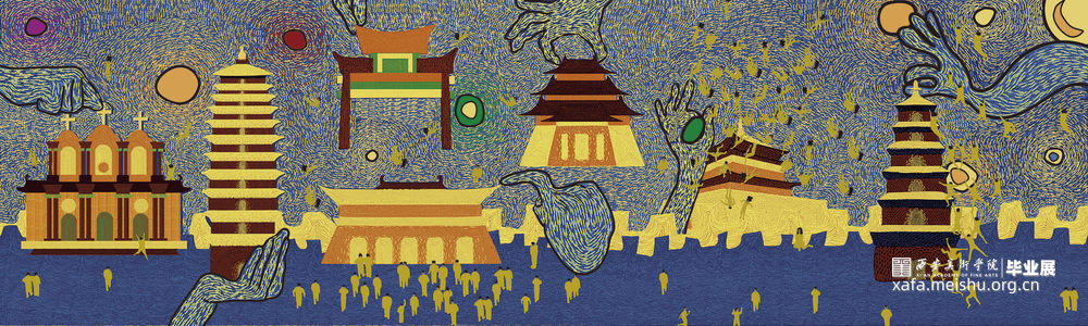 将梵高《星月夜》与电子媒介插画结合起来,通过表现西安的著名地标性建筑,表现与大众眼里不一样的长安夜。