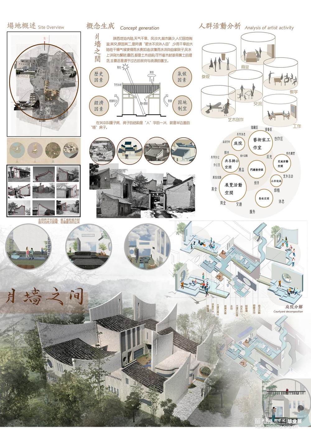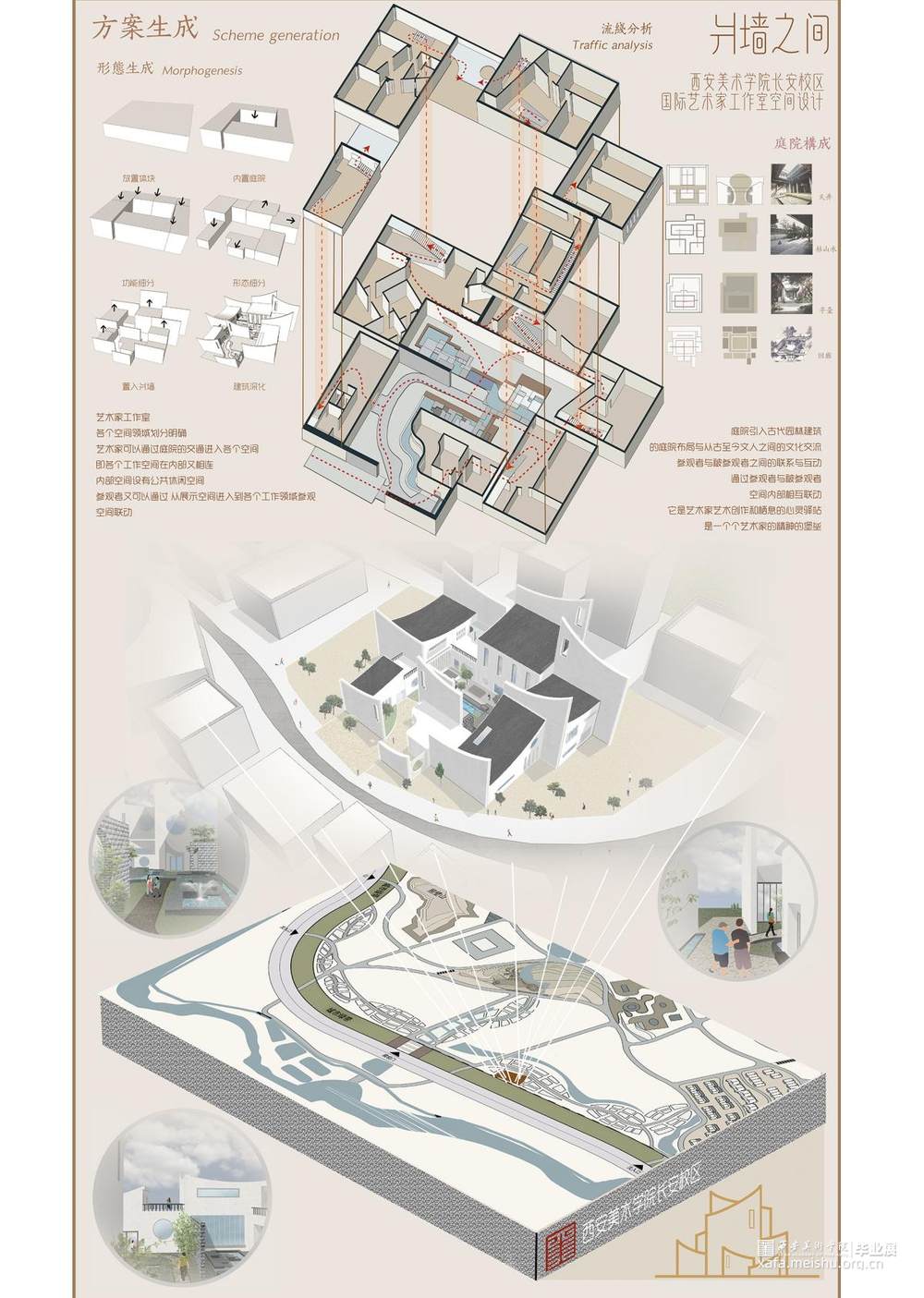 通过对关中地区民居的特征形式语言的探究,如何传承与发展传统民居的特色,成为本文的所关注的重要方向。以西安美术学院长安校区国际艺术家工作室为设计语境,与其功能内容相结合,浓缩出“爿墙之间”的设计语汇,是传统建筑特性元素与现代艺术功能之间叠加的诠释与脚注。运用爿墙的元素将空间划分为不同的艺术专业需求板块,以有机开放的庭院将多样化艺术空间并联,形成丰富多样空间的同时,又赋予艺术工作室实至名归的艺术样貌。