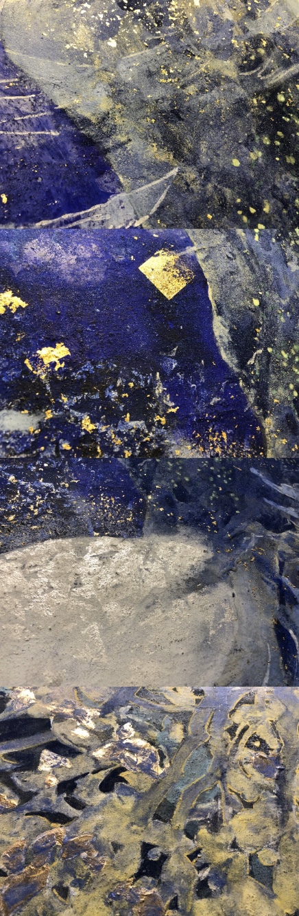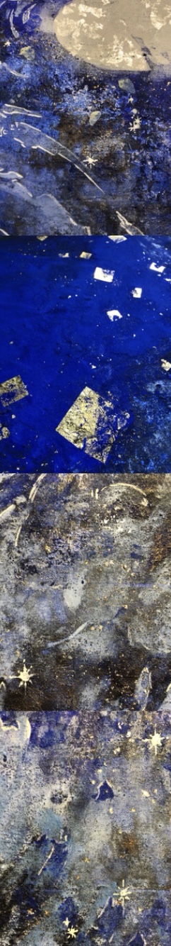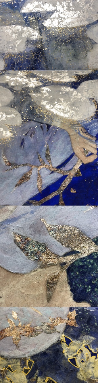 水承载着世界的一切,是万物起始的源泉。发光的荷叶和淡色的水波暗示水面的分界,用倒影的形式表达映射在水中的架空世界。以古老玉石青金石的颜色为主色调,奠定水与宇宙与万物之间联系的基调。金黄的光穿过生命之树,树下是有一丝神话味道,象征人类的女性形象。撷过一枝枝头轻轻亲吻,底下是蔚蓝的草地,透过小小的叙事性达成人与自然之间微妙的平衡。后方的日食,金箔形成的银河与前方的命运之轮相对应,不论处于混沌的暗还是星辰的明,生命依然是无尽的,万物从水中不断起源生长。