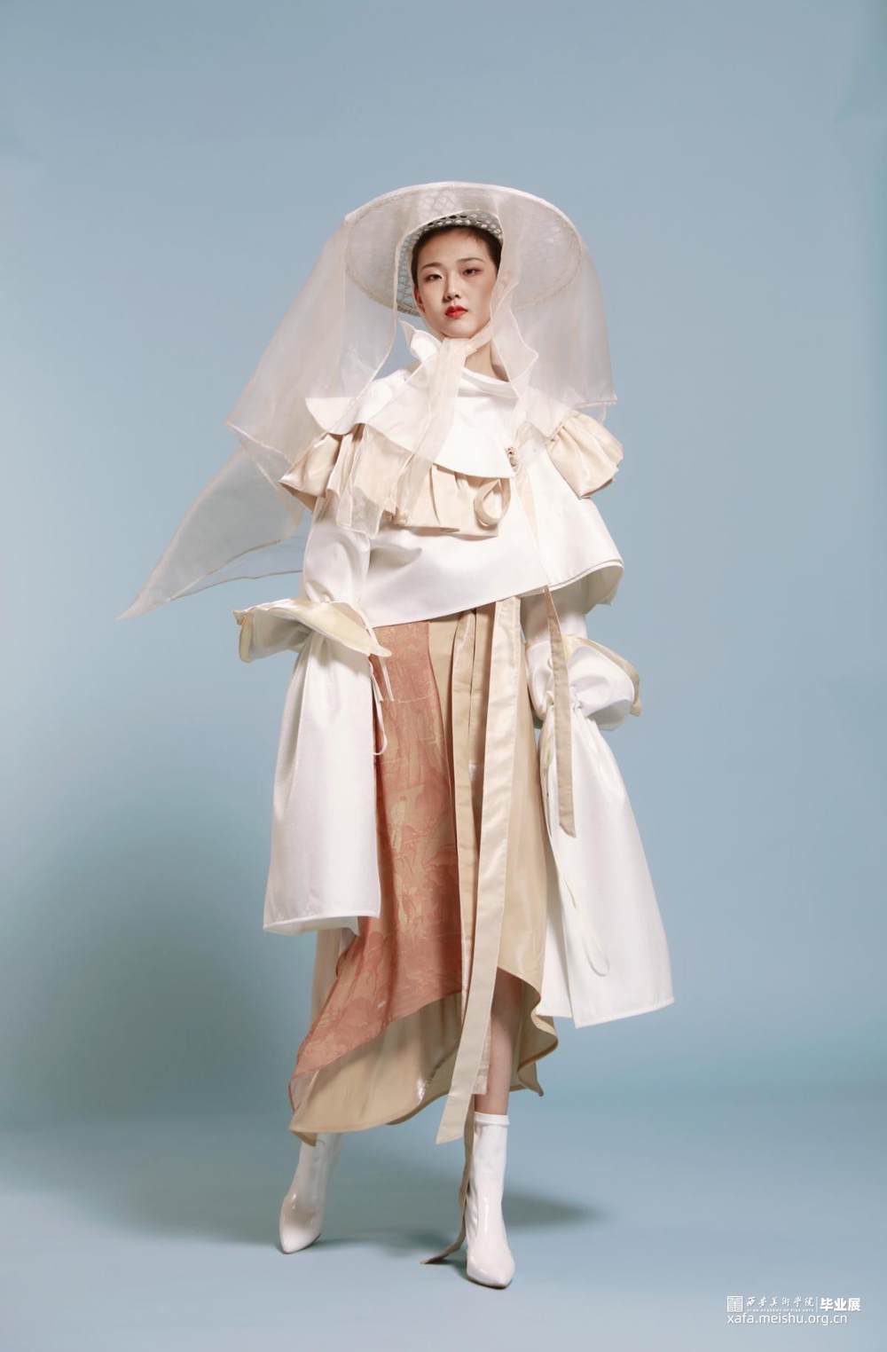 抽象性思维去解读唐代带帷帽的女性,在我看来,古代被社会封建思想要求佩戴帷帽的女性,是女性与世界的一种关系,饱含着压迫与反抗,强势与柔弱层层叠叠的紧密联系,因此结构中运用了重复的面料堆积手法,整体的造型中强与弱的对比,疏密有致的节奏感形成巧妙的律动。