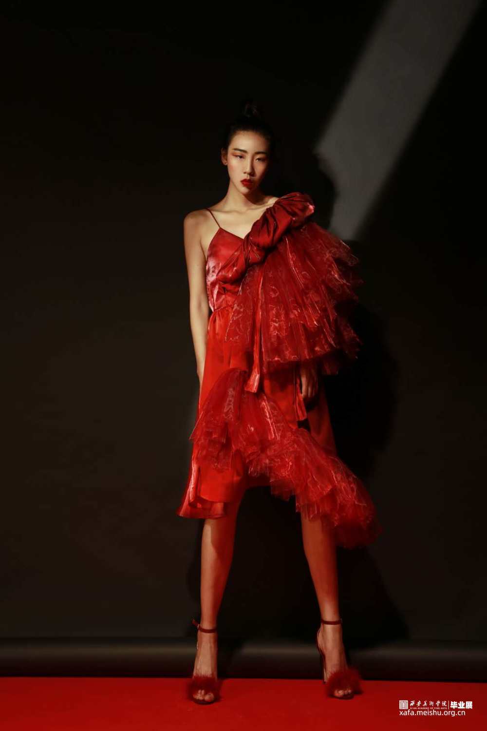 第三套的基底我用了较为现代的小礼服裙,但是左右仍沿用第二套的不对称设计,用纱堆积出廓形呼应了中晚唐服饰中追求夸张,开放的时风,色彩上用了砖红和酒红拼色,一个偏冷调,一个较暖,融合但不相同,也暗含了我对这一时代的理解。右侧的堆积纱具有节奏感玩味随意的堆积是这一套的亮点所在,我想让它与中晚唐时期政治压迫带来的人们纸醉金迷以逃避现实的社会环境产生联系。