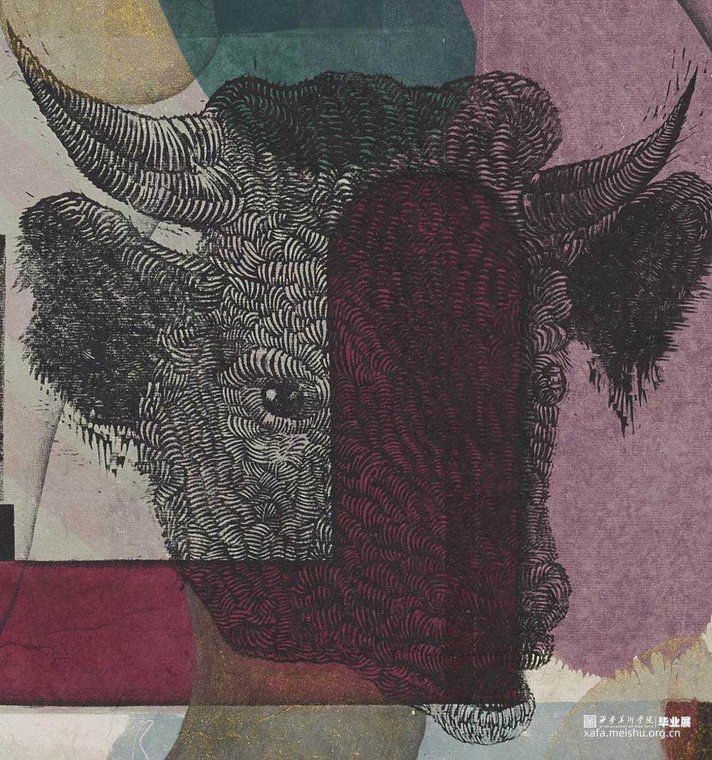 《交流》系列作品主要画面构成元素有牛头、代表女性的线条、具有象征意义几何图案,通过木版版画和手绘线条的结合、叠加,通过手绘的女性线条大大增加了创作感性思维,并且对于画面来说可以不停的去完善画面语言、表达自己的想法,之所以将牛和女性结合起来源于他们彼此的相通点,牛和女性在我的世界里是感性与理性的并存,他们面对命运选择与被选择时的坚强、柔和、理智的“顺从”,跟我想表达女性自我独立的想法相契合。