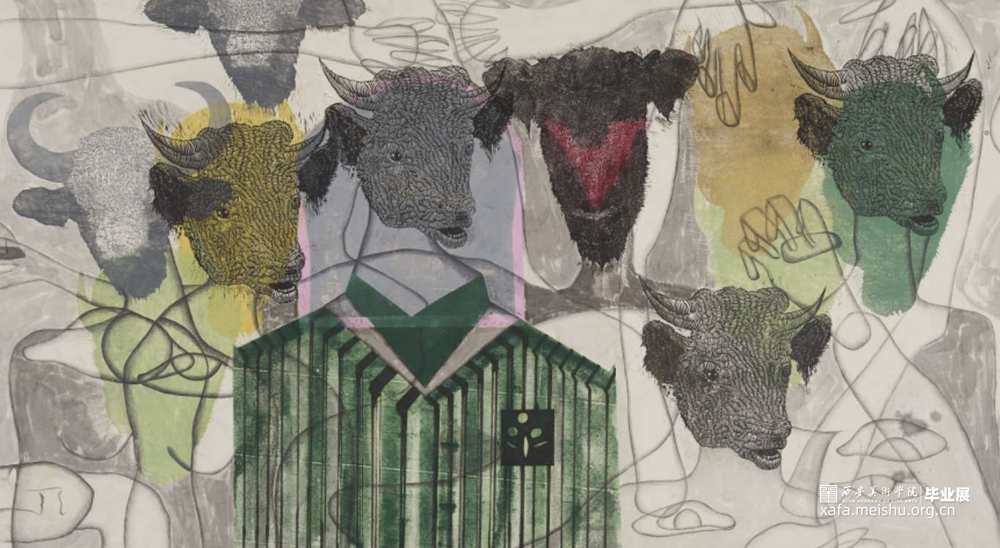 《交流》系列作品主要画面构成元素有牛头、代表女性的线条、具有象征意义几何图案,通过木版版画和手绘线条的结合、叠加,通过手绘的女性线条大大增加了创作感性思维,并且对于画面来说可以不停的去完善画面语言、表达自己的想法,之所以将牛和女性结合起来源于他们彼此的相通点,牛和女性在我的世界里是感性与理性的并存,他们面对命运选择与被选择时的坚强、柔和、理智的“顺从”,跟我想表达女性自我独立的想法相契合。