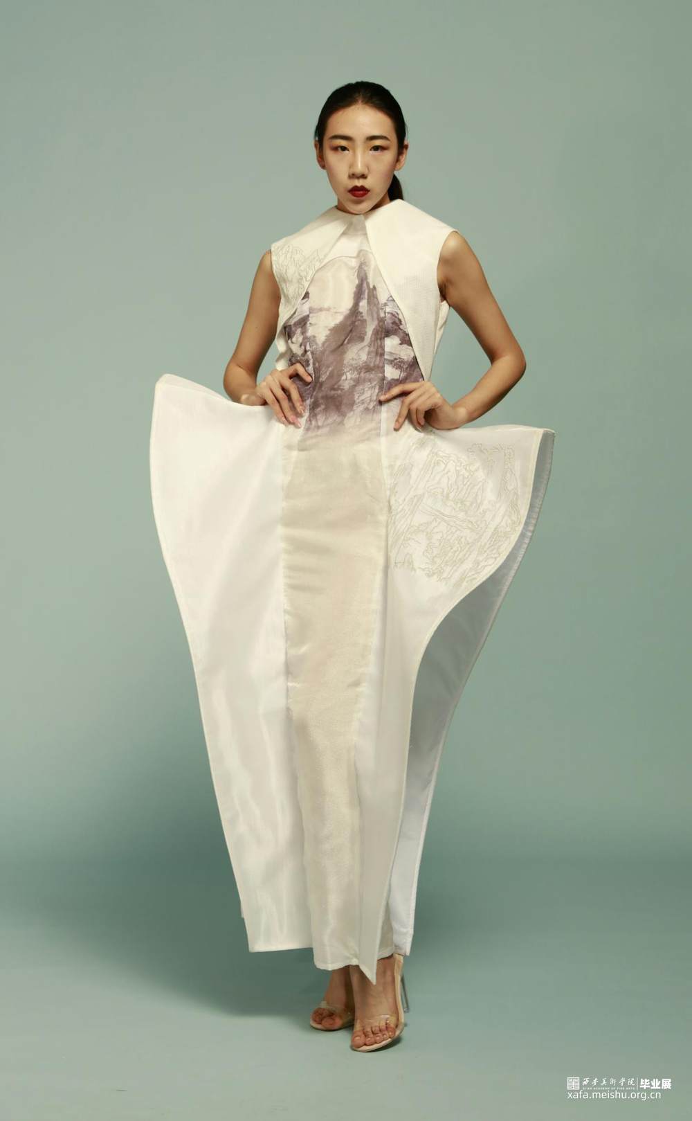 以唐代白瓷元素为出发点,浅析其在现代服装中的应用。在学习和研究唐代白瓷发展历程与特点后,将白瓷的阔型与人体曲线相结合,并融入五行说中的“白山黑水”,图案采用的是中国画,用热转印和机绣的手段去表达,从而完成整个系列作品的创作。是对于传统文化的继承与延续。