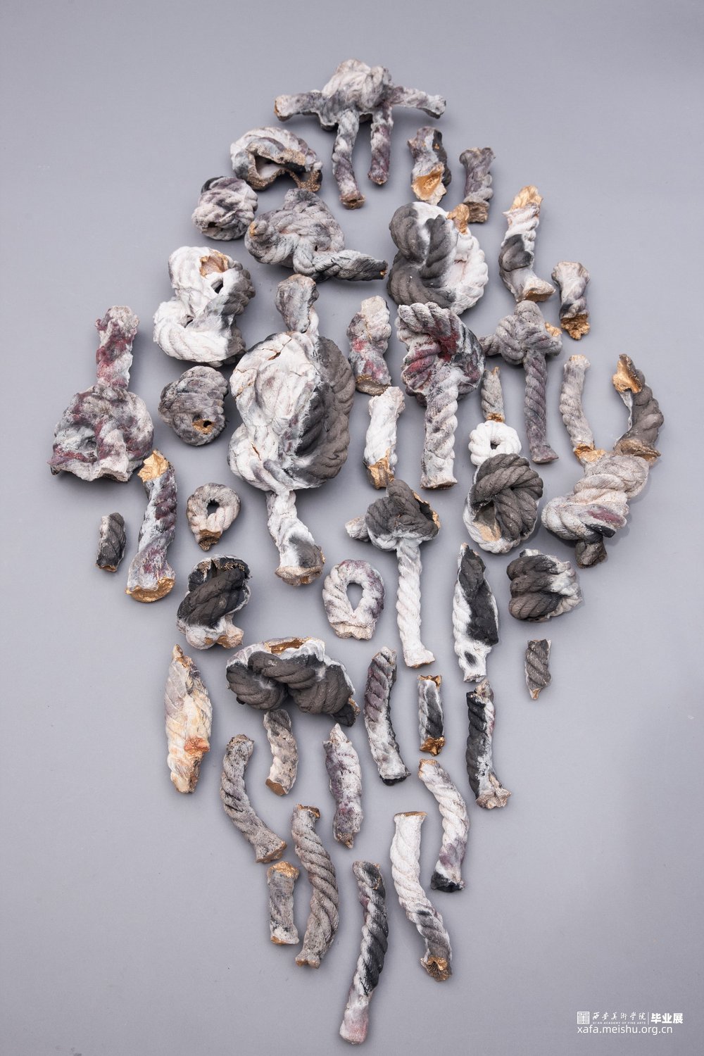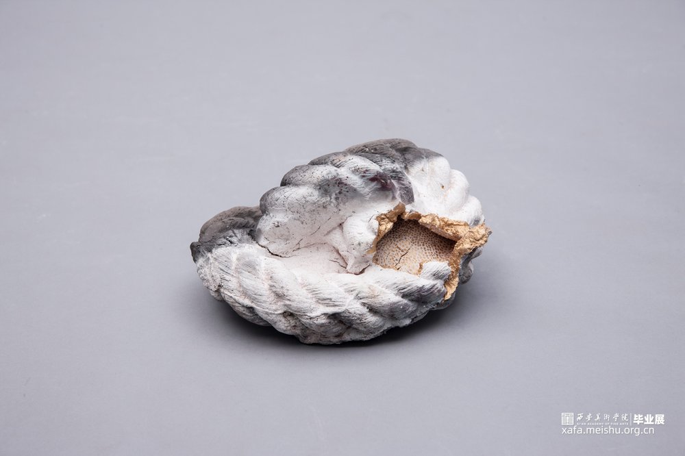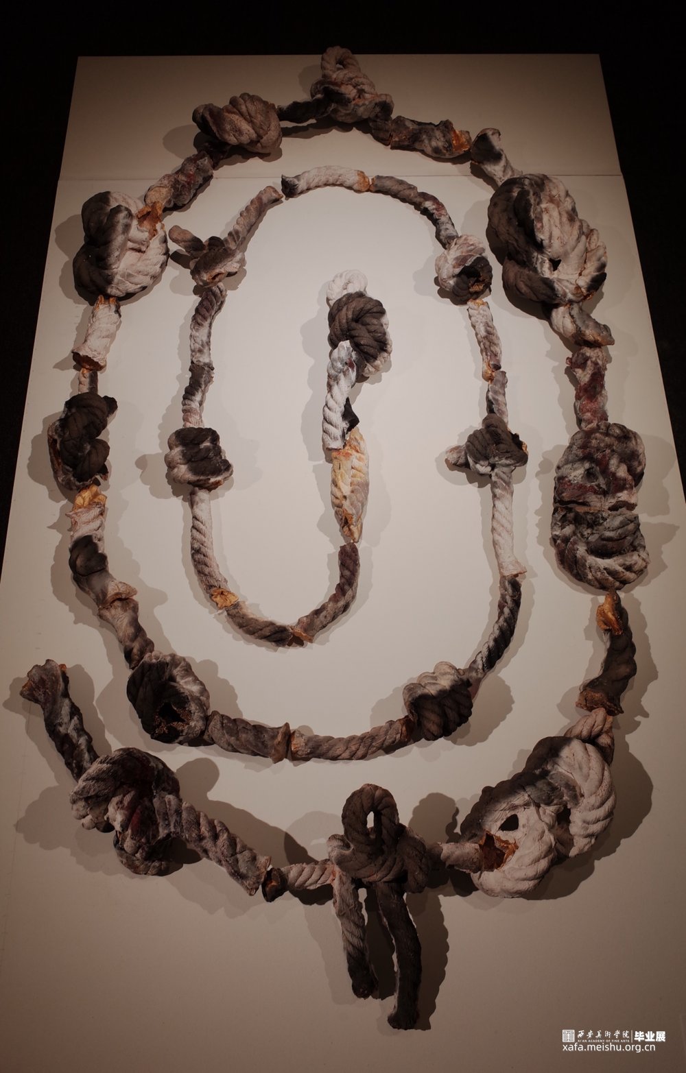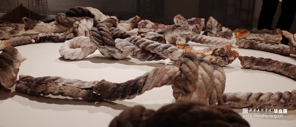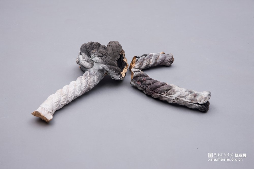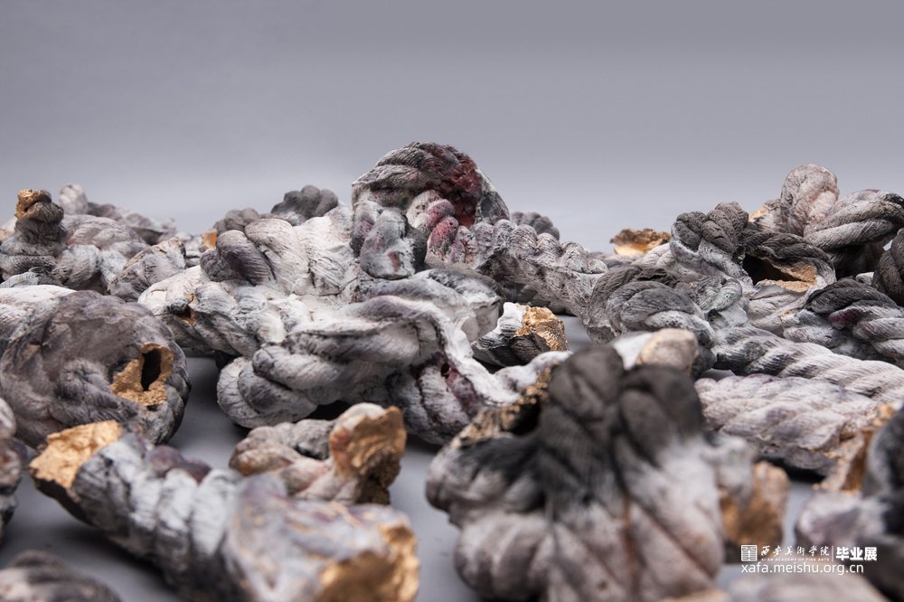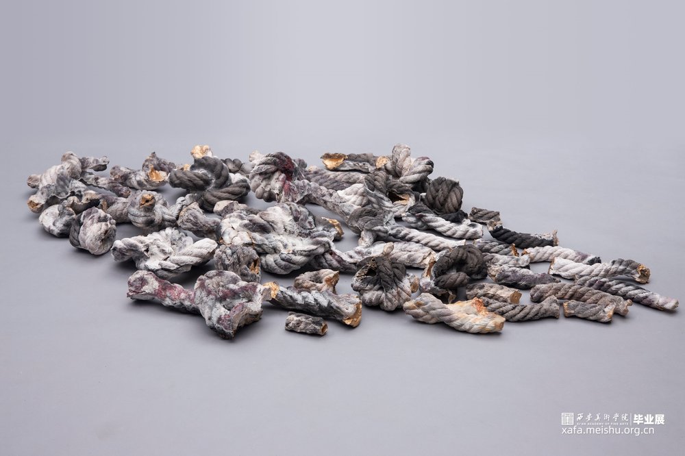 作品的灵感来源于自身面对世俗的压力和痛苦时而产生的心结;【结】是烦恼的别名,因烦恼能结缚众生;所以也称【结使】,结使也是烦恼的异称—烦恼缠缚众生,无法出离生死,故称结;驱役而恼乱众生,故称始;无数的心结缠绕 ,就是痛苦的根源。作品采用了熏烧,火的痕迹和试剂在结上产生的斑驳也呼应了我内心的痛苦。而采取螺旋网状的形式,它如心结缠缚,就像北宋张先诗中所诉:“心似双丝网,中有千千结”。