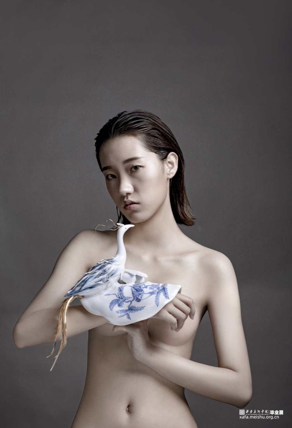 作品灵感来源于雍正时期粉彩团蝶碗,明永乐青花枇杷绶带鸟纹盘,磁州窑白地黑花鱼藻纹盆。在它们原有的造型基础上根据身体形状变形,再将其上原有的花纹立体化,加入金属部件,从而得来的陶瓷综合材料作品。