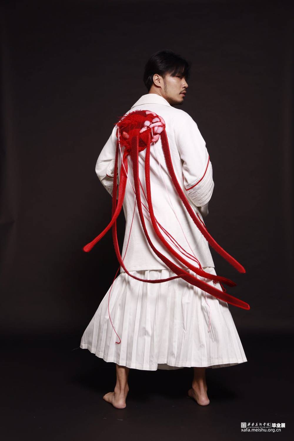 用白色全棉贡缎制作褶皱。我用到红色在褶皱上挑出,突出结构的分割也用来象征着胡人奋勇守护家园换来的伤口。在面料再造方面我用纱,羊羔绒,滩羊毛长毛绒,孔雀绒,棉线,填充棉做材料,绘制伤口流血的图样,将材料进行组合深浅交叉,这是他们奋斗过的勋章。