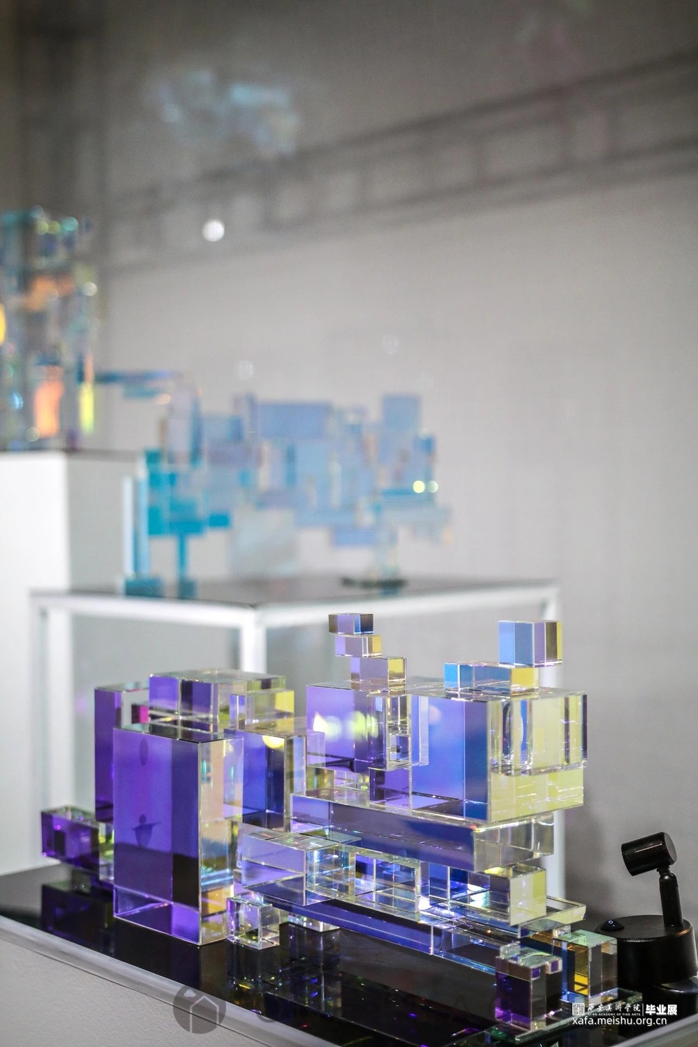 此作品由五件水晶块装置组成,表现形式为将灵感图案与抽象结合,保留大动态的前提下做了一些变形处理。创作形象为在校期间参与救助、收养流浪猫时观察到的各类动态。近距离接触小动物,感受到这些小家伙的脆弱程度就同材料选取的水晶一般,外观通透纯净,材质坚韧但又十分脆弱。