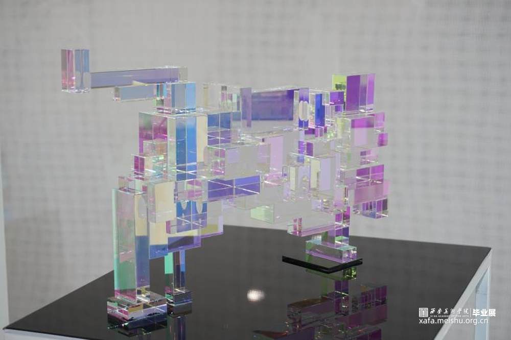 此作品的创作形象为在校期间参与救助、收养流浪猫时观察到的各类动态。近距离接触小动物,我感受到这些小家伙面对陌生人不掩饰的警惕,而后在感受到善意的主动上前示好的纯净情感。在外长期流浪求生的坚韧,却又会因为一道小伤口抑或误食异物得不到及时救治恶化倒下的脆弱身躯。就与水晶一般外观通透纯净,材质坚韧但又十分脆弱。表现形式为将灵感图案与抽象结合,保留大动态的前提下做了一些变形处理。