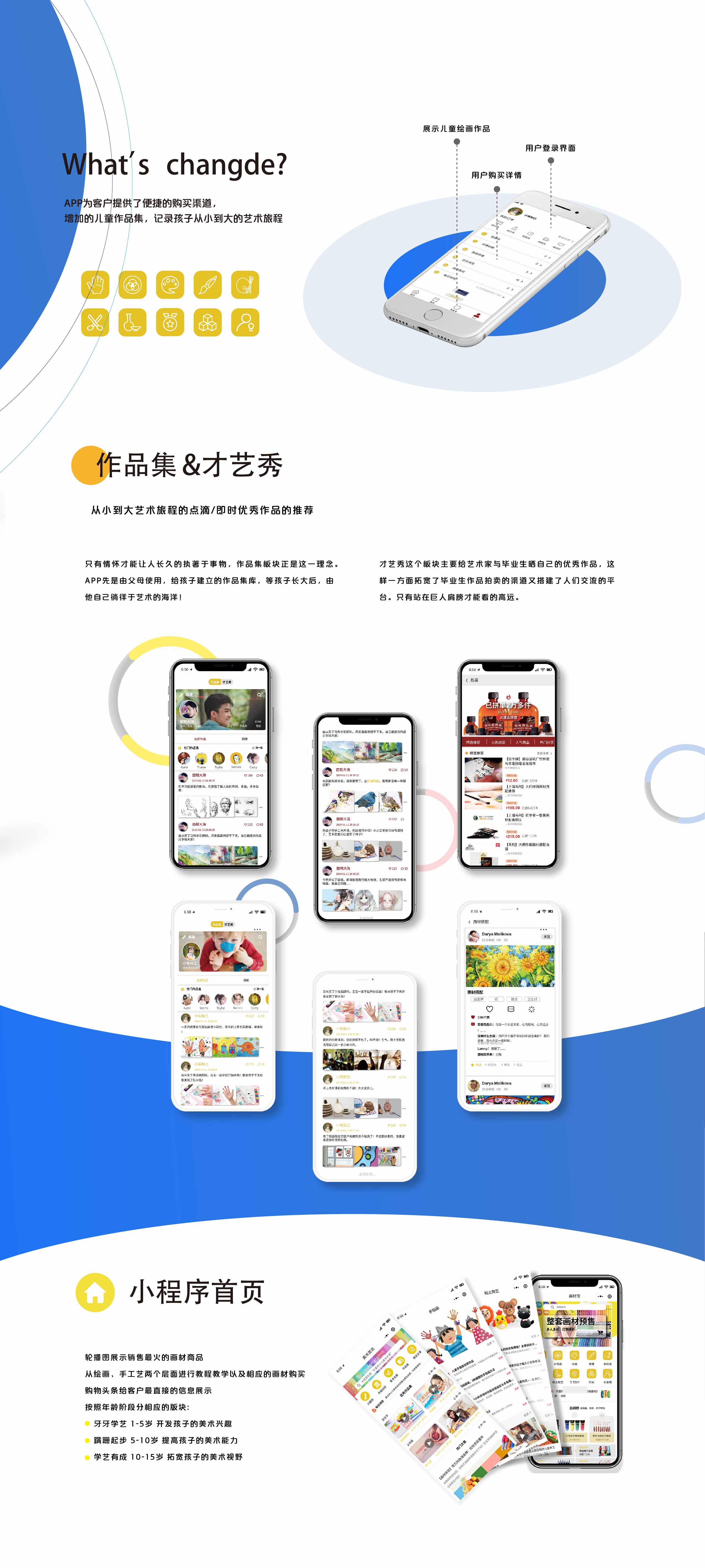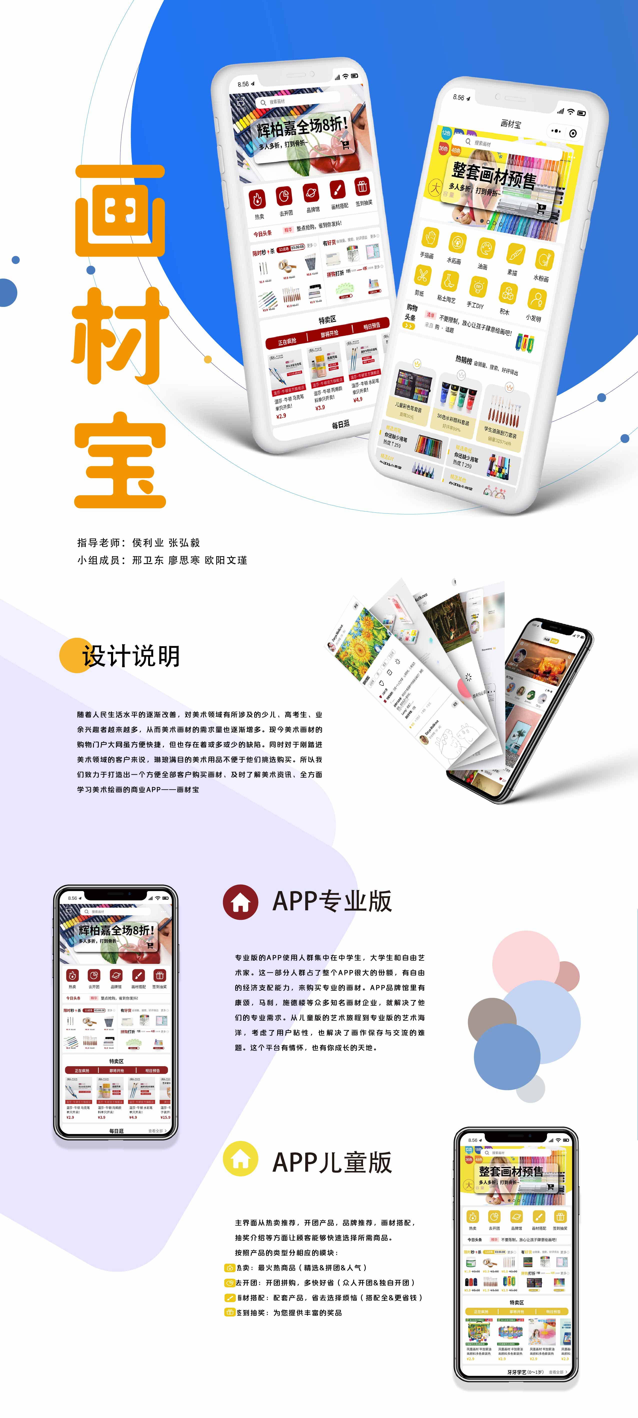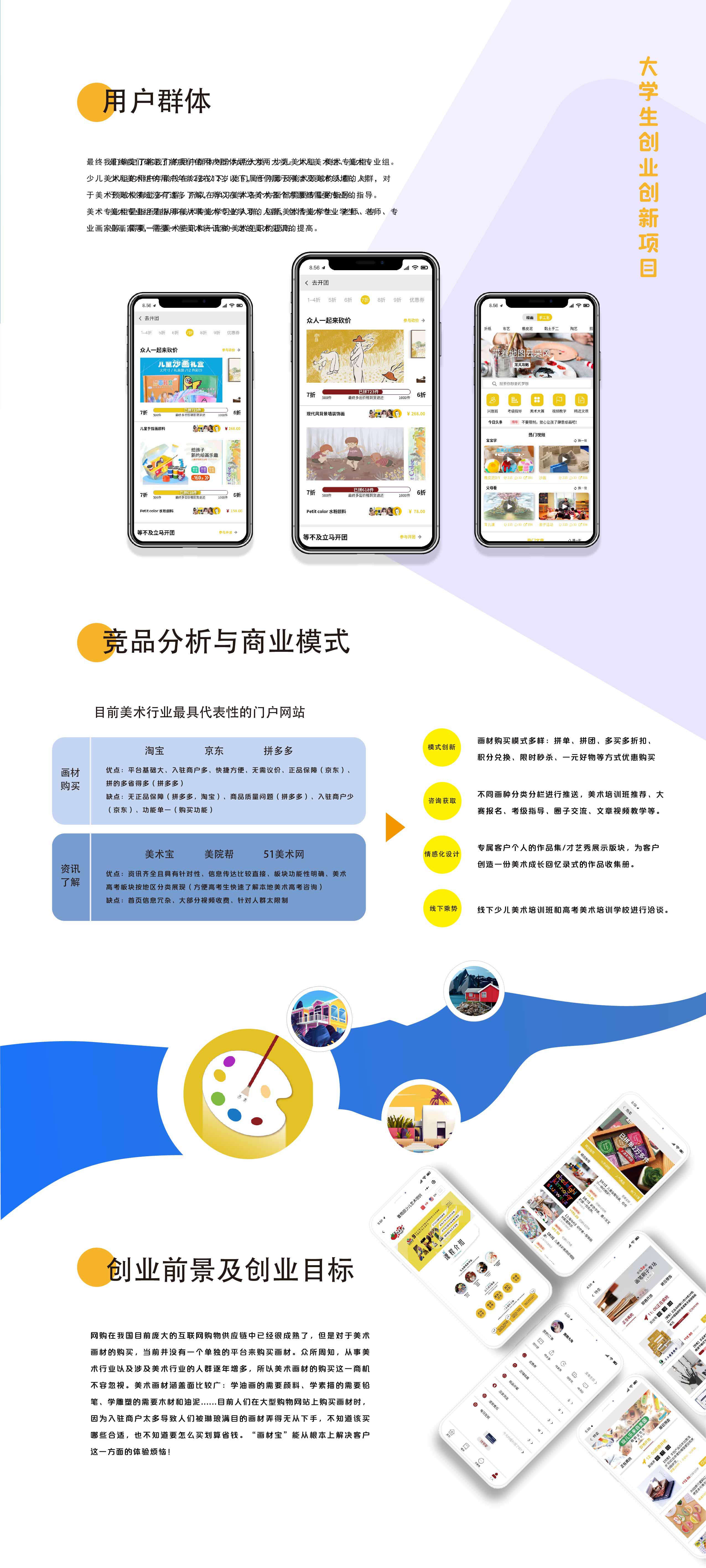 作者:邢卫东 廖思涵 欧阳文瑾 导师:侯利业 简介:通过画材宝小程序及APP产品的实现,填补我国绘画市场在画材购买,及资讯获取方面的空白。做出一款真正服务于大众,便利于从事美术工作者且具有极好商业价值的产品。
